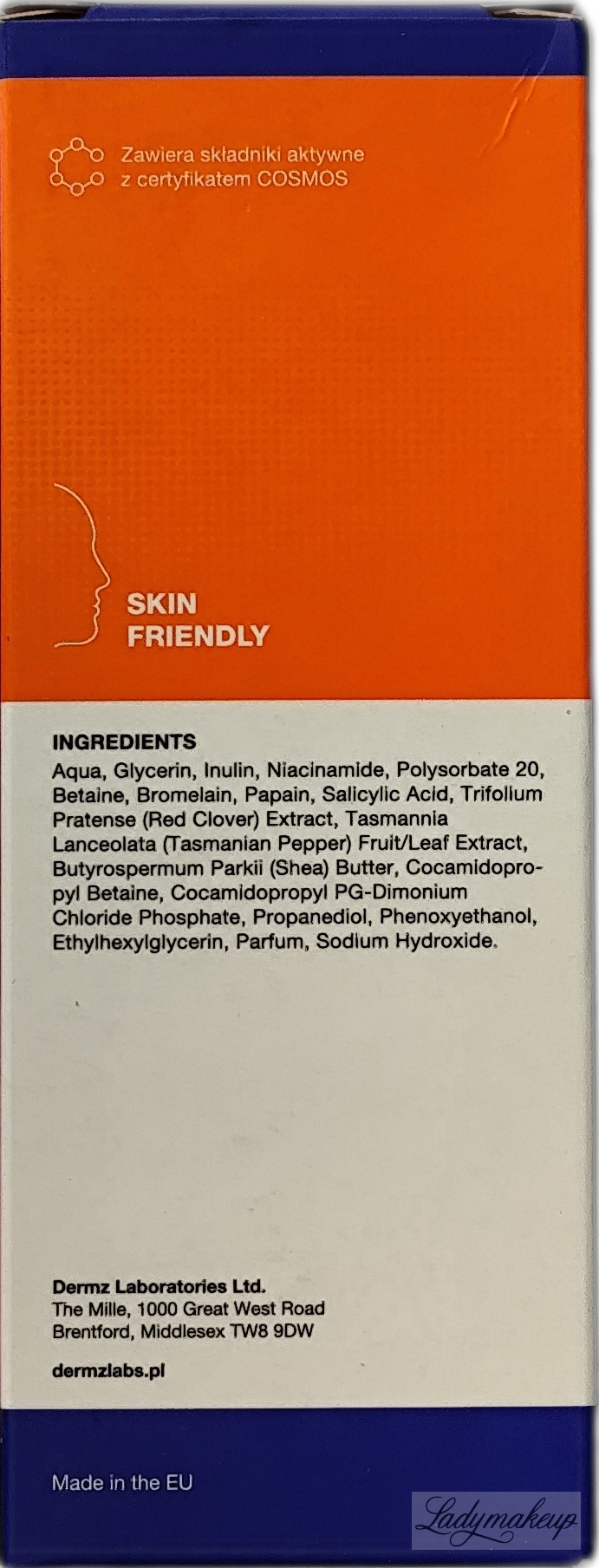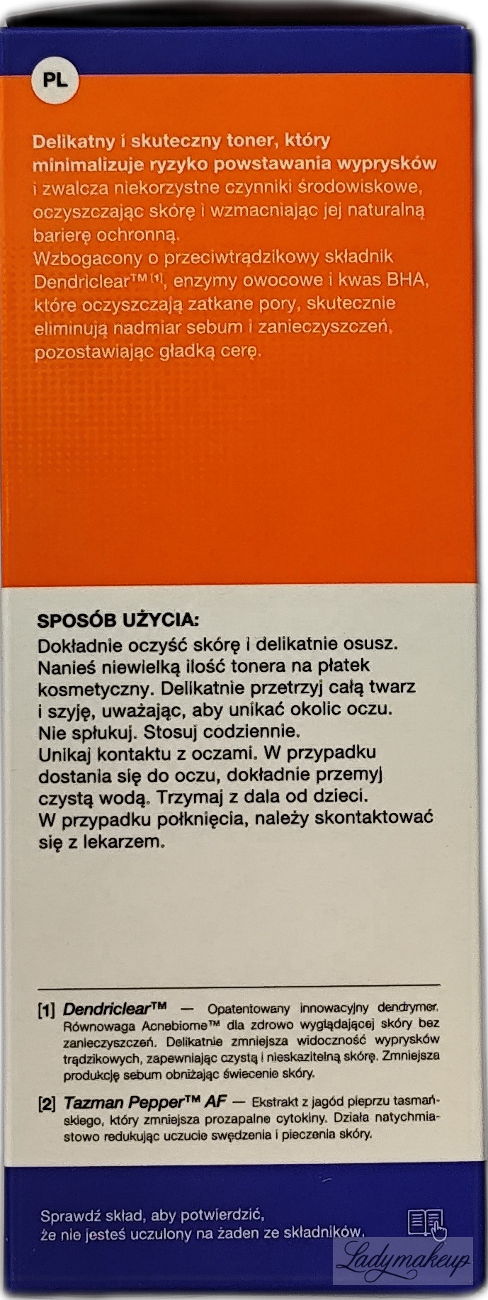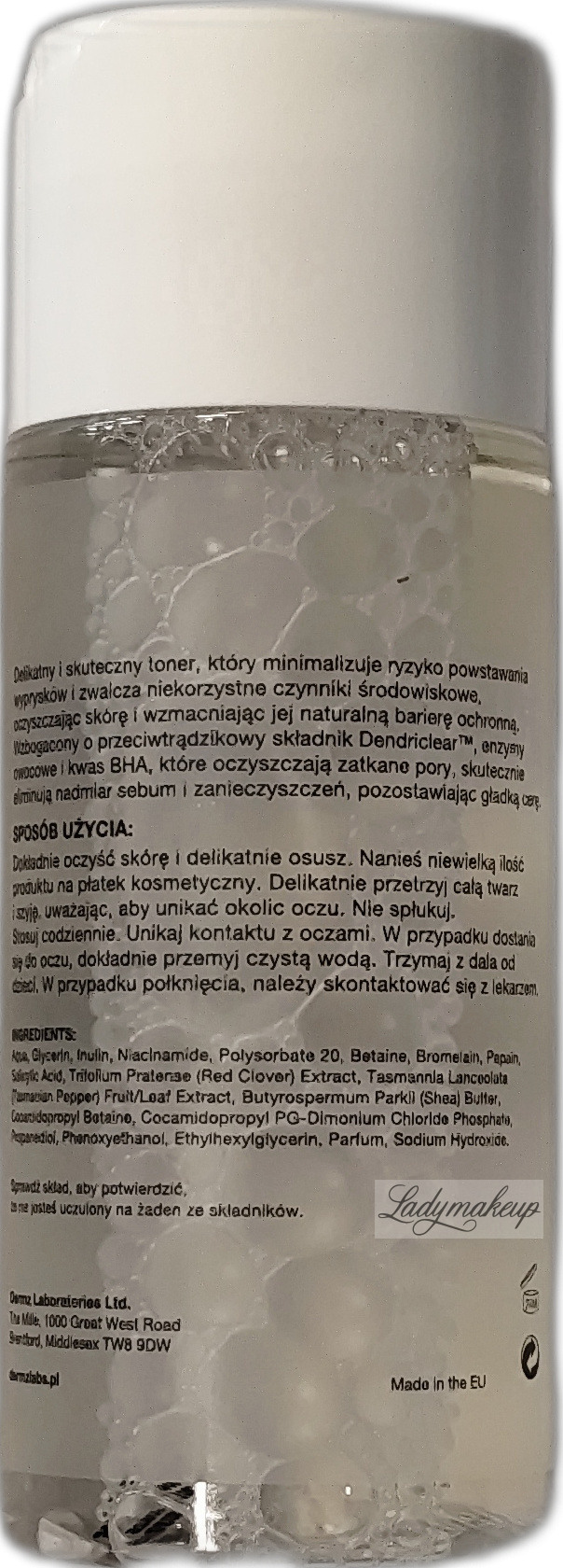 Tonik do twarzy. Jest w 100% wegańska i w 98,4% zawiera składniki pochodzenia naturalnego. Przeznaczona do codziennej pielęgnacji skóry trądzikowej, tłustej oraz mieszanej. Dermz tonik wzbogacony został o takie składniki aktywne jak: niacynamid, kwas salicylowy, ekstrakt z czerwonej koniczyny oraz kompleksy Dendriclear, SalSphere Even Skin oraz TazmanPepper AF. Tonik Dermz dokładnie oczyszcza pory skóry z zanieczyszczeń, redukując zaskórniki oraz zmniejszając niedoskonałości. Delikatnie złuszcza martwy naskórek, wyrównuje koloryt, a także poprawia teksturę skóry. Dodatkowo Dermz tonik widocznie wygładza oraz odświeża skórę. Regularnie stosowany reguluje nadprodukcję sebum. Dostępny jest w opakowaniu o pojemności 150 ml.
