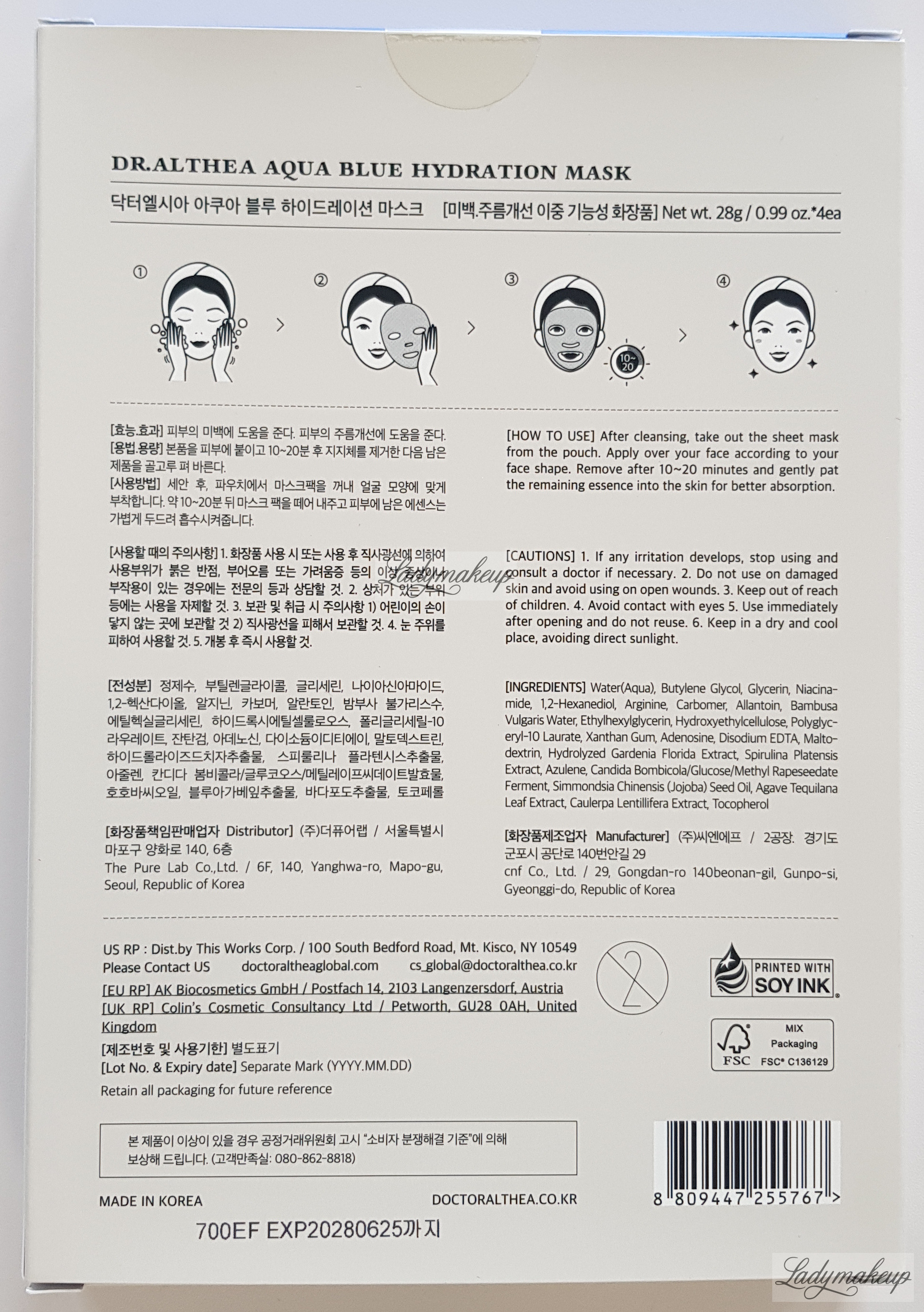 Zestaw masek. Składa się z 4 sztuk maseczek wykonanych z miękkiego płatu materiału, który dobrze przylega do twarzy. Nasączone zostały takimi składnikami aktywnymi jak: woda bambusowa, azulen i spirulina oraz woda z niebieskiej agawy. Maseczki Dr. Althea doskonale sprawdzą się do pielęgnacji skóry suchej oraz przesuszonej i wrażliwej. Skutecznie łagodzi oraz koi podrażnienia naskórka, pomaga złagodzić obrzęki, a także zapewnia efekt 24 godzinnego nawilżenia i nawodnienia. Dodatkowo Dr. Althea maseczki działają przeciwstarzeniowo. W opakowaniu znajdują się 4 sztuki maseczek, każda zapakowana w osobną saszetkę przez co można stosować je w dogodnym dla siebie czasie.