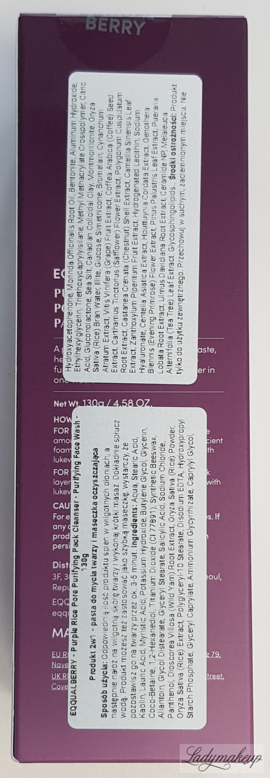 Pasta do twarzy. Polecana do pielęgnacji skóry tłustej, problematycznej oraz z zaskórnikami. Swoje działanie opiera na bazie specjalnie wyselekcjonowanych składników aktywnych takich jak: kompleks ryżowy, 6 rodzajów glinek, bromelanina, kwas salicylowy oraz glukonolaktan. Pasta Eqqualberry delikatnie złuszcza martwy naskórek, dogłębnie oczyszcza skórę z nadmiaru sebum i zanieczyszczeń, widocznie zwęża rozszerzone pory skóry, wspomaga redukcję niedoskonałości i zaskórników otwartych, a także reguluje nadprodukcję sebum. Regularnie stosowana Eqqualberry pasta rozjaśnia przebarwienia oraz działa antyoksydacyjnie i przeciwstarzeniowo. Kosmetyk dostępny jest w opakowaniu o pojemności 130 g.