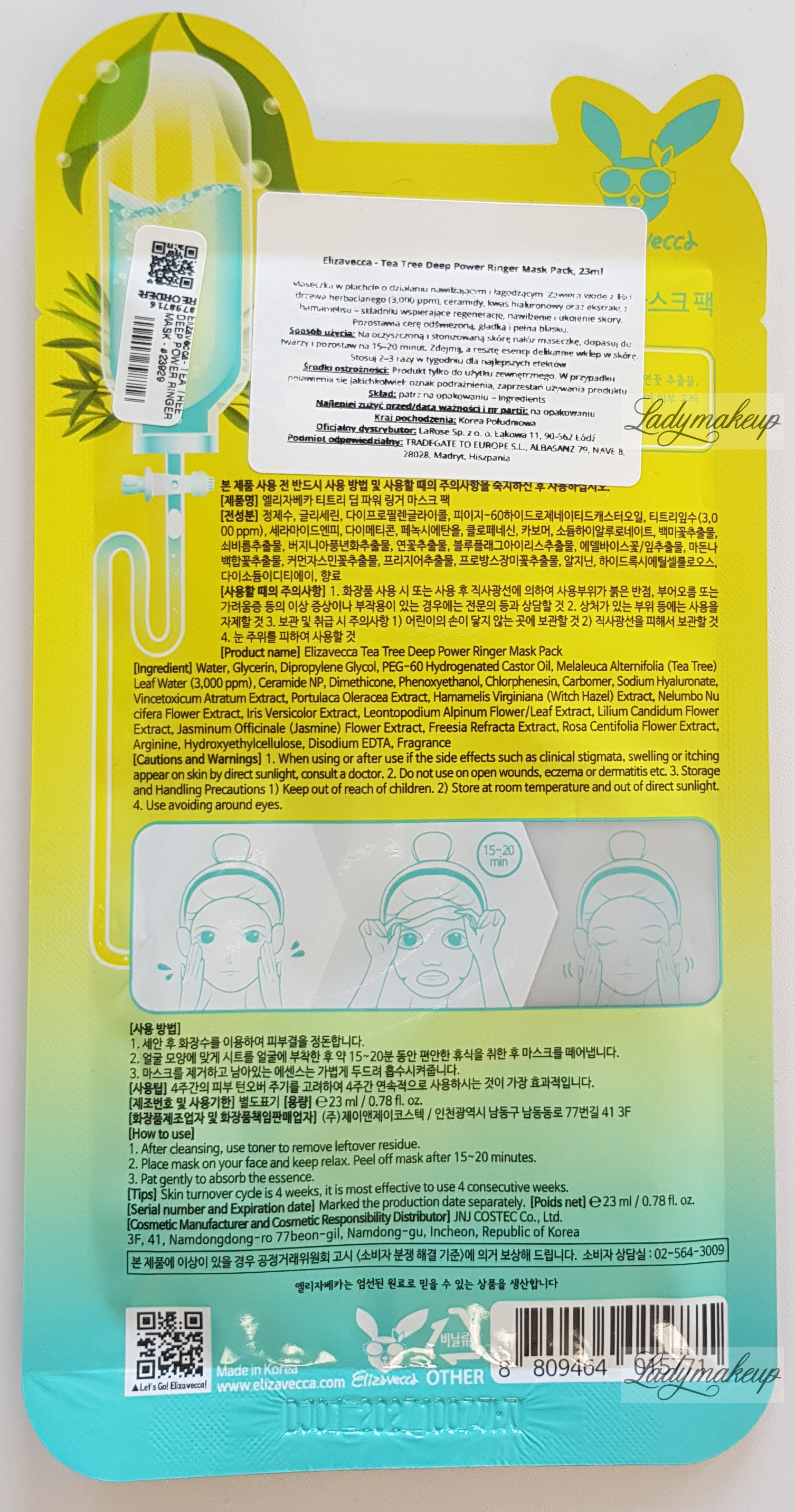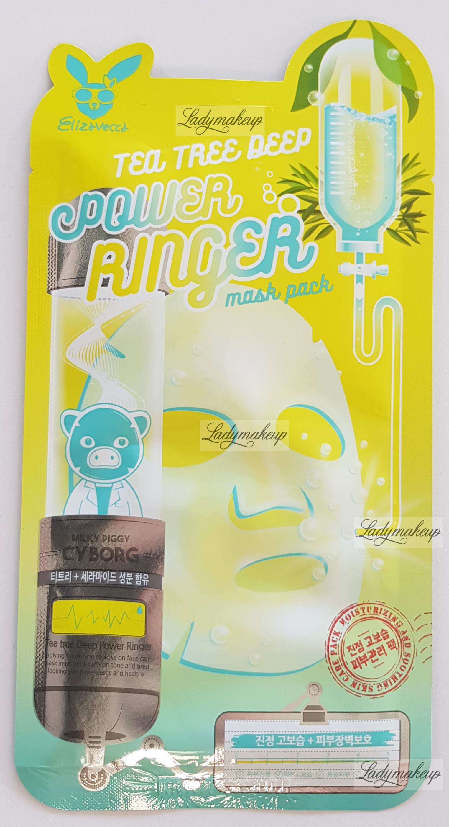 Maska do twarzy. Doskonale sprawdzi się podczas pielęgnacji skóry tłustej, mieszanej oraz trądzikowej. Umieszczona została na miękkim płacie silnie nasączonym dobroczynną esencją, w skład której wchodzą takie składniki aktywne jak: woda z drzewa herbacianego, arginina, adenozyna, hialuronian sodu oraz ekstrakt z oczaru wirginijskiego. Maska Elizavecca błyskawicznie łagodzi oraz koi wszelkie podrażnienia, intensywnie nawilża, widocznie wygładza oraz reguluje proces produkcji sebum. Ponadto działa przeciwzmarszczkowo, przeciwzapalnie i bakteriobójczo. W opakowaniu znajduje się 1 maseczka.