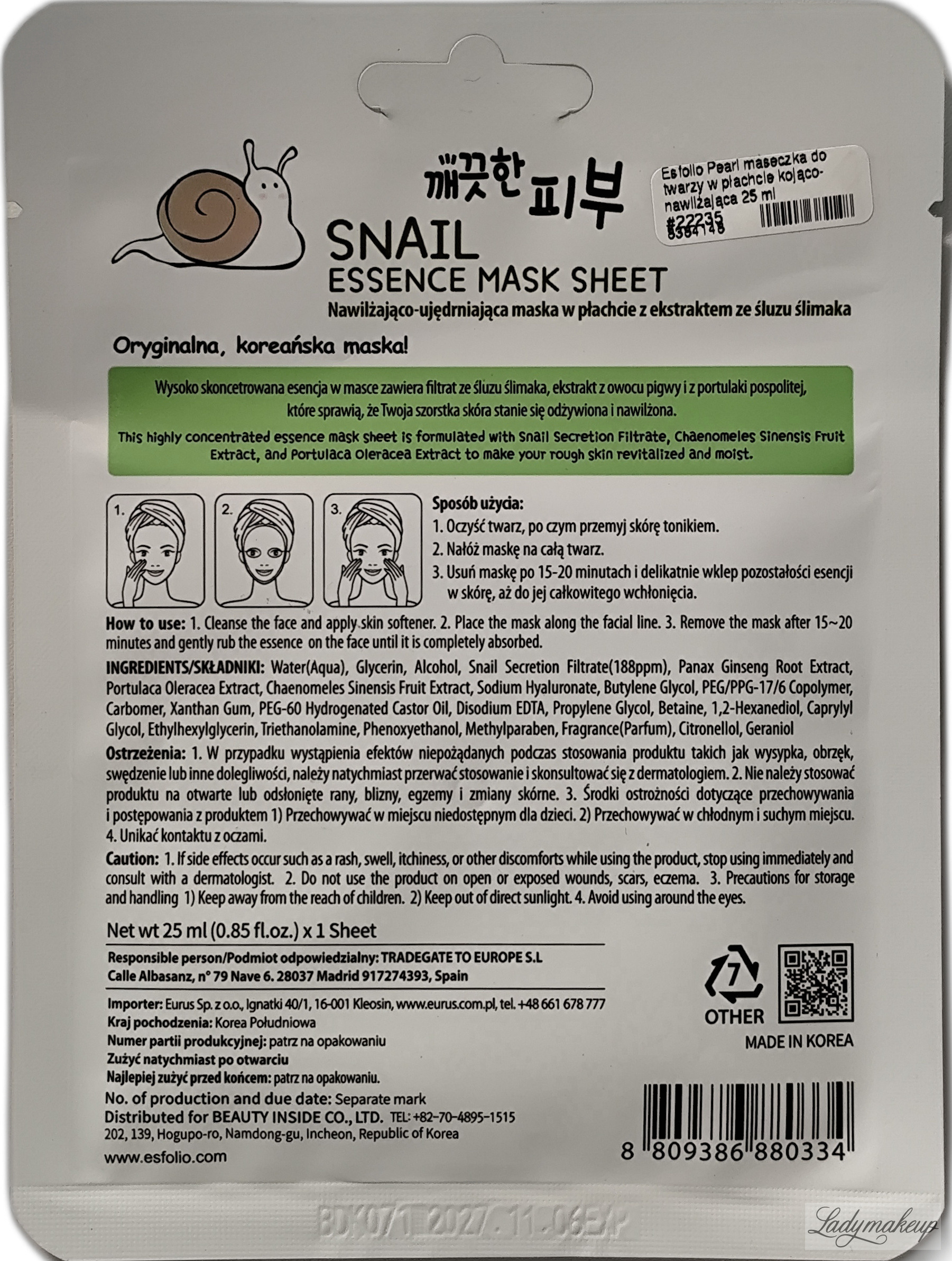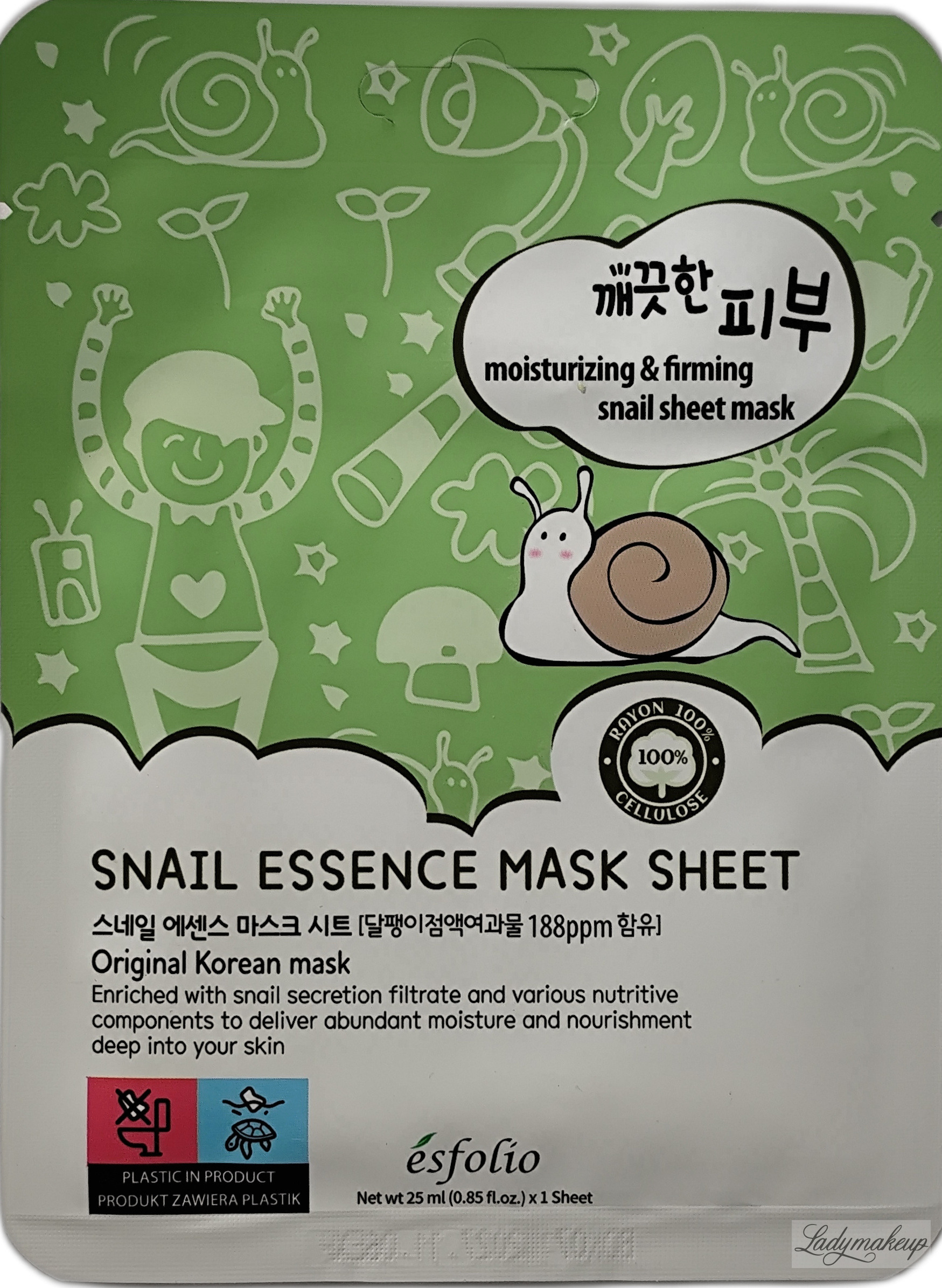 Maska w płacie. Ukierunkowana do pielęgnacji skóry każdego rodzaju. Zawiera w sobie specjalnie wyselekcjonowane składniki aktywne takie jak: filtrat ze śluzu ślimaka, ekstrakt z portulaki, wyciąg z żęń-sznia oraz kwas hialuronowy. Maska Esfolio intensywnie nawilża, dzięki czemu skóra jest przyjemnie miękka oraz gładka w dotyku. Skutecznie pobudza skórę do szybszej regeneracji i odbudowy, a także łagodzi i koi stany zapalne. Ponadto spowalnia procesy starzenia się naskórka, a także Esfolio maska na twarz działa przeciwzapalnie, rozjaśniająco, antyoksydacyjnie i ujędrniająco. W opakowaniu znajduje się 1 sztuka maseczki.