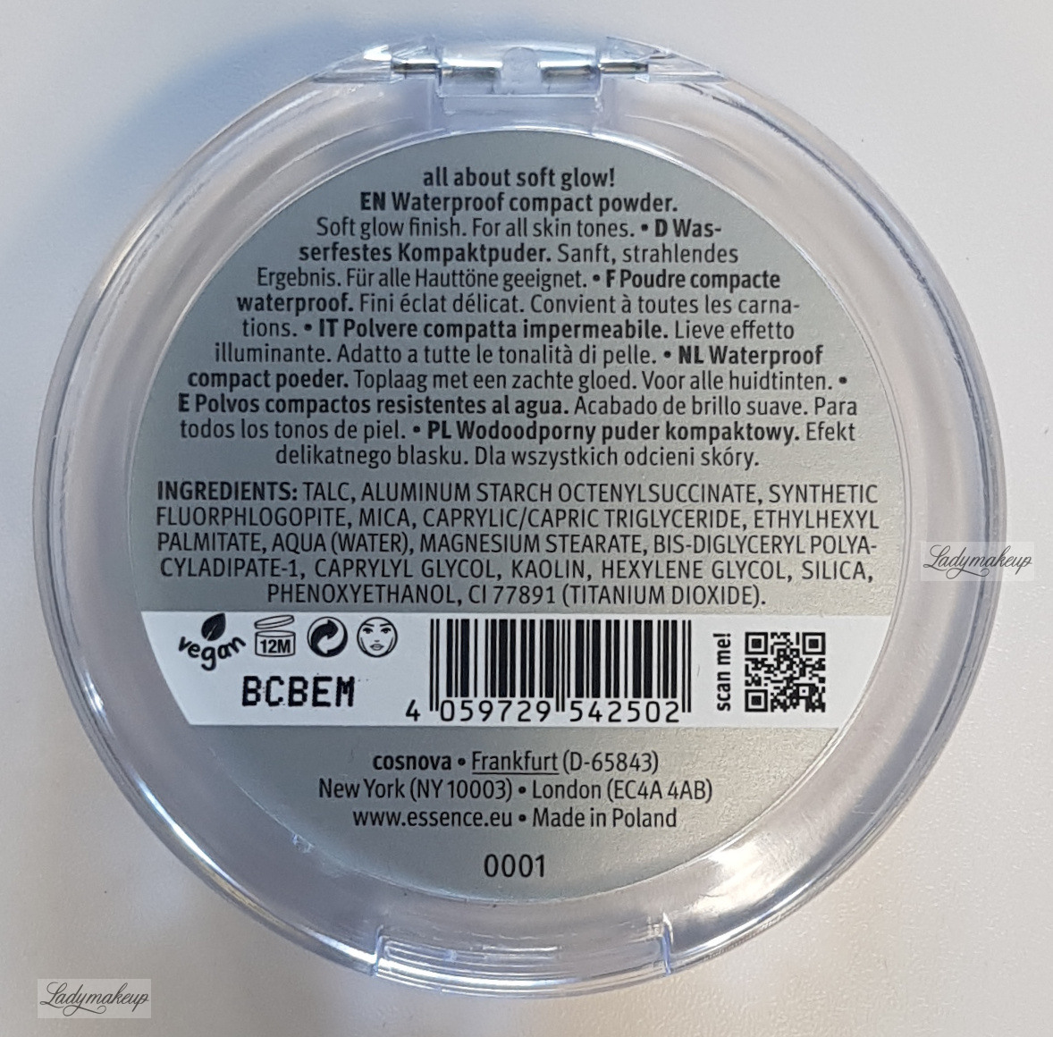 Puder do twarzy. Jest w 100% wegański. Posiada delikatną, dobrze zmieloną, prasowaną formułę, która jest przyjemnie lekka. Nie podkreśla rozszerzonych porów i zmarszczek, a także jest niezwykle komfortowa podczas noszenia. Puder Essence przedłuża trwałość całego makijażu, a także pozostawia na skórze jedwabiste wykończenie o naturalnym, subtelnym blasku. Essence puder posiada transparentny odcień, który dopasowuje się do każdej karnacji. Dodatkowo jest on odporny na działanie wody, dzięki czemu idealnie sprawdzi się w każdych warunkach. Kosmetyk nie zawiera w sobie parabenów, olejów, alkoholu czy substancji zapachowych. Produkt dostępny jest w solidnym plastikowym opakowaniu o pojemności 8 g.