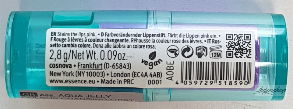 Pomadka do ust Jest w 100% wegańska i nietestowana na zwierzętach. Powstała na bazie innowacyjnej formuły reagującej na naturalne pH skóry, dzięki czemu zmienia swój kolor po nałożeniu, dając spersonalizowany i indywidualny odcień. Pozostawia na ustach lekką różową barwę z lekkim połyskiem. Pomadka Essence ma unikalny kształt oraz turkusową barwę (która zmienia się na róż), która w połączeniu z brokatowymi drobinkami cudnie rozświetla naskórek. Essence pomadka jest bardzo łatwa w aplikacji oraz komfortowa podczas noszenia nawet przez długie godziny w ciągu dnia. Dostępna o gramaturze 2,8 g. Nie zawiera w sobie parabenów, olejów oraz glutenu.