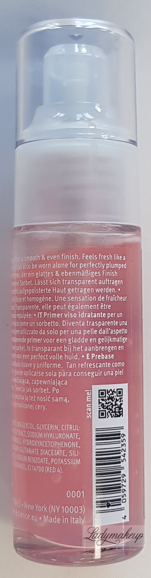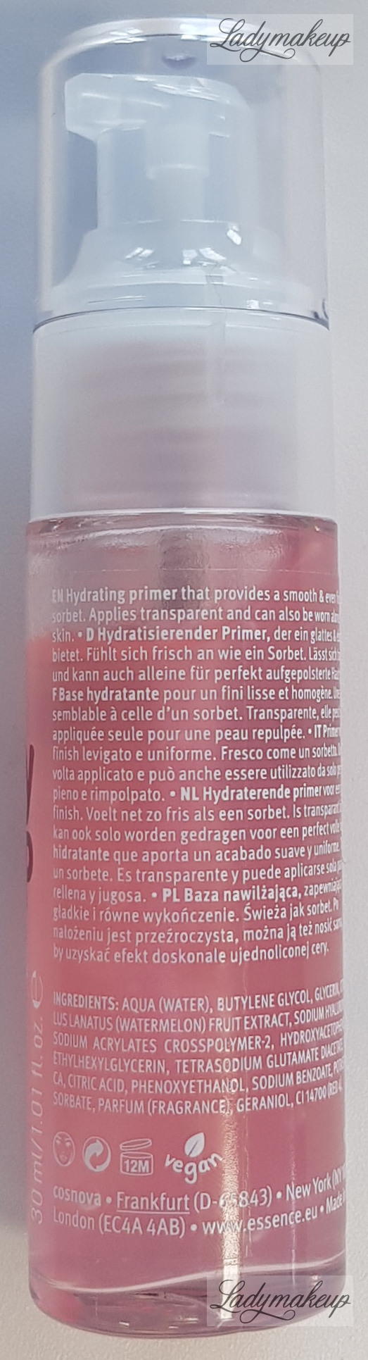 Baza pod makijaż. Do pielęgnacji skóry każdego rodzaju. Jest w 100% wegańska. Posiada żelową formułę, przypominającą w swojej konsystencji sorbet. Baza Essence skutecznie przygotowuje skórę przed nałożeniem makijażu. Kosmetyk przyjemnie chłodzi, dogłębnie i długotrwale nawilża, łagodzi podrażnienia, a także wygładza naskórek. Regularnie stosowana Essence baza sprawia, że skóra jest bardziej sprężysta oraz zyskuje promiennego blasku. Kosmetyk posiada kuszący arbuzowy kolor, a także ma również taki sam przyjemny zapach arbuza. Dostępny jest w butelce o pojemności 30 ml, z pompką dozującą odpowiednią ilość produktu. W swojej formule nie zawiera parabenów, glutenu, alkoholu oraz oleju.