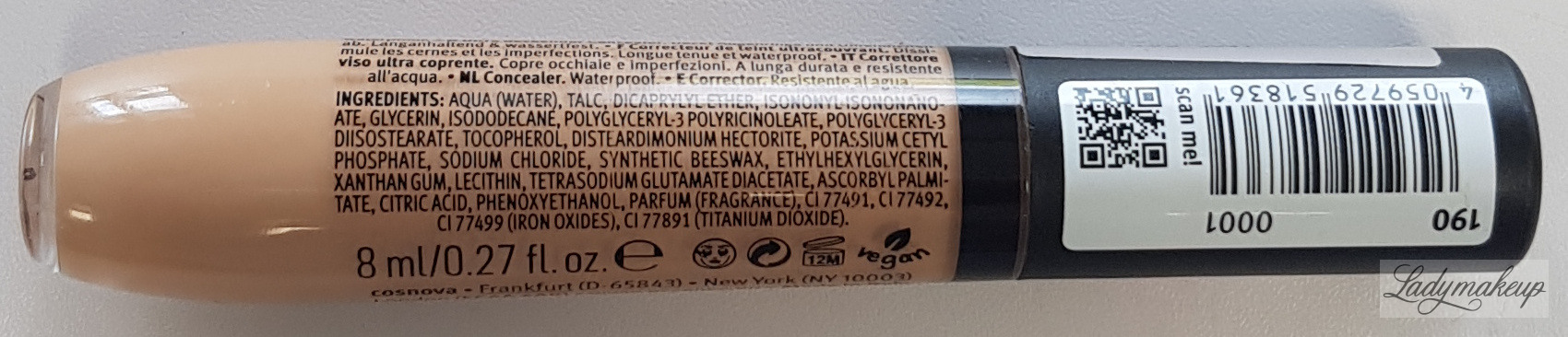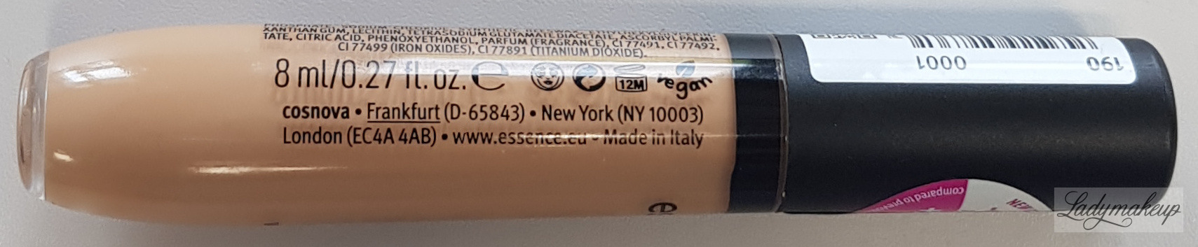 Korektor do twarzy. Jest w 100% wegański. Posiada ultra lekką płynną formułę, która dobrze aplikuje się na skórę. Dodatkowo zapewnia efekt niezwykle mocnego krycia o matowym wykończeniu. W szybki sposób zniweluje cienie pod oczami oraz zakryje wszelkie niedoskonałości, przebarwienia czy tatuaże. Dodatkowo korektor Essence idealnie stapia się z cerą i równomiernie rozprowadza, dając bardzo naturalne wykończenie. Dzięki wodoodpornej formule, sprawdzi się perfekcyjnie w każdej sytuacji bez względu na warunki pogodowe. Wygodny aplikator w kształcie łezki ułatwia nakładanie kosmetyku i dozuje odpowiednią ilość produktu. Essence korektor dostępny jest w opakowaniu o pojemności 8 ml.- Korektor w płynie.