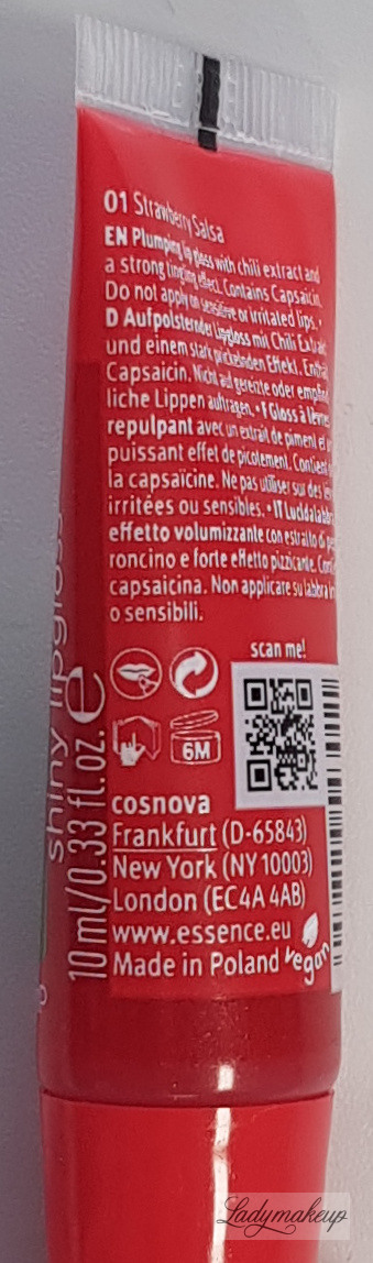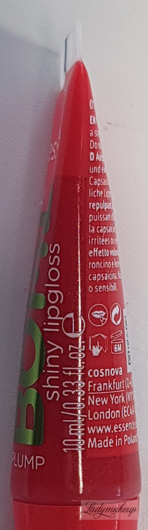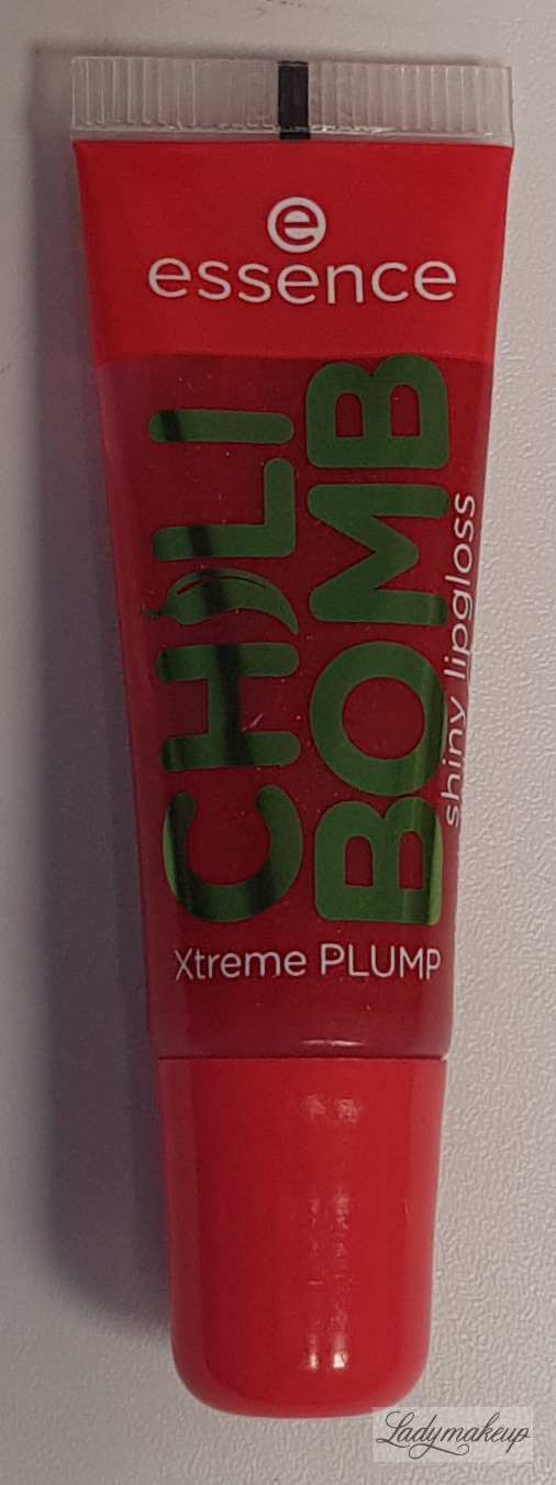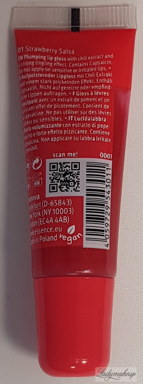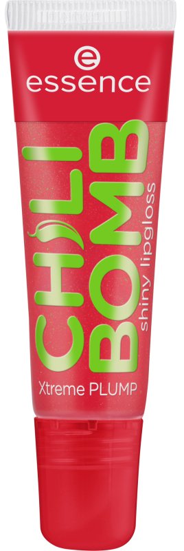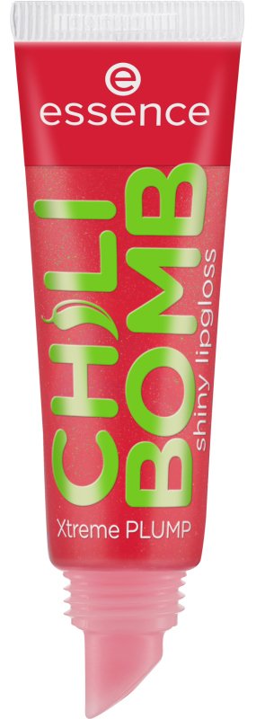 Błyszczyk do ust. Jest w 100% wegański. Posiada gęstą, nie klejącą się żelową formułę. Ma pół transparentną formułę o delikatnym odcieniu czerwieni, z dodatkiem brokatowych drobinek. Zawiera w sobie wyciąg z chili, który widocznie powiększa wargi. Po nałożeniu na skórę błyszczyk Essence lekko piecze oraz mrowi naskórek sprawiając, że usta są znacznie pełniejsze. Kosmetyk posiada kuszący, słodki zapach truskawek. Essence błyszczyk jest niezwykle komfortowy podczas noszenia. Dodatek błyszczących drobinek pięknie błyszczy w promieniach słońca i sztucznego światła. Kosmetyk nie zawiera w sobie parabenów oraz glutenu. Dostępny jest w poręcznej tubce o pojemności 10 ml.