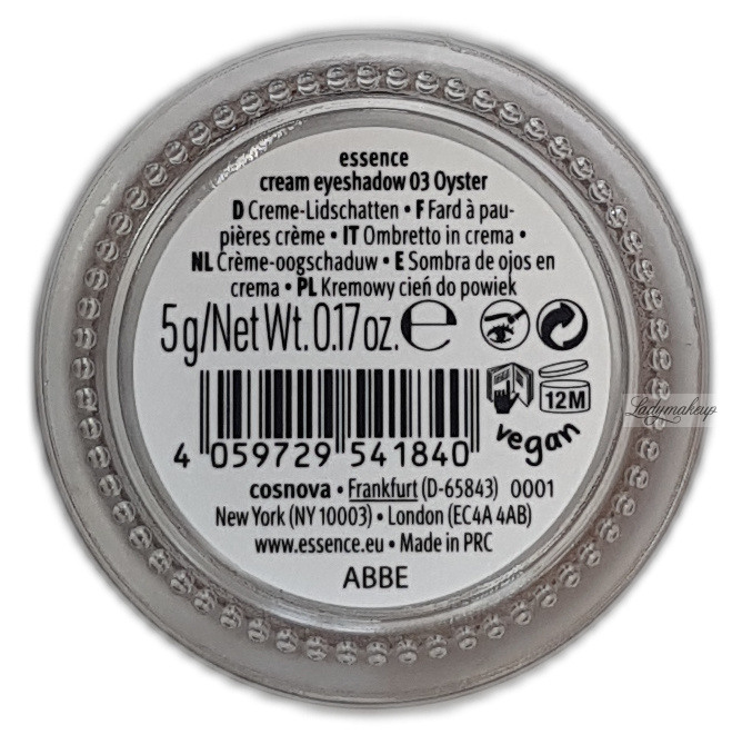 Cień do powiek. Jest w 100% wegański. Posiada miękką, kremową formułę, która gładko i równomiernie rozprowadza się na skórze. Zapewnia kuszące, metaliczne wykończenie z efektem glamour, nadając makijażowi wyjątkowego blasku. Charakteryzuje się wysoką pigmentacją, którą można z łatwością stopniować od subtelnego połysku po intensywny efekt. Cień Essence może być stosowany zarówno jako samodzielny produkt, bądź jako top na inne cienie. Ponadto bez problemu może być użyty na twarz, gdzie w zależności od odcienia jako rozświetlacz , bronzer czy rozświetlający róż. Dodatkowo Essence cień się nie osypuje oraz nie rozmazuje podczas noszenia. Kosmetyk dostępny jest w szklanym słoiczku o pojemności 5 g.