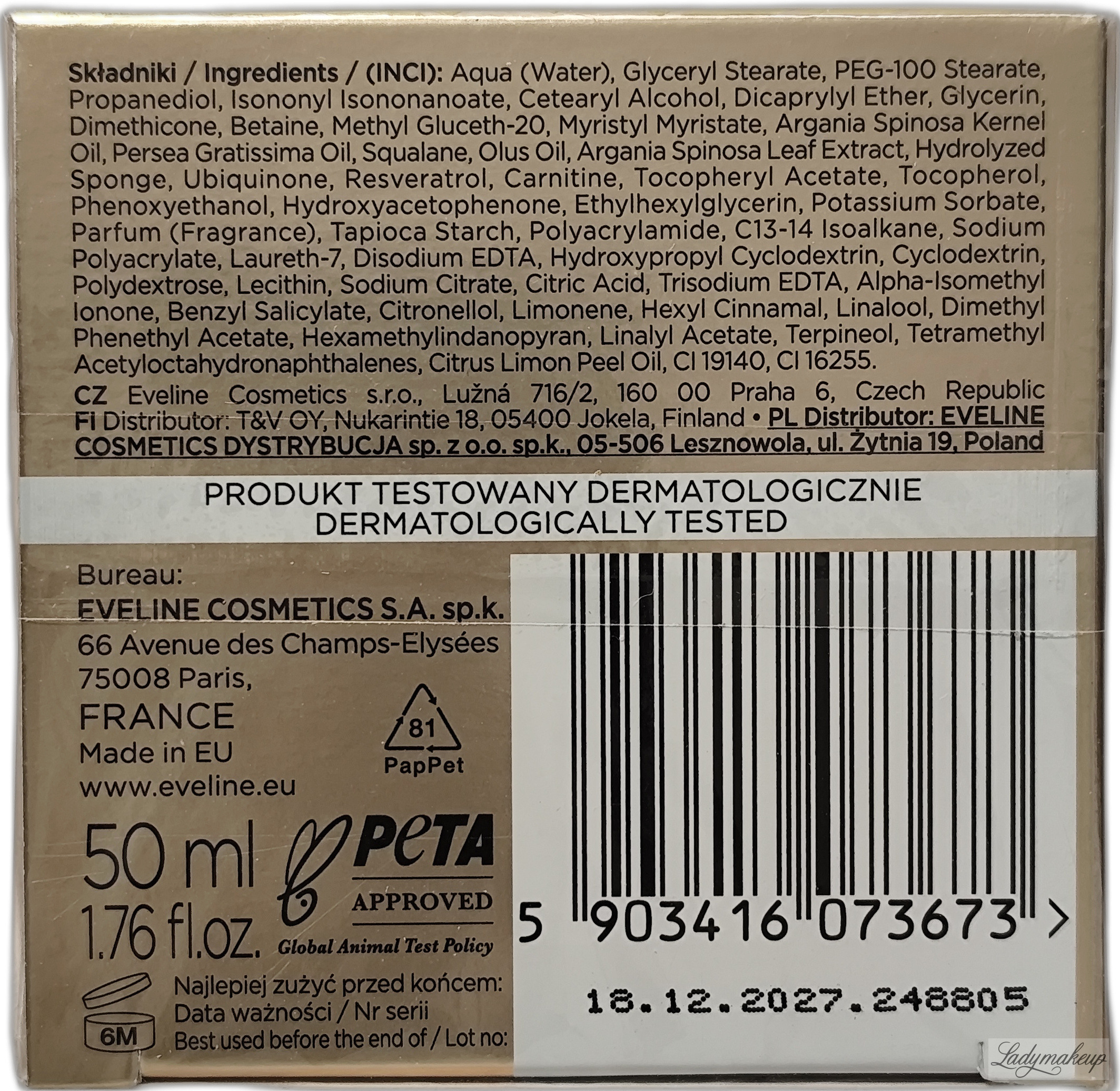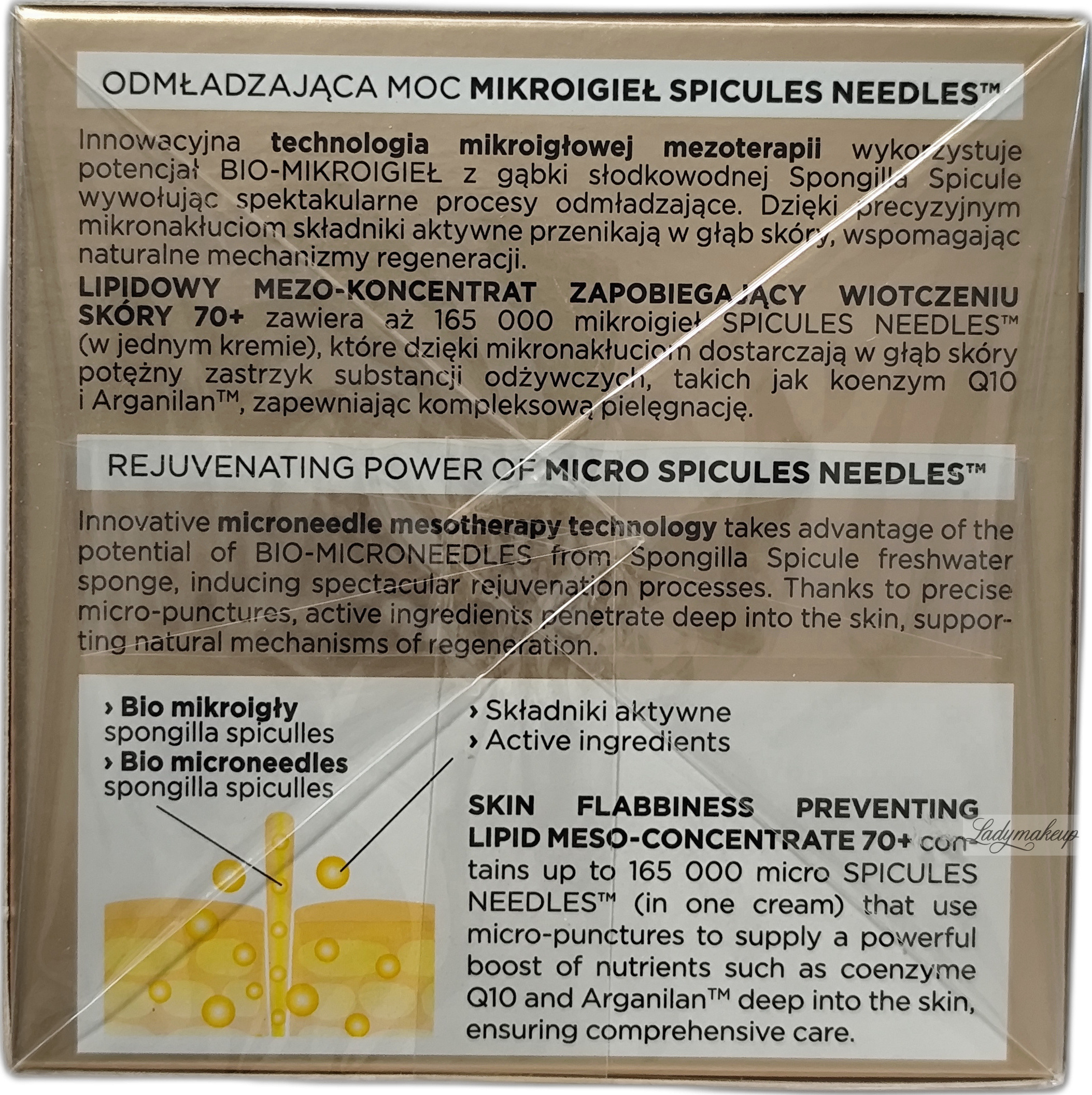 Krem do twarzy. Przeznaczony do codziennej rannej i wieczornej pielęgnacji skóry dojrzałej osób w wieku 70+. Posiada postać kremowego koncentratu z dodatkiem takich aktywnych składników jak: koenzym Q10, arganilan, skwalan i tapioka. Ponadto krem Eveline wyposażony został Spicules Needles™ czyli specjalne mikroigiełki w ilości 165 000, które dzięki delikatnym mikronakłuciom zapewniają znaczne lepsze wchłanianie się pielęgnacyjnych składników. Regularnie stosowany Eveline krem przywraca skórze uczucie komfortu, poprawia napięcie i sprężystość skóry, a także widocznie zapobiega wiotczeniu skóry. Dodatkowo koncentrat dogłębnie nawilża, dobrze odżywia oraz wzmacnia naskórek. Dostępny jest o pojemności 50 ml.