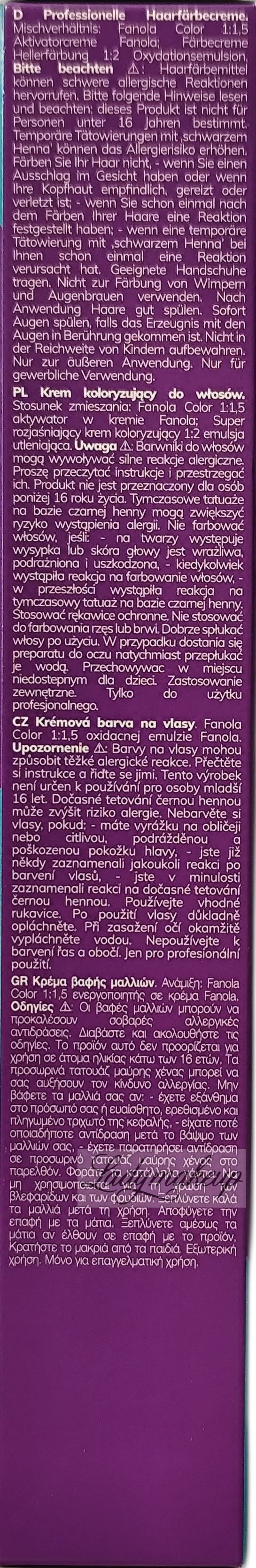 Stosować rękawice ochronne. Nie stosować do farbowania rzęs lub brwi. Dobrze spłukać włosy po użyciu. W przypadku dostania się preparatu do oczu natychmiast przepłukać je wodą. Przechowywać w miejscu niedostępnym dla dzieci. Zastosowanie zewnętrzne. Tylko do użytku profesjonalnego.