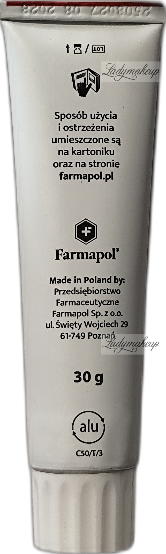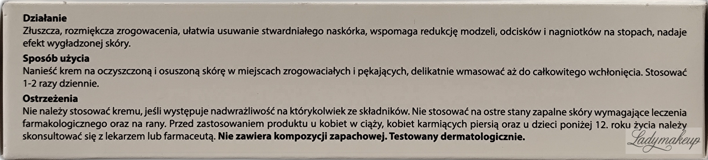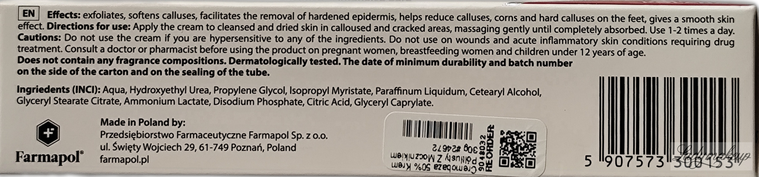 Krem na zrogowacenia. Przeznaczony do punktowej pielęgnacji skóry każdego rodzaju na piętach, stopach, łokciach oraz kolanach. W swoim składzie zawiera 50% pochodną mocznika, która jest niezalecana dla delikatnej skóry twarzy. Krem Farmapol po nałożeniu złuszcza martwy naskórek oraz pomaga pozbyć się wszelkich zrogowaceń oraz zgrubień. Regularnie stosowany widocznie zmiękcza oraz wygładza naskórek. Krem był przetestowany dermatologicznie oraz nie zawiera substancji zapachowych. Dostępny jest w poręcznej tubce o pojemności 30 g.