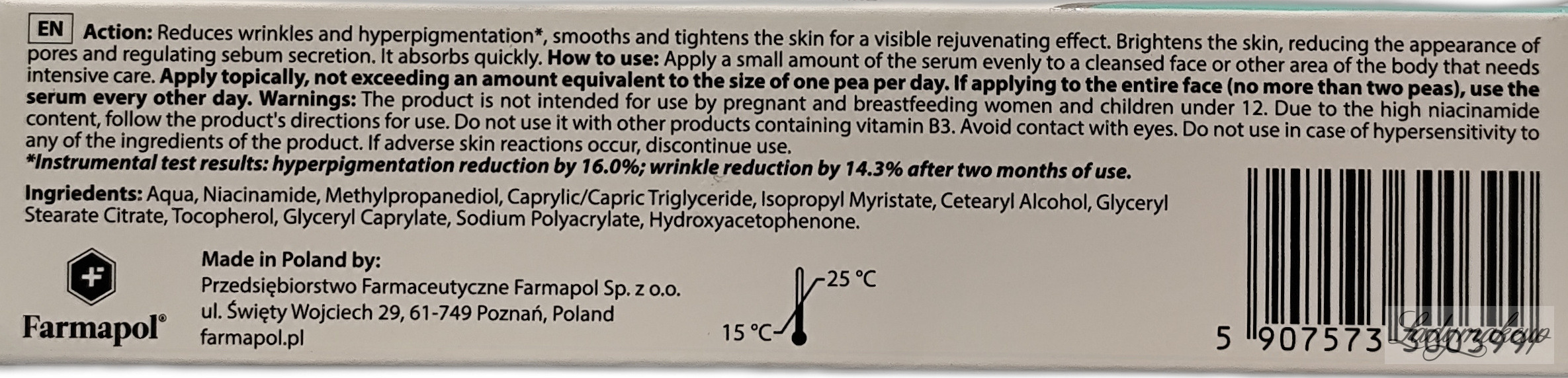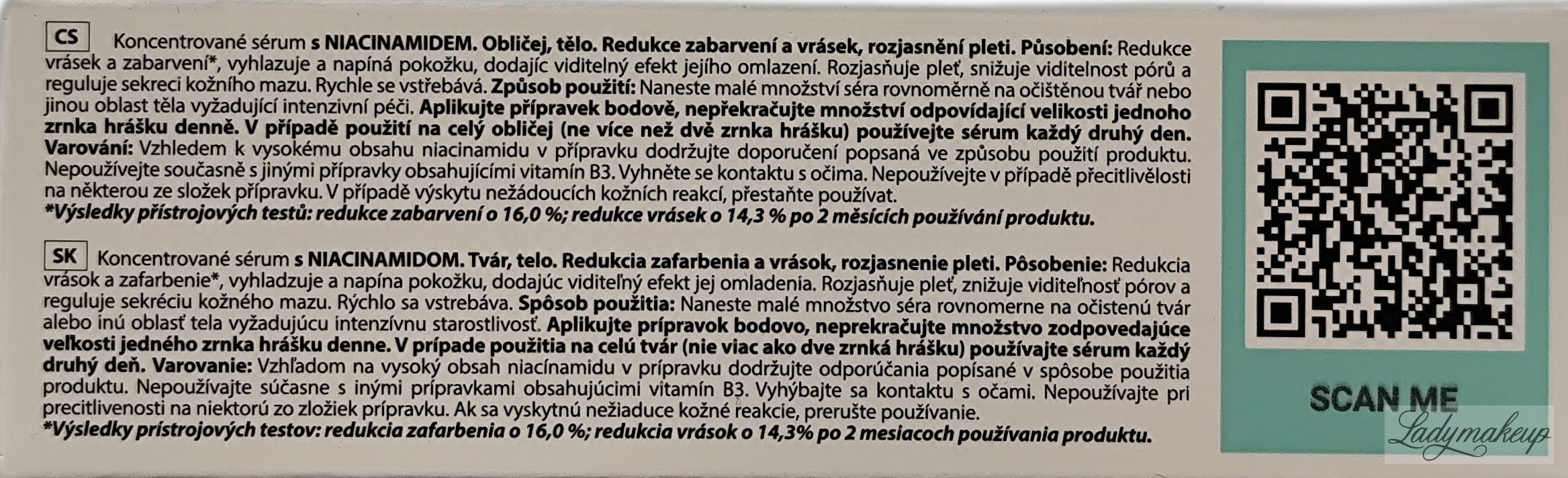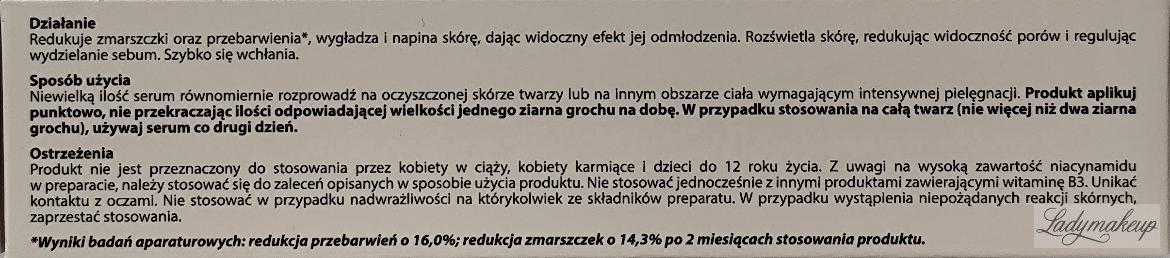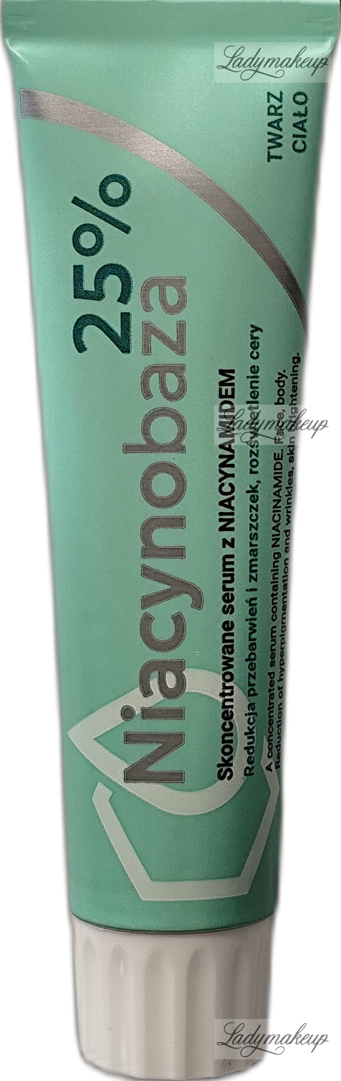 Serum do twarzy i ciała. Polecana jest do pielęgnacji skóry mieszanej, tłustej, problematycznej oraz dojrzałej, z przebarwieniami oraz o nierównym kolorycie. Posiada silnie skoncentrowaną formułę na bazie witaminy B3 (niacynamid) 25%. Widocznie redukuje zmarszczki, niweluje przebarwienia, a także zmniejsza widoczność porów. Dodatkowo redukuje ilość wydzielanego sebum, poprawia jędrność i elastyczność skóry, a także pięknie rozświetla, wygładza oraz poprawia kondycję cery. Serum ma lekką konsystencję oraz szybko się wchłania, a przy tym nie pozostawia po sobie tłustego filmu. Produkt dostępny jest w poręcznej tubce o pojemności 30 g.