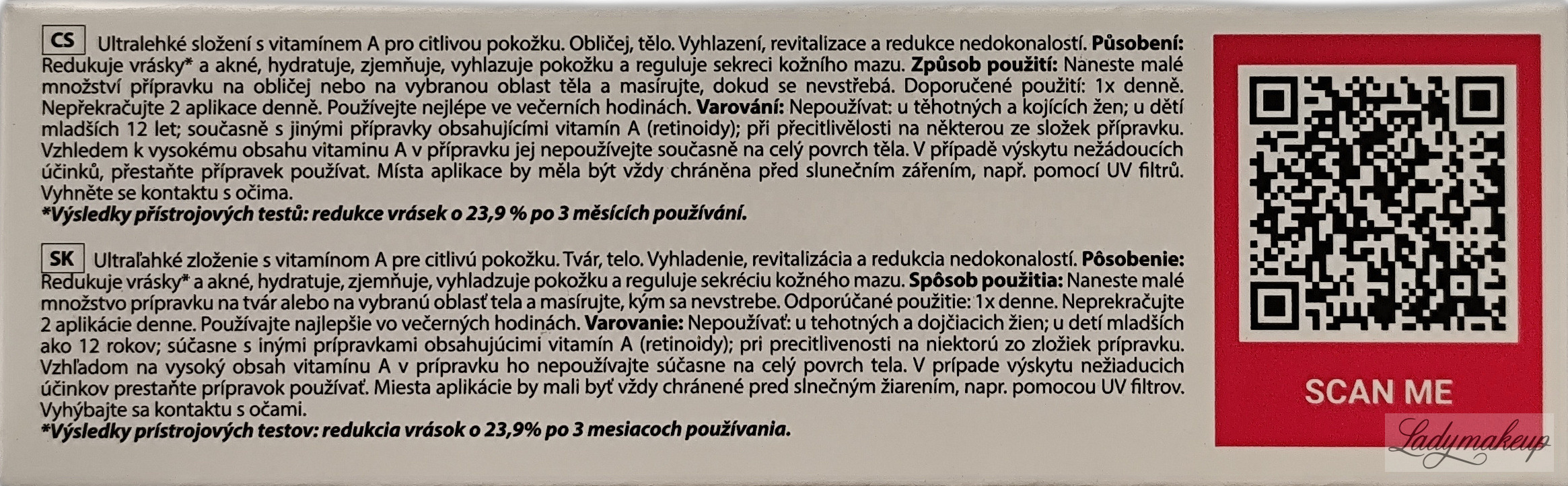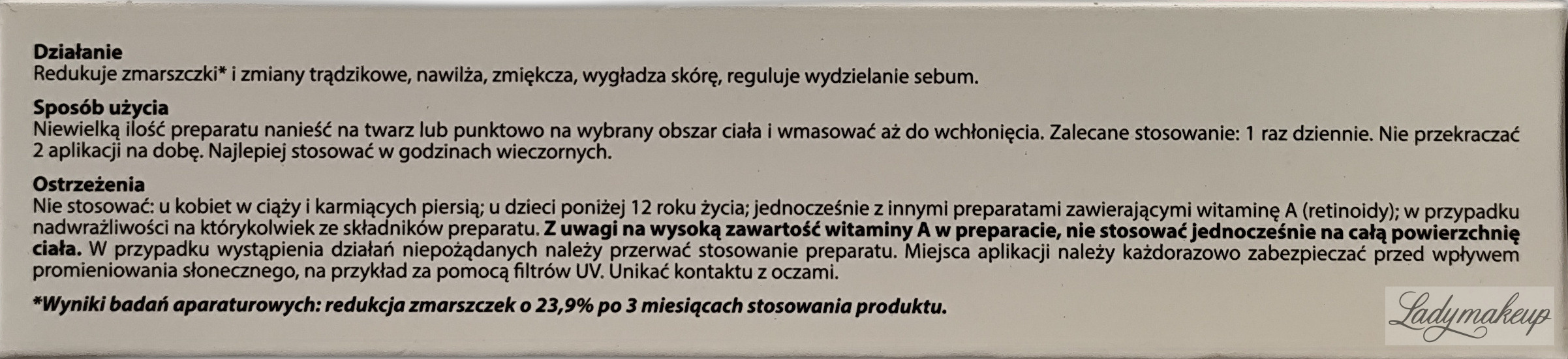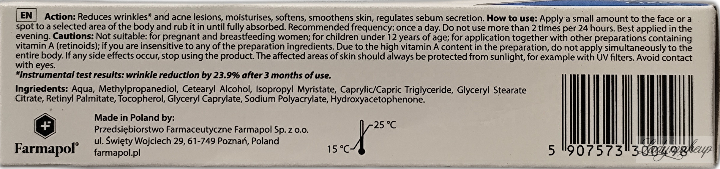 Krem do twarzy oraz ciała. Skierowany jest do pielęgnacji skóry wrażliwej, trądzikowej, z przebarwieniami oraz widocznymi oznakami starzenia. Krem Farmapol posiada ultralekką formułę, która dobrze wchłania się w naskórek, bez tłustej warstwy. Zawiera w sobie retinol (witamina A) o stężeniu 10 000 j.m./g, który regularnie stosowany wspomaga redukcję zmarszczek oraz niedoskonałości i zmian trądzikowych. Jednocześnie kosmetyk reguluje proces wydzielania sebum, wygładza, zmiękcza oraz uelastycznia naskórek. Krem przeznaczony jest do stosowania rano i/lub wieczorem (nie przekraczając 2 aplikacji dziennie). Dostępny jest w poręcznej tubce o pojemności 30 g.