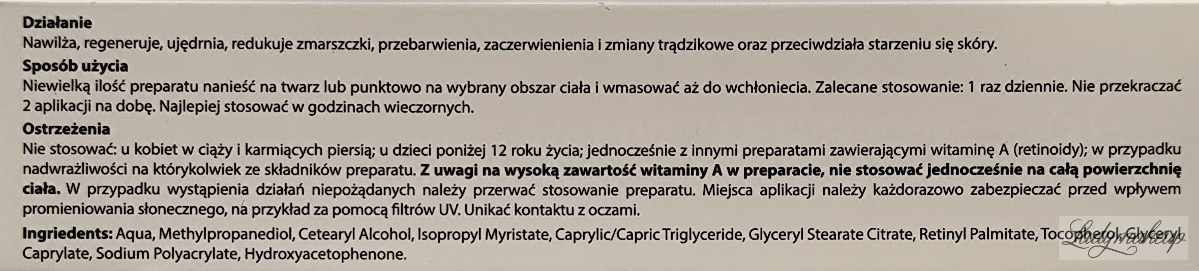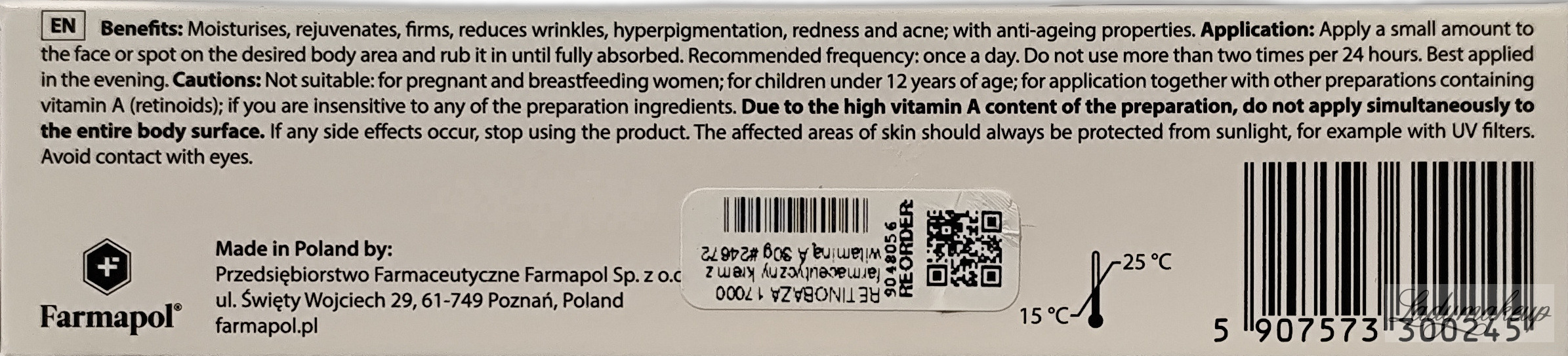 Krem do twarzy oraz ciała. Skierowany jest do pielęgnacji skóry tłustej, problematycznej, trądzikowej, z przebarwieniami oraz z oznakami starzenia. Krem Farmapol posiada ultralekką formułę, która dobrze wchłania się w naskórek, bez tłustej warstwy. Zawiera w sobie retinol (witamina A) o wysokim stężeniu 17 000 j.m./g, który regularnie stosowany rozjaśnia plamy pigmentacyjne, redukuje drobne zmarszczki, poprawia jędrność i elastyczność skóry, a przy tym łagodzi oraz koi wszelkie podrażnienia i zaczerwienienia. Dodatkowo krem zmniejsza widoczność porów, a także redukuje niedoskonałości. Dostępny jest w poręcznej tubce o pojemności 30 g.