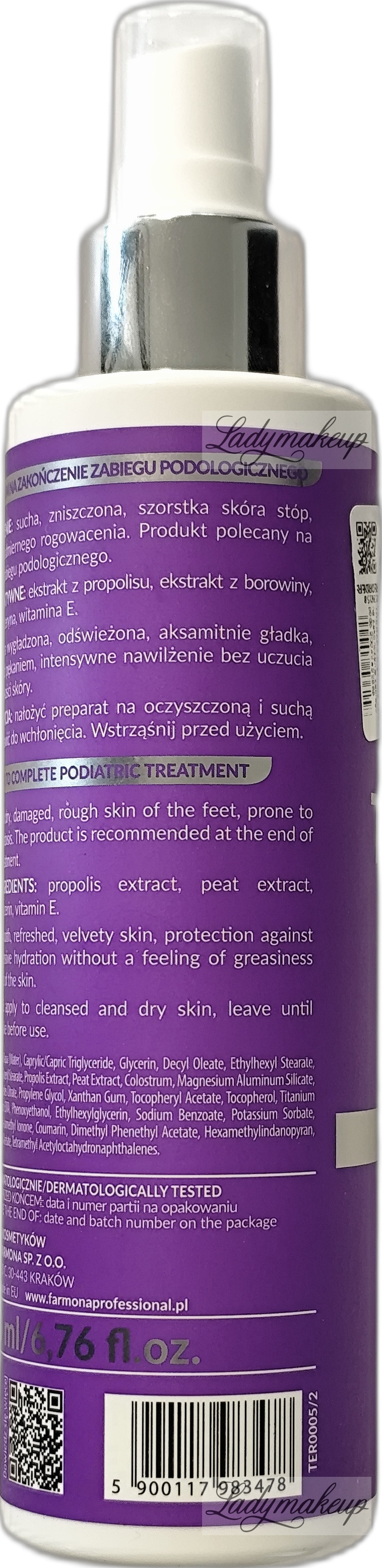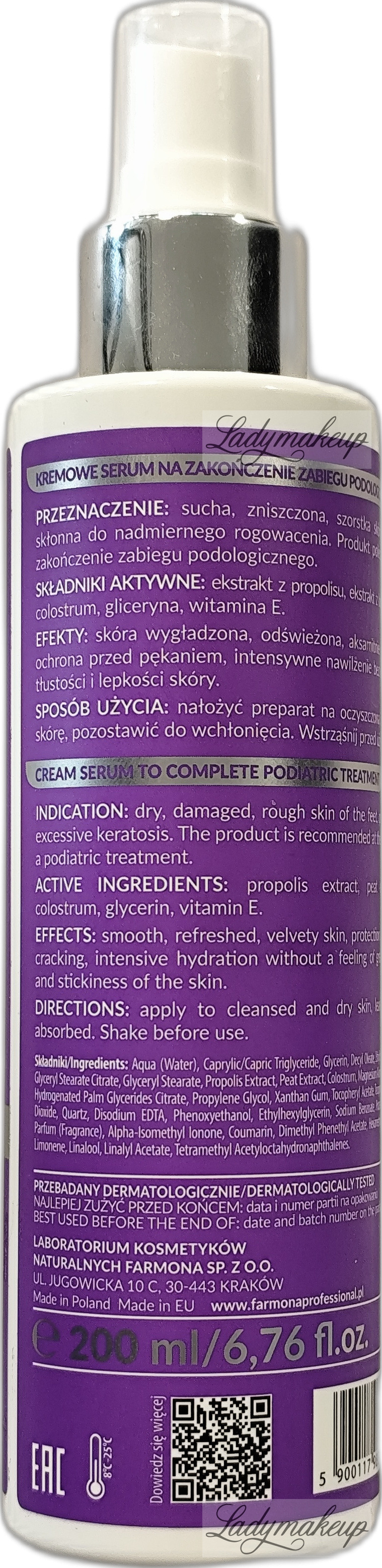 Serum do stóp. Przeznaczone jest do pielęgnacji skóry suchej, zniszczonej, szorstkiej oraz skłonnej do nadmiernego rogowacenia. Doskonale sprawdzi się w zaciszu domowym, ale również będzie niezastąpione do profesjonalnych salonów do zakończenia zabiegów podologicznych. Serum Farmona Professional zawiera specjalnie wyselekcjonowane składniki aktywne, takie jak: ekstrakty z propolisu i borowiny, colostrum, gliceryna oraz witamina E. Kosmetyk intensywnie nawilża, dogłębnie odżywia oraz wygładza naskórek. Dodatkowo odświeża, i chroni skórę stóp przed pękaniem. Farmona serum dostępna jest w opakowaniu o pojemności 200 ml, z wygodną pompką do aplikacji odpowiedniej ilości produktu.