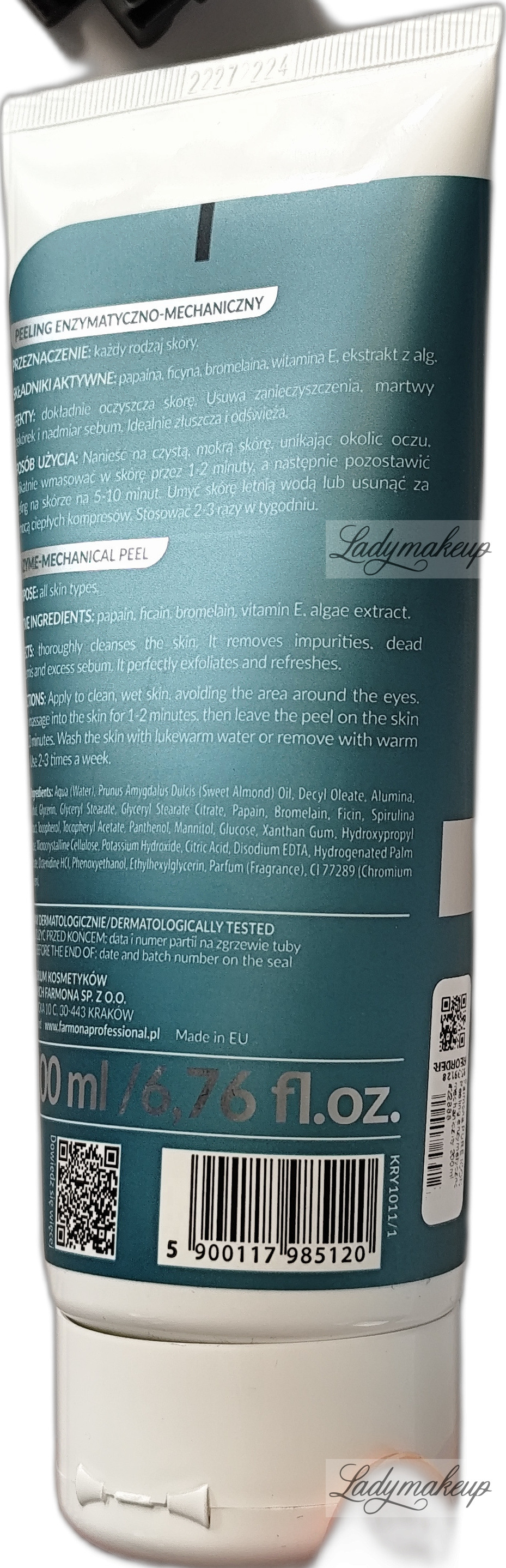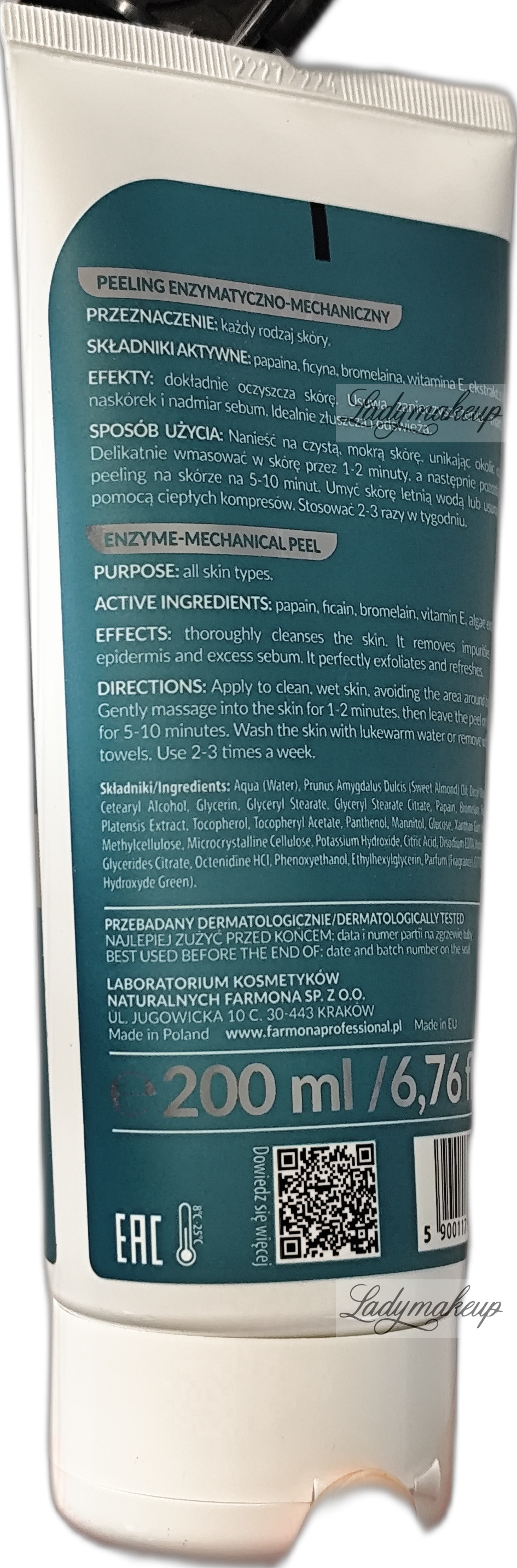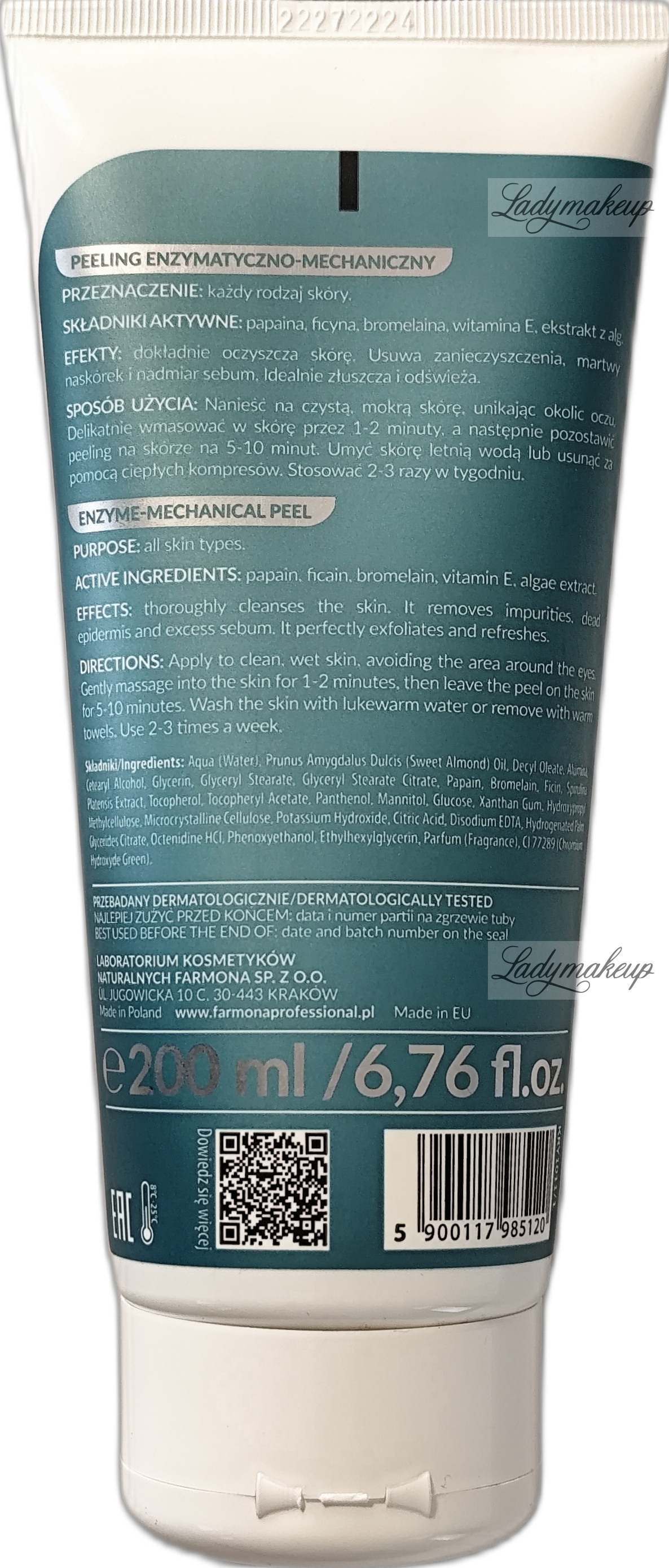 Peeling do twarzy. Doskonale sprawdzi się do pielęgnacji skóry każdego rodzaju, również wrażliwej. Skutecznie łączy w sobie właściwości peelingu enzymatycznego i mechanicznego. W swoim składzie zawiera specjalnie wyselekcjonowane składniki aktywne, takie jak m.in.: papaina, ficyna, bromelaina, witamina E oraz ekstrakt z alg. Peeling Farmona Professional dokładnie złuszcza martwy naskórek, wygładza cerę, a także przywraca skórę do kolejnych etapów pielęgnacyjnych. Dokładnie oczyszcza skórę z zanieczyszczeń oraz nadmiaru sebum. Regularnie stosowany poprawia teksturę skóry oraz sprawia, że cera jest przyjemnie miękka oraz gładka w dotyku. Farmona Professional peeling dostępny jest w poręcznej tubce o pojemności 200 ml.
