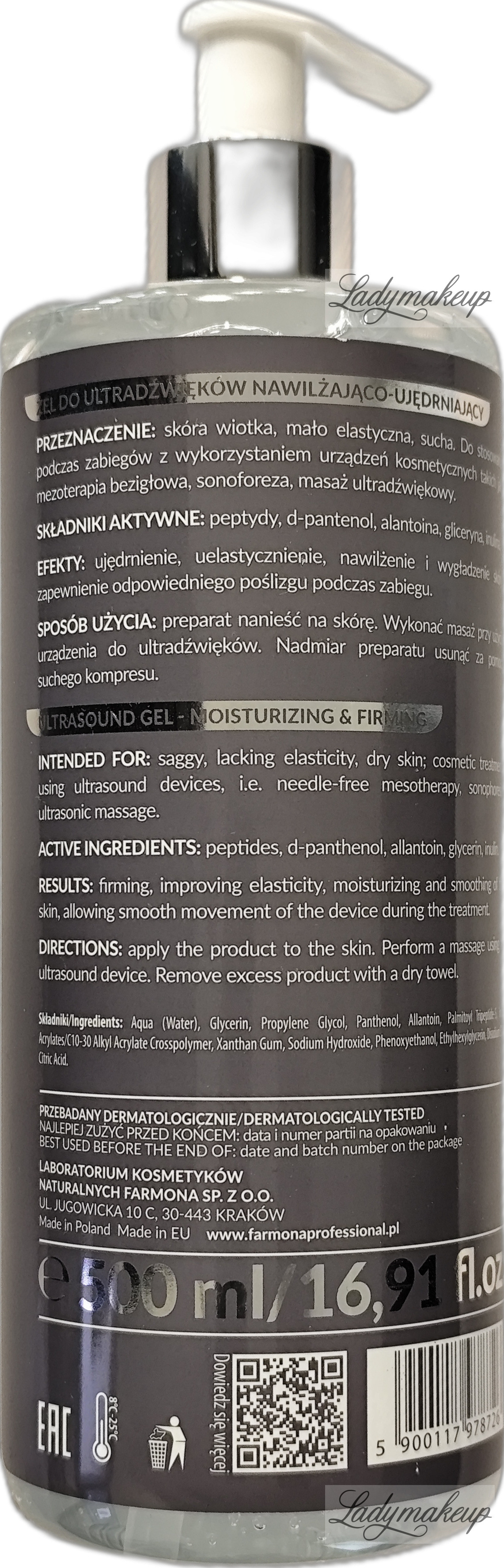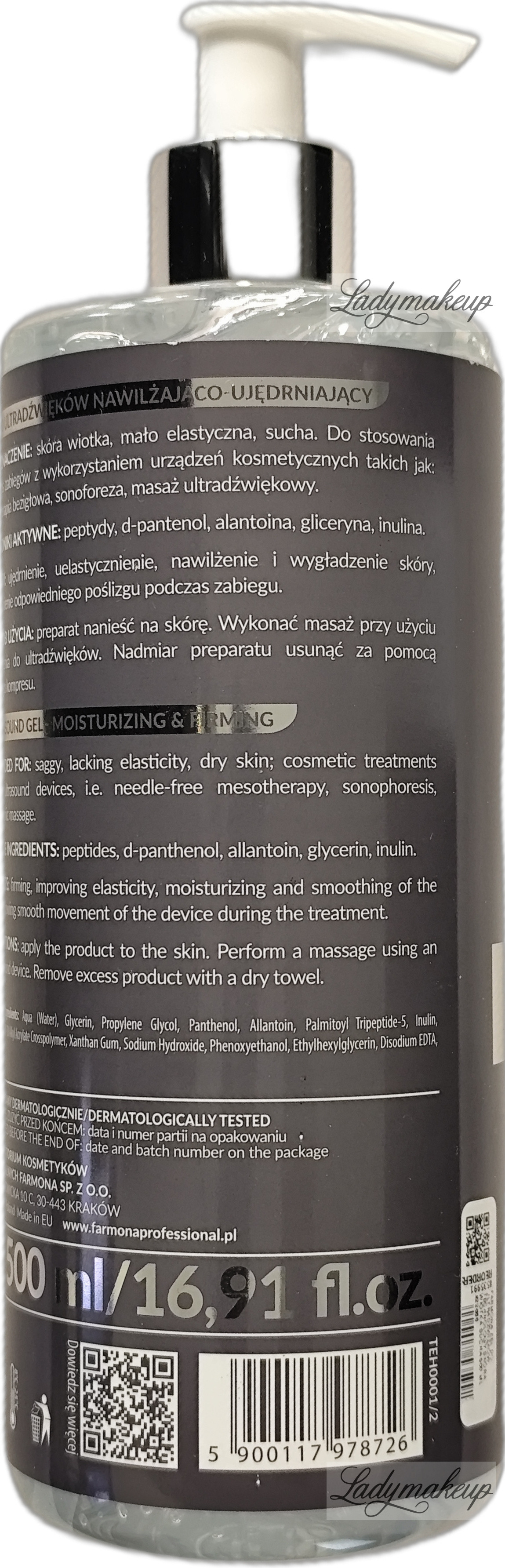 Żel do ultradźwięków. To niezbędny produkt podczas wykonywania zabiegów na twarz i ciało z wykorzystaniem ultradźwięków, fal radiowych oraz mezoterapii bezigłowej. Będzie idealny w pielęgnacji skóry wiotkiej, mało elastycznej oraz suchej. Zawiera w sobie specjalnie wyselekcjonowane składniki aktywne takie jak: peptydy, d-panthenol. alantoina, gliceryna oraz inulina. Żel Farmona Professional widocznie ujędrnia i uelastycznia, a także dogłębnie nawilża oraz wygładza skórę. Farmona Professional żel dostępny jest w poręcznej butelce o pojemności 500 ml, z wygodną pompką do aplikacji odpowiedniej ilości kosmetyku.