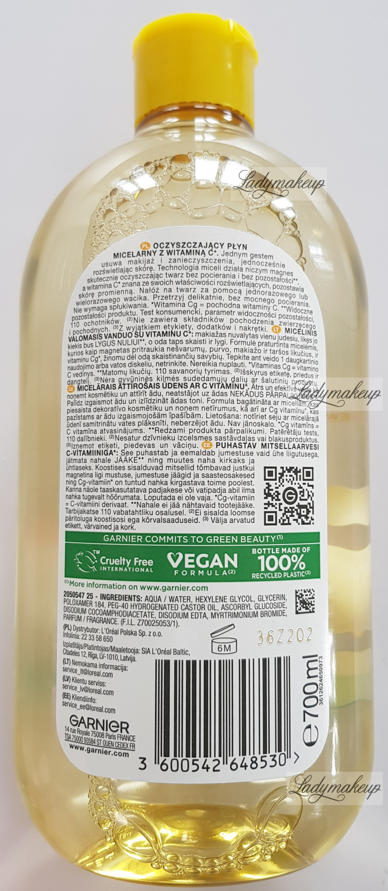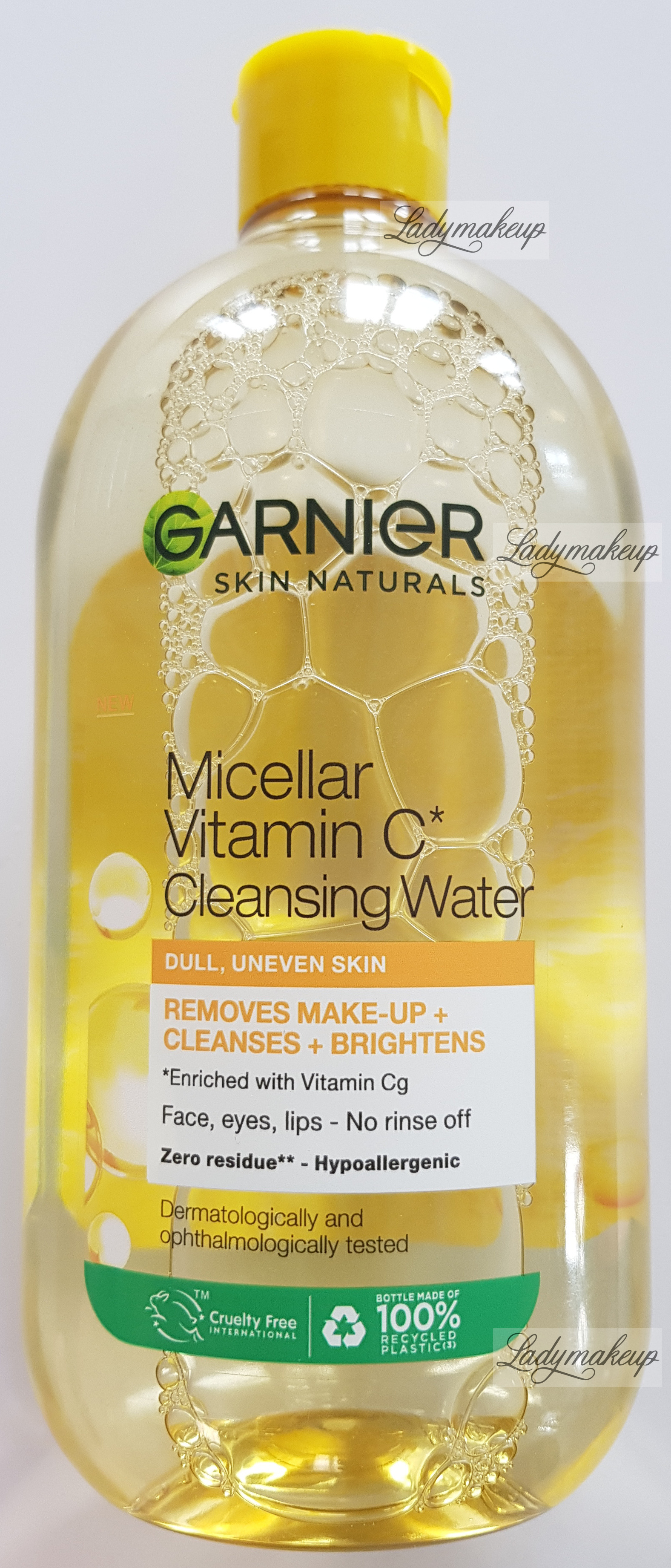 Płyn micelarny. Przeznaczony do każdego rodzaju skóry, także wrażliwej. Skutecznie usuwa makijaż i zanieczyszczenia, jednocześnie rozświetlając i rewitalizując skórę. Formuła oparta na micelach, które działają jak magnes, przyciągając zanieczyszczenia bez konieczności pocierania. Dzięki zawartości witaminy Cg w składzie skóra odzyskuje naturalny blask, wygląda na bardziej wypoczętą i odświeżoną. Kosmetyk jest testowany dermatologicznie i okulistycznie. Płyn micelarny Garnier został umieszczony w butelce o pojemności 700 ml, co sprawia, że jest bardzo wydajny i wystarcza na długi czas użytkowania.