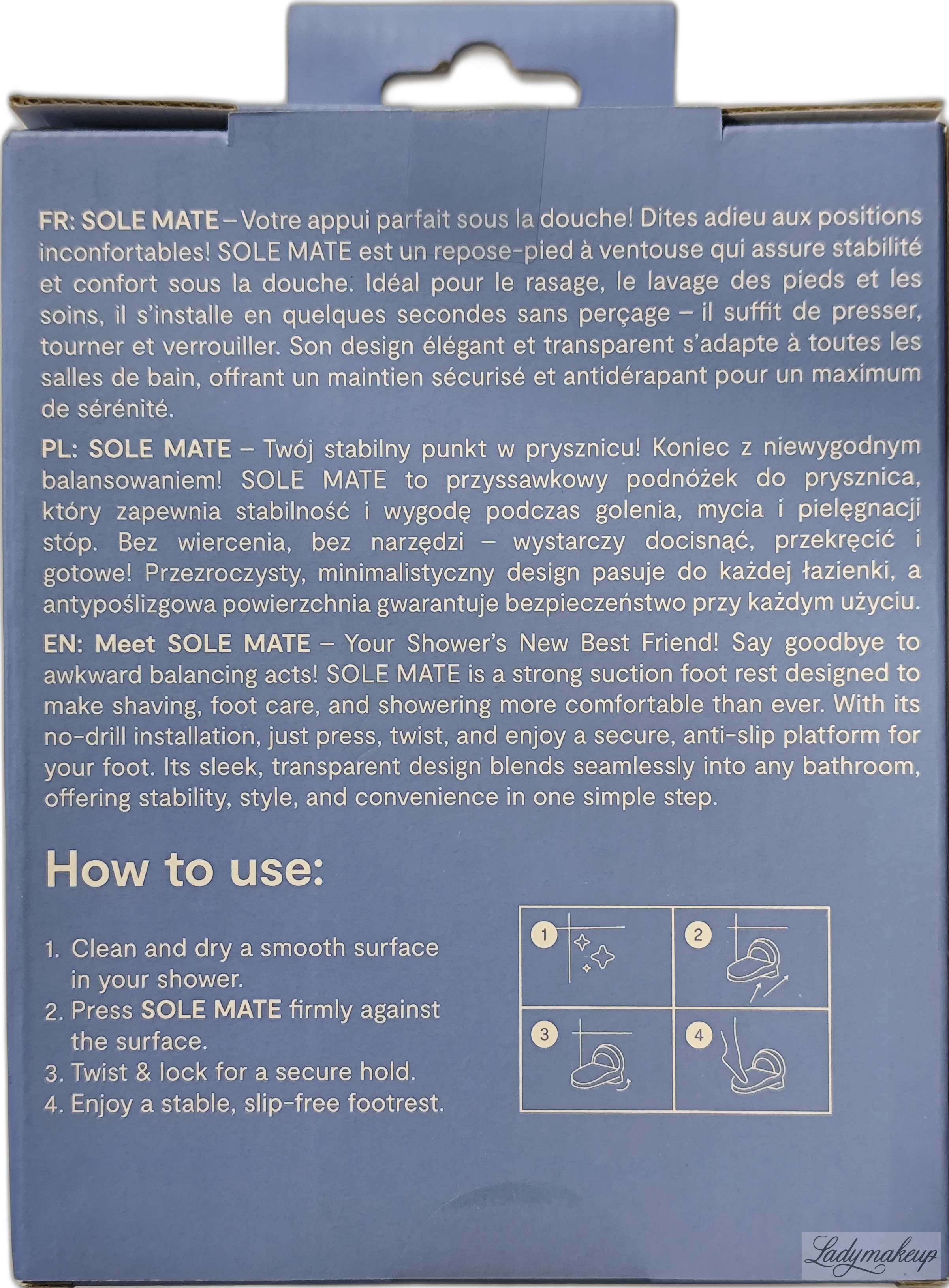 Podnóżek na nogę. Zapewnia wygodne oraz bezpieczne wsparcie stopy pod prysznicem podczas golenia, mycia oraz pielęgnowania. Podnóżek Glov dzięki specjalnej przyssawce vacuum-lock zapewnia sprawną, szybką oraz bezproblemową aplikację pod prysznicem w wybrane miejsce oraz wysokość. Jej montaż nie wymaga żadnych narzędzi - wystarczy nacisnąć, przekręcić i gotowe! Glov podnóżek posiada minimalistyczny design, który będzie świetnie prezentował się w każdej łazience. Specjalna antypoślizgowa powierzchnia zapewnia stabilność stopie. Innowacyjna struktura oraz technologia Vacuum-Lock sprawia, że przyssawka trzyma się nawet podczas ruchu i nacisku. W opakowaniu znajduje się 1 sztuka przezroczystego podnóżka.