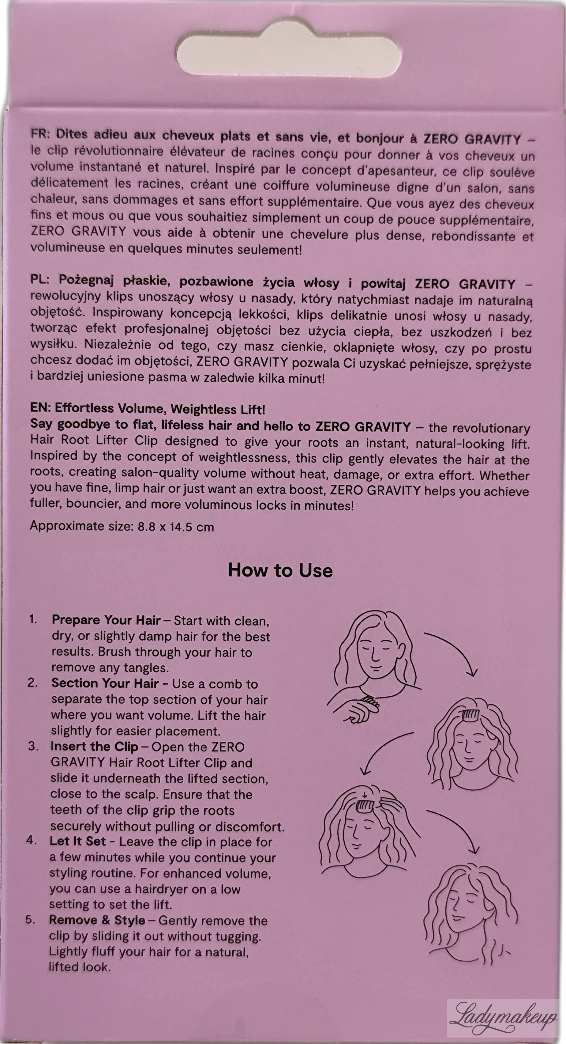 Klips do włosów. W niezwykle szybki oraz prosty sposób unosi pasma u nasady oraz sprawia, że ich stylizacja jest podniesiona na znacznie wyższy poziom. To doskonałe rozwiązanie dla osób z cienkimi włosami, pasmami o małej objętości oraz oklapniętymi, gdyż klips Glov do włosów zapewnia optyczny efekt zwiększonej objętości oraz lekkości fryzury. Wystarczy nałożyć Glov klips jak najbliżej skóry głowy, pomiędzy pasmami, następnie spryskać pasma lakierem, by móc cieszyć się piękną i spektakularną fryzurą. W opakowaniu znajduje się 1 sztuka spinki w odcieniu jasnego różu.