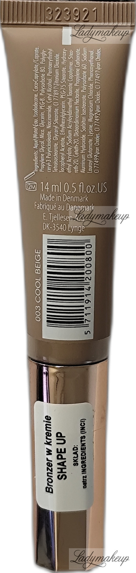 Bronzer. Posiada lekką, kremową formułę, która doskonale łączy się z innymi kosmetykami oraz wtapia się w podkład. Pozwala na precyzyjne wykonturowanie i wymodelowanie kształtu twarzy oraz innych części ciała jak np. nos. Wzbogacony został o naturalny minerał, mikkę, niacynamid oraz witaminę E, które aktywnie pielęgnują i dbają o skórę. Poręczna tubka została wzbogacona o specjalny gąbeczkowy aplikator. Kosmetyk dostępny jest w różnych wariantach kolorystycznych i o pojemności 14 ml.