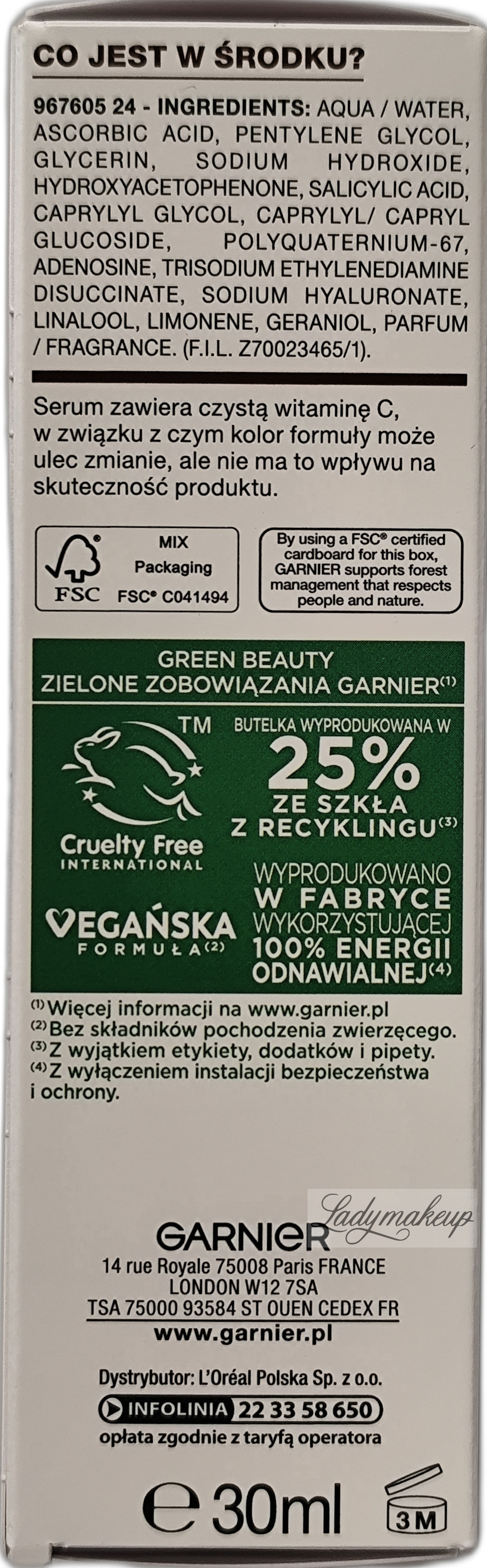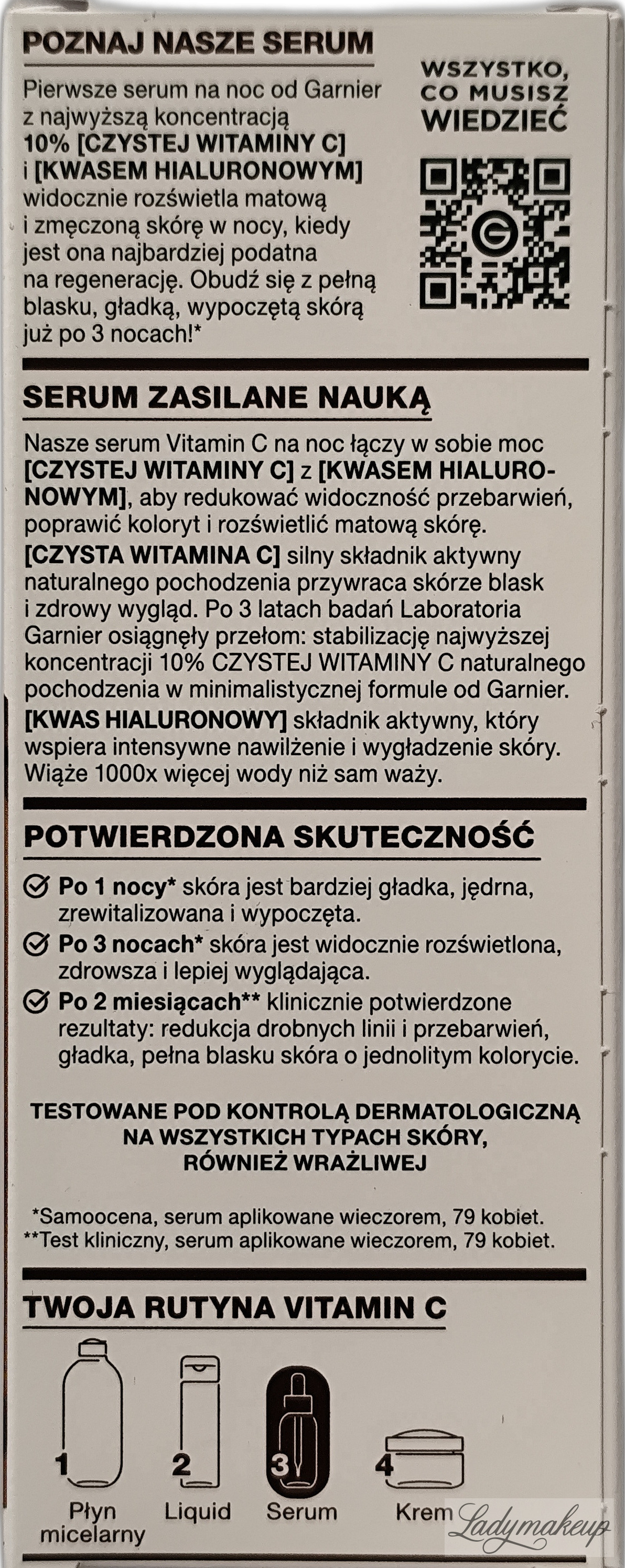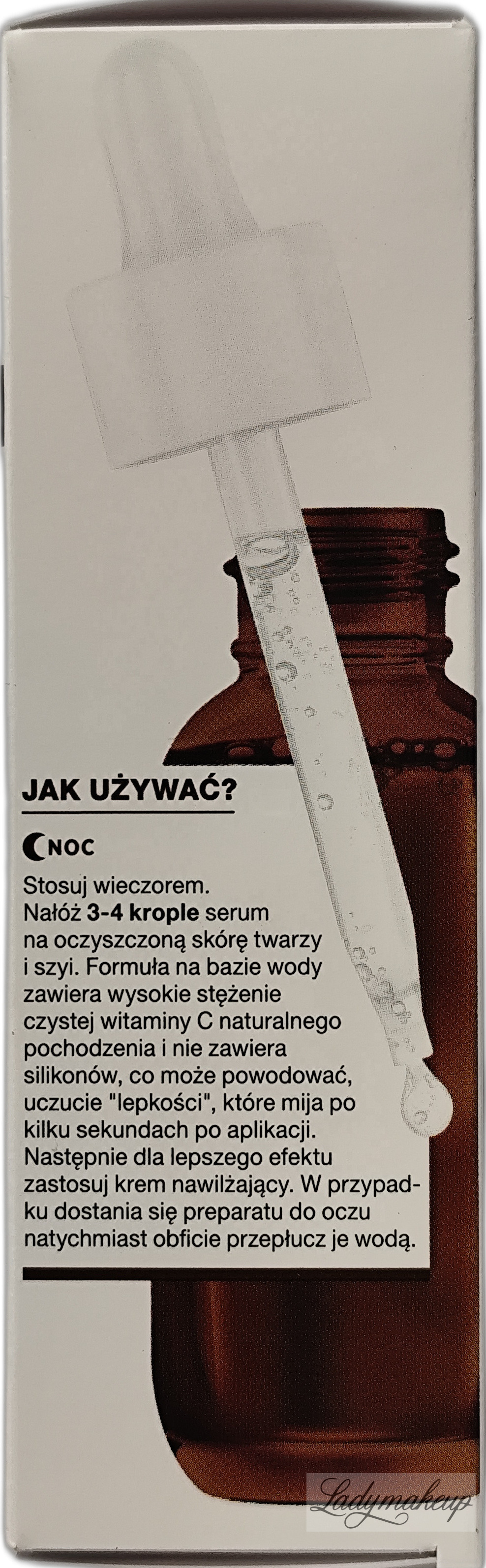 Serum do twarzy. Do stosowania na noc. Skierowane jest ku pielęgnacji skóry matowej, zmęczonej oraz dojrzałej. W swojej formule zawiera 10% czystej witaminy C z dodatkiem kwasu hialuronowego. Wykazuje silne działanie rozświetlające, rozjaśniające różnego rodzaju przebarwienia oraz antyoksydacyjne. Jednocześnie serum ujędrnia, odmąłdza, wygładza drobne linie i zmarszczki, a także odżywia i rewitalizuje. Dostępne jest w szklanej butelce o pojemności 30 ml.- Serum do twarzy.