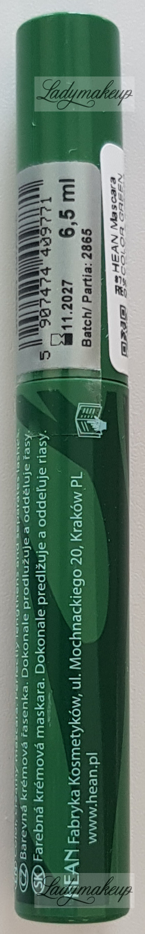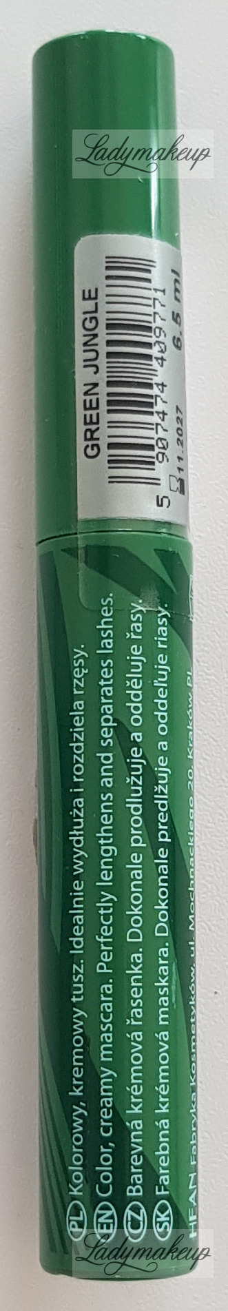 Tusz do rzęs. Nie kruszy się, nie rozmazuje, zapewnia za to długotrwały efekt. Posiada mocno napigmentowaną kremową formułę w odcieniu tropikalnej, intensywnej zieleni, która urozmaici makijaż i nada spojrzeniu spektakularnego akcentu. Wygodna szczoteczka dołączona do małego poręcznego opakowania doskonale rozdziela rzęsy, wydłuża je i podkreśla. Mascara Hean dostępna jest w opakowaniu o pojemności 6,5 ml.