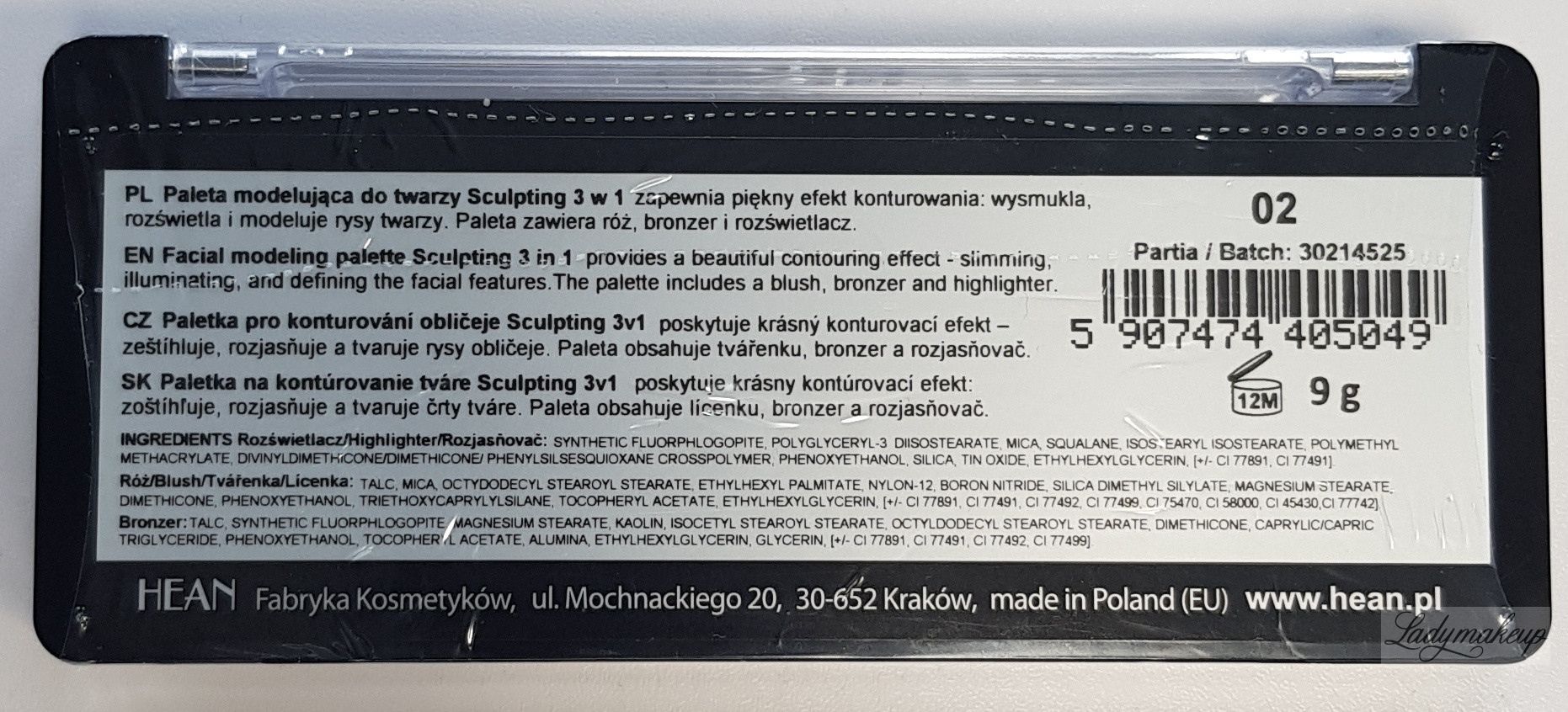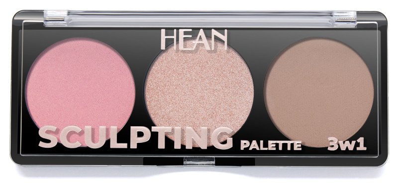 Zestaw do konturowania twarzy. Idealnie podkreśla, rozjaśnia i modeluje owal twarzy. Paleta Hean składa się z 3 pełnowymiarowych produktów: różu, rozświetlacza oraz bronzera. Doskonale sprawdza się podczas wykonywania codziennego makijażu, a także tego na większe wyjścia. Bronzer posiada matową strukturę, dzięki czemu uwydatni kości twarzy i policzków. Po aplikacji cera wygląda jak lekko muśnięta słońcem. Rozświetlacz doskonale podkreśla łuk brwiowy, uwydatnia policzki, a przede wszystkim ich wypukłe części oraz szczyt nosa. Może być aplikowany w kącikach oczu. Róż z dodatkiem drobinek pięknie rozświetla kości policzkowe oraz dodaje im zdrowego, promiennego wyglądu. Hean paleta została umieszczona w solidnym plastikowym opakowaniu o pojemności 9 g.