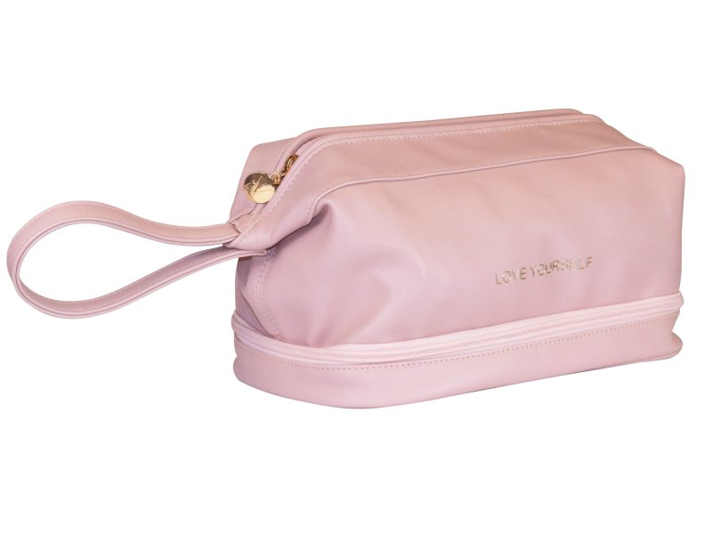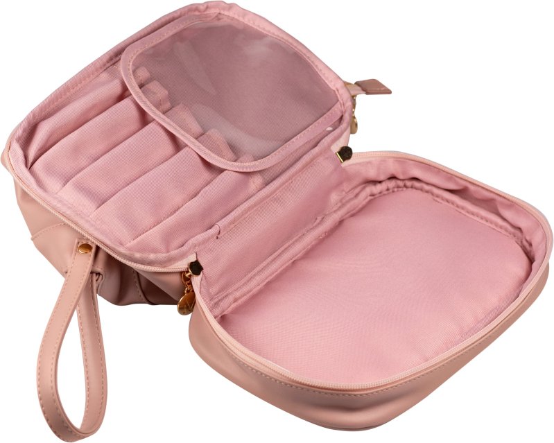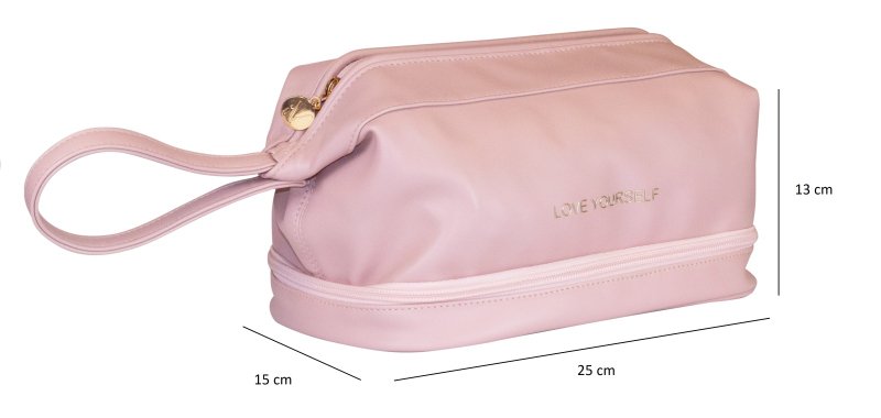 Posiada kształt kuferka. Wykonana została z miękkiej ekoskóry w kuszącym odcieniu pudrowego różu, która sprawia, że jest bardzo łatwa w utrzymaniu czystości. Składa się z jednej dużej komory usztywnianej u góry i zapinanej na zamek, która idealnie sprawdzi się do przechowywania większych kosmetyków oraz akcesoriów, jak np. szczotka do włosów, czy nawet mniejsza, składana suszarka. Wyściełana została różowym materiałem, który idealnie współgra z kolorem kosmetyczki. Szeroką komorę wyposażono w dwie kieszenie na bokach (jedna zapinana na zameczek), które idealnie sprawdzą się do przechowywania mniejszych drobiazgów oraz kosmetyków. U podstawy został umieszczony dodatkowy organizer zapinany na zamek. Pozwala on przechować zestaw ok 5 grubych i szerokich pędzli, bądź ok 10 mniejszych. Kosmetyczka została wyposażona w specjalną mini rączkę - pętlę na dłoń do transportu.