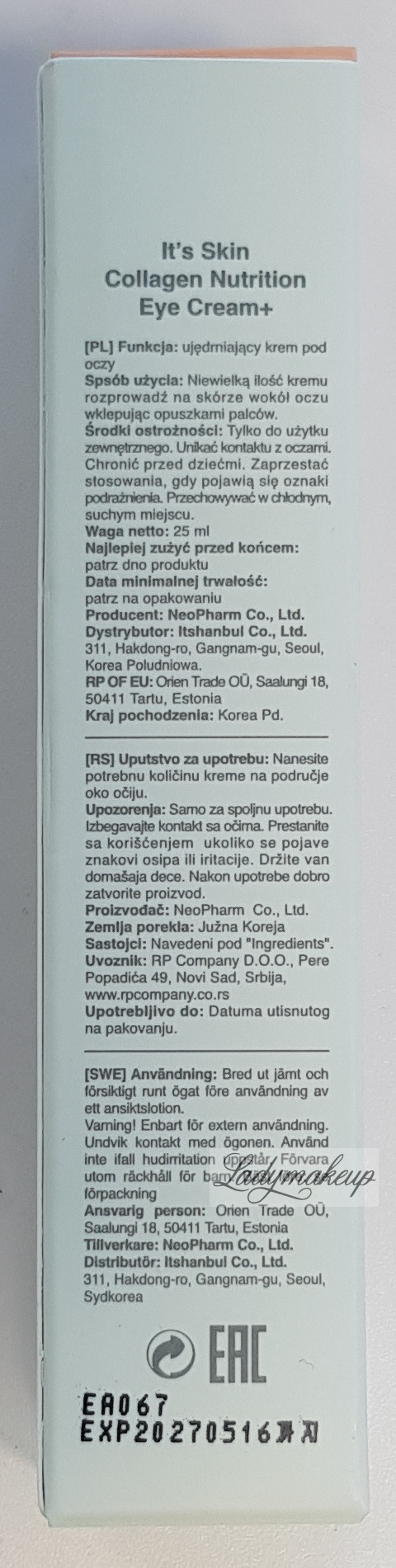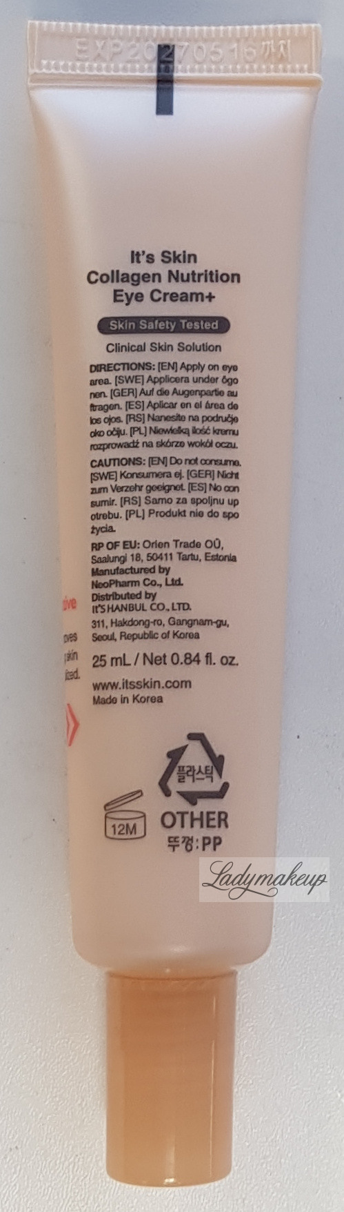Krem pod oczy. Polecany do pielęgnacji skóry każdego rodzaju, w szczególności dojrzałej. W swojej formule It's Skin krem zawiera takie składniki aktywne jak m.in.: hydrolizowany kolagen morski, ekstrakt z listownicy japońskiej, betainę, lecytynę oraz panthenol. Kosmetyk silnie nawilża, dogłębnie odżywia, rozjaśnia cienie pod oczami, a także koi i łagodzi podrażnienia. Regularnie stosowany krem It's Skin wygładza zmarszczki i linie mimiczne, a także poprawia, napięcie, elastyczność oraz jędrność naskórka. Produkt dostępny jest w poręcznej tubce o połączeniu 25 ml.