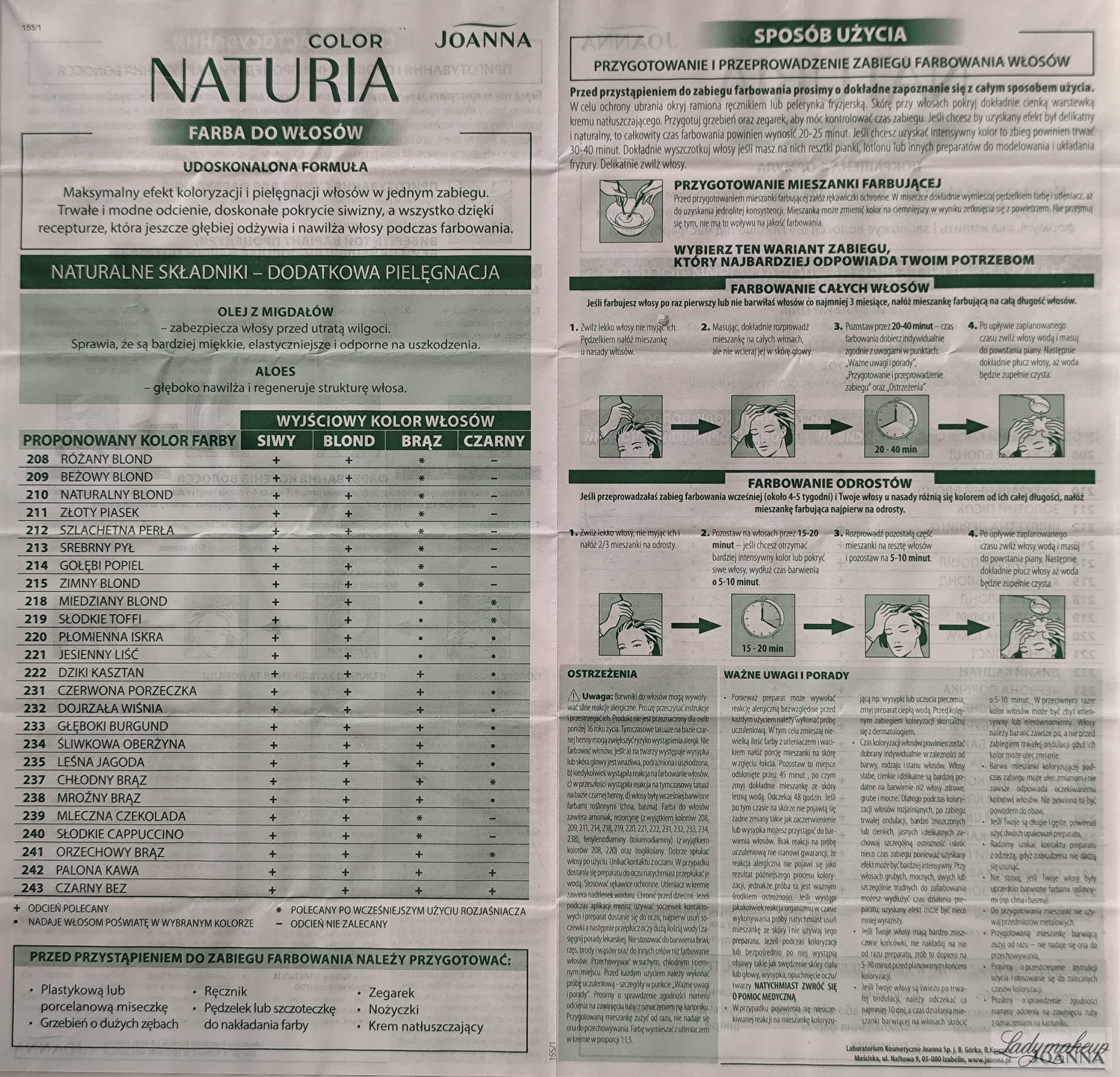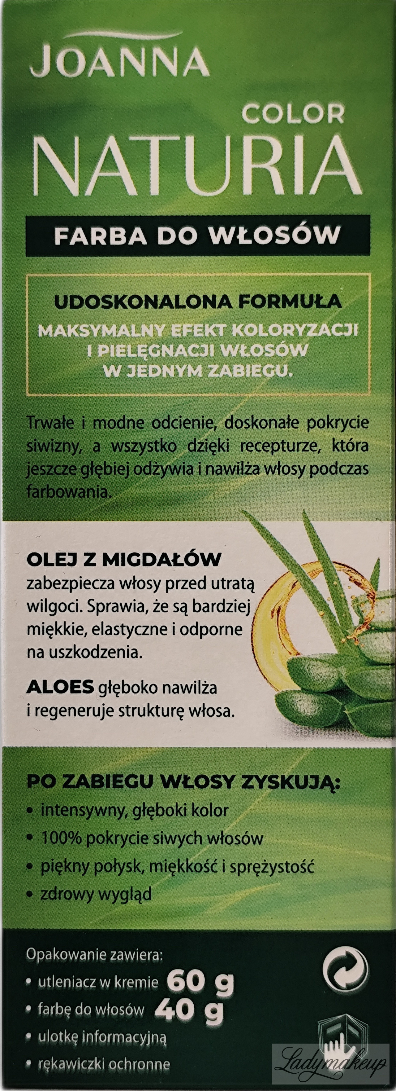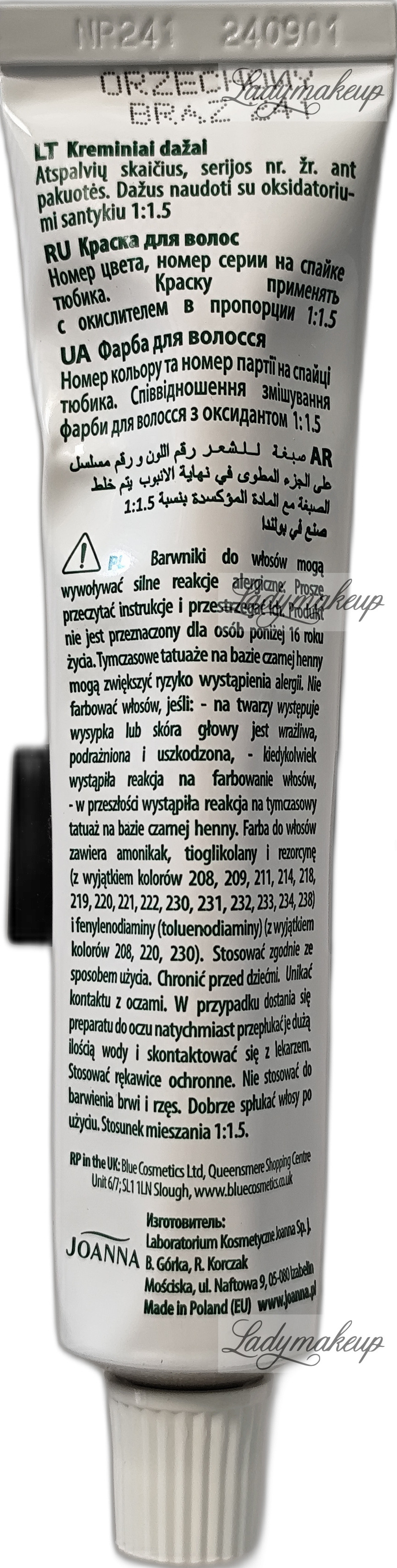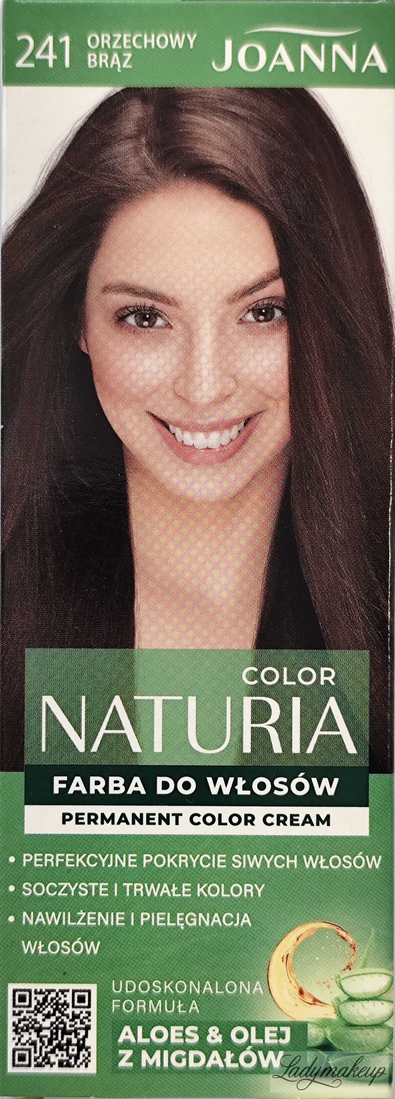 Farba do włosów. Zapewnia maksymalny efekt trwałej koloryzacji. Posiada kremową formułę, która zapewnia 100% pokrycie siwych pasm oraz intensywny kolor, bez blaknięcia. Powstała na bazie specjalnej pielęgnacyjnej receptury, która oprócz mocnego koloru aktywnie dba o dobrostan pasm i skóry głowy. Zawiera w sobie olej z migdałów oraz aloes, które silnie nawilżają, odżywiają, zmiękczają oraz uelastyczniają włosy. Po zastosowaniu włosy zyskują intensywny kolor, zdrowy wygląd oraz piękny połysk. Farba do włosów Joanna dostępna jest w odcieniu 241 Orzechowy Brąz.