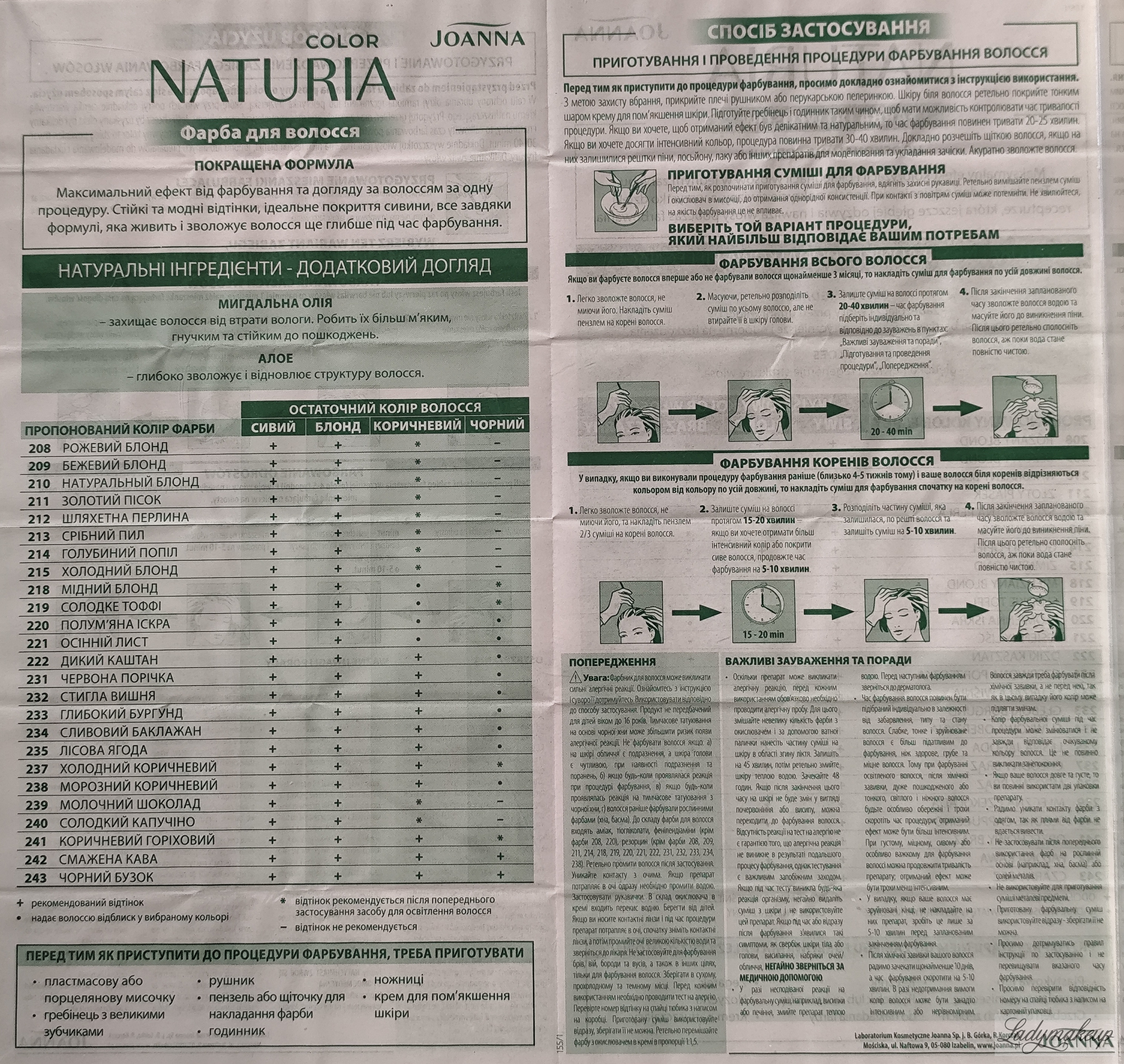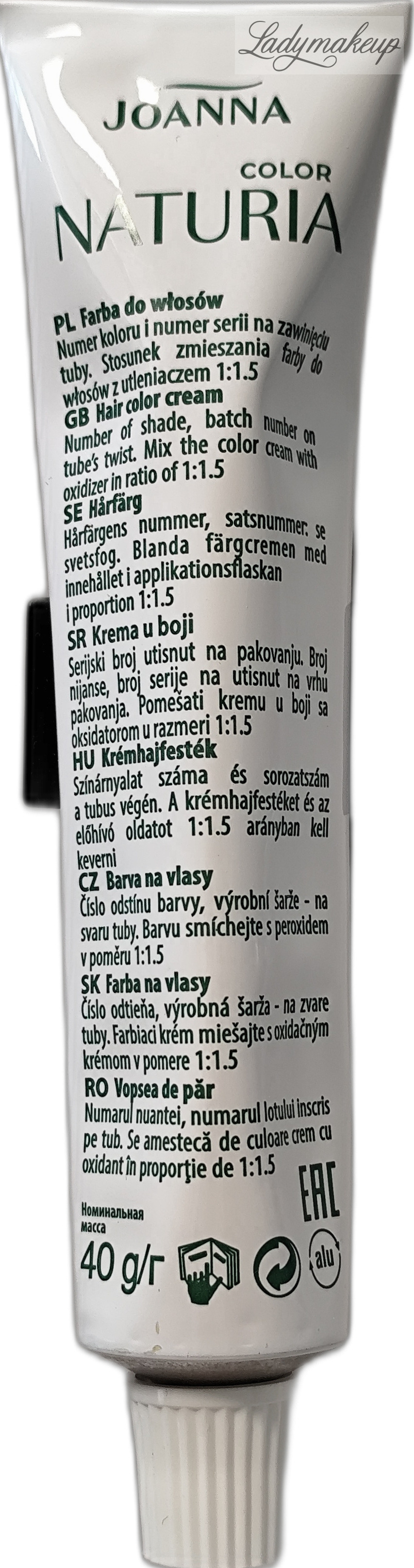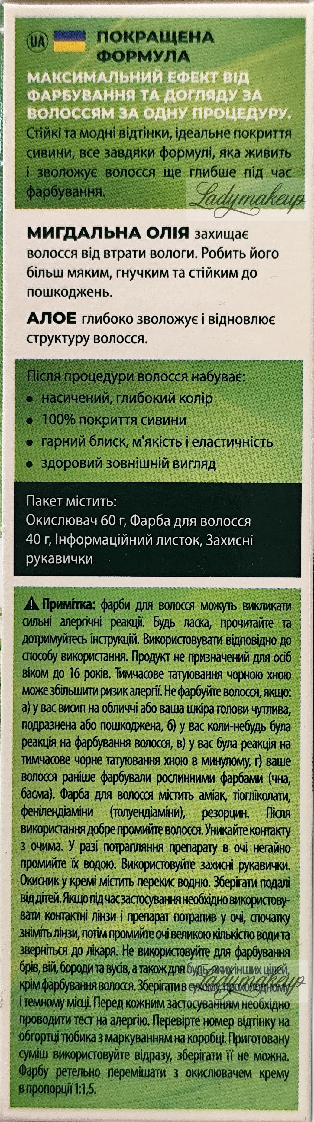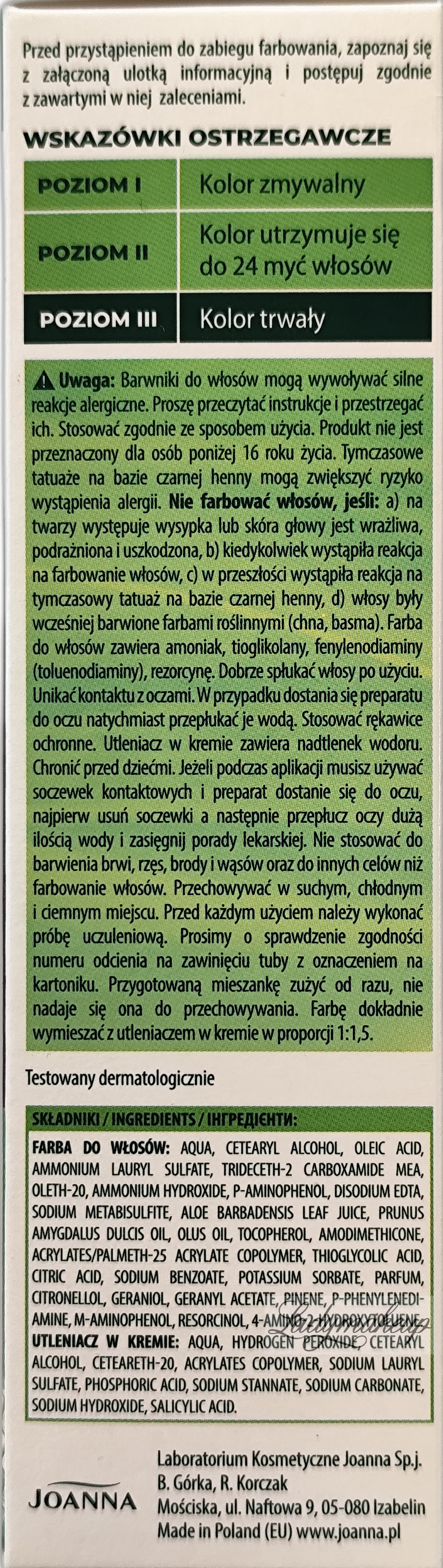 Uwaga: Barwniki do włosów mogą wywoływać silne reakcje alergiczne. Proszę przeczytać instrukcje i przestrzegać ich. Stosować zgodnie ze sposobem użycia. Produkt nie jest przeznaczony dla osób poniżej 16 roku życia. Tymczasowe tatuaże na bazie czarnej henny mogą zwiększyć ryzyko wystąpienia alergii. Nie farbować włosów, jeśli: a) na twarzy występuje wysypka lub skóra głowy jest wrażliwa, podrażniona i uszkodzona, b) kiedykolwiek wystąpiła reakcja na farbowanie włosów, c) w przeszłości wystąpiła reakcja na tymczasowy tatuaż na bazie czarnej henny, d) włosy były wcześniej barwione farbami roślinnymi (chna, basma). Farba do włosów zawiera amoniak, tioglikolany, fenylenodiaminy (toluenodiaminy), rezorcynę. Dobrze spłukać włosy po użyciu. Unikać kontaktu z oczami. W przypadku dostania się preparatu do oczu natychmiast przepłukać je wodą. Stosować rękawice ochronne. Utleniacz w kremie zawiera nadtlenek wodoru. Chronić przed dziećmi. Jeżeli podczas aplikacji musisz używać soczewek kontaktowych i preparat dostanie się do oczu, najpierw usuń soczewki a następnie przepłucz oczy dużą ilością wody i zasięgnij porady lekarskiej. Nie stosować do barwienia brwi, rzęs, brody i wąsów oraz do innych celów niż farbowanie włosów. Przechowywać w suchym, chłodnym i ciemnym miejscu. Przed każdym użyciem należy wykonać próbę uczuleniową. Prosimy o sprawdzenie zgodności numeru odcienia na zawinięciu tuby z oznaczeniem na kartoniku. Przygotowaną mieszankę zużyć od razu, nie nadaje się ona do przechowywania. Farbę dokładnie wymieszać z utleniaczem w kremie w proporcji 1:1,5.