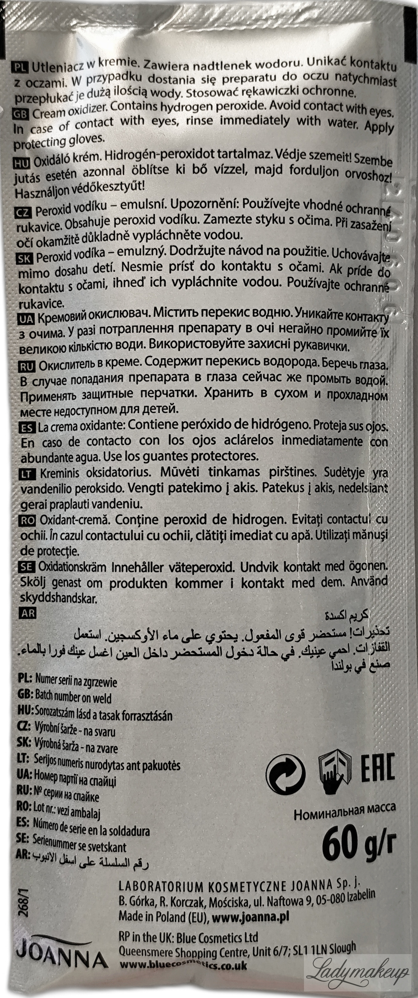UTLENIACZ W KREMIE: AQUA, HYDROGEN PEROXIDE, CETEARYL ALCOHOL, CETEARETH-20, ACRYLATES COPOLYMER, SODIUM LAURYL SULFATE, PHOSPHORIC ACID, SODIUM STANNATE, SODIUM CARBONATE, SODIUM HYDROXIDE, SALICYLIC ACID.