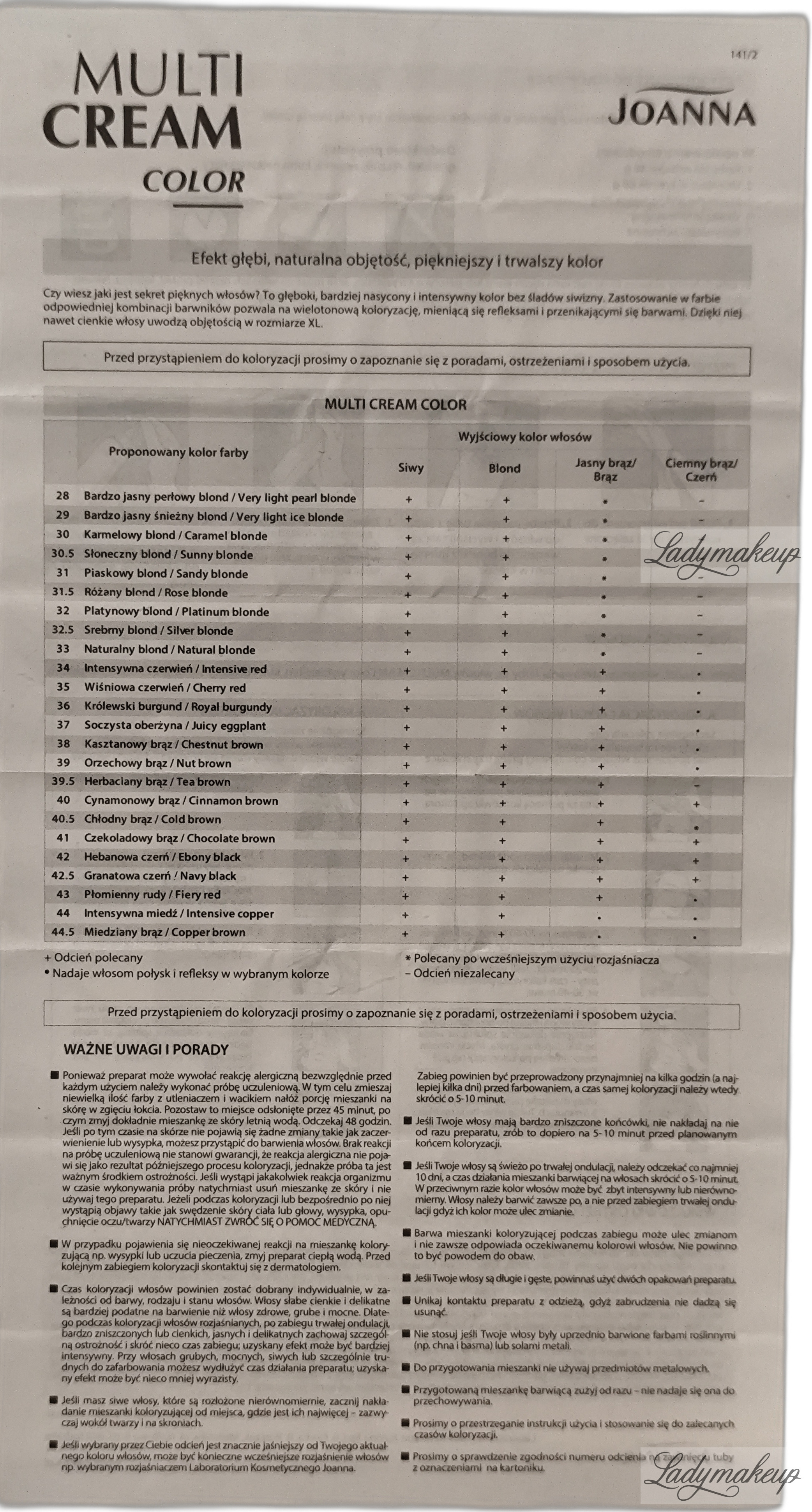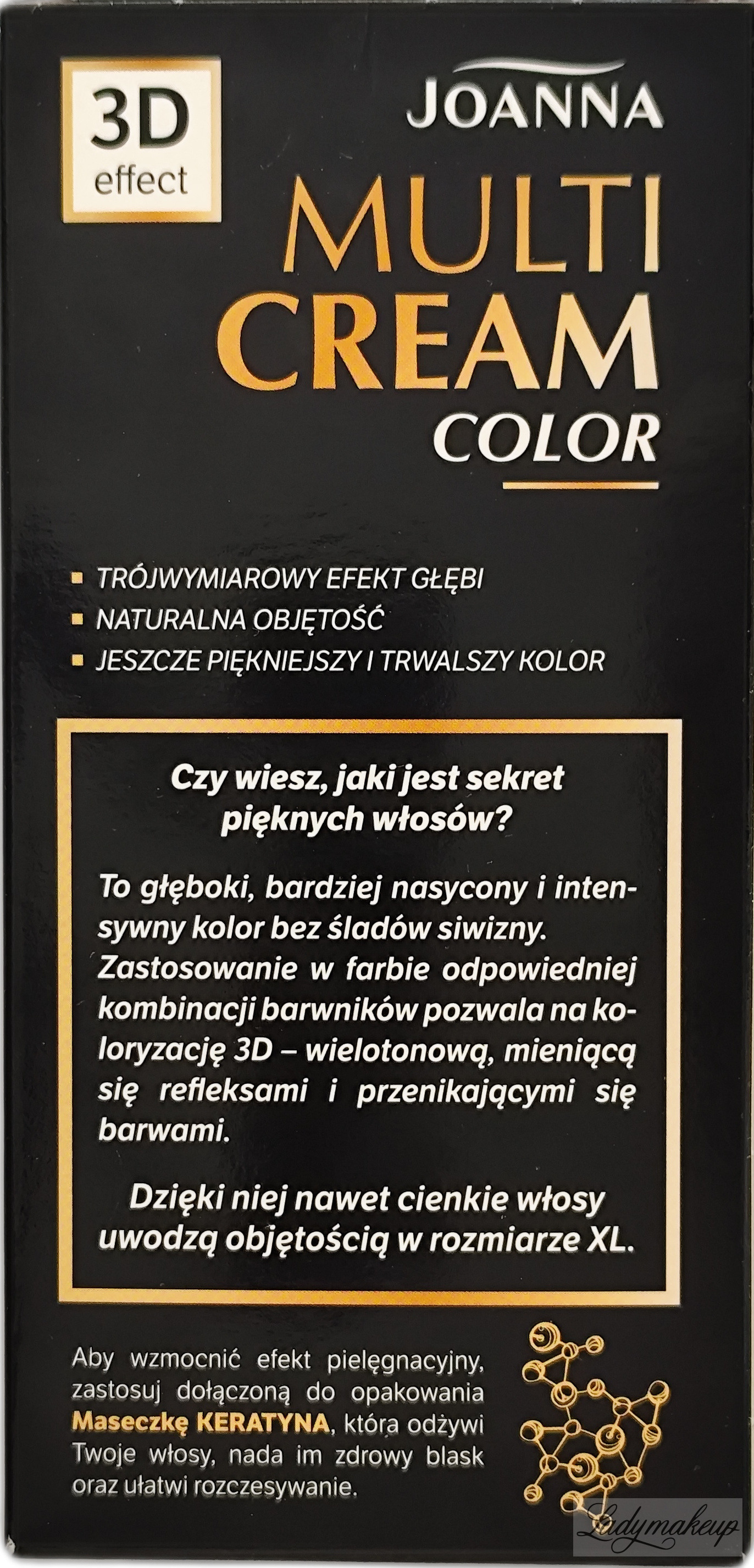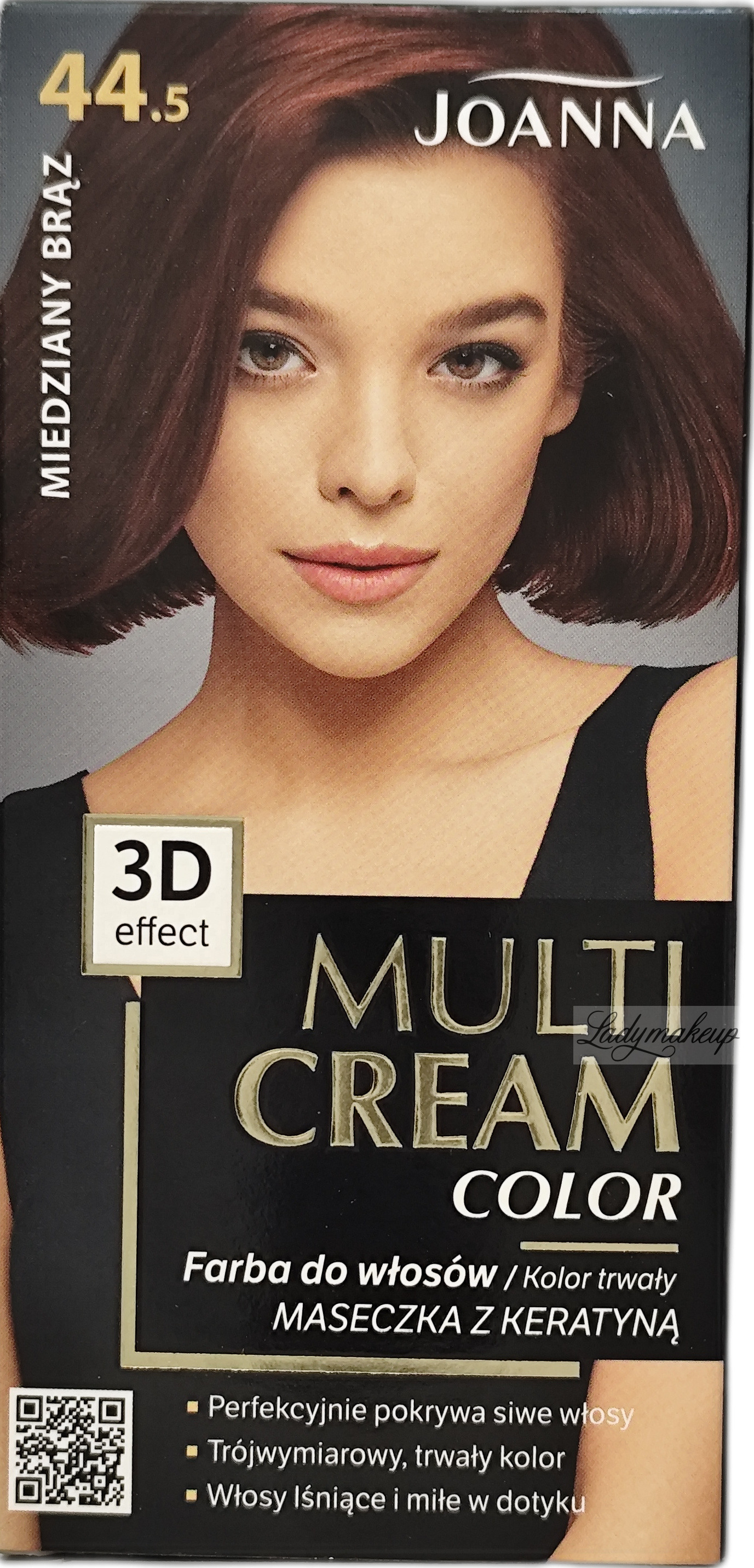 Farba do włosów. Pozwala osiągnąć efekt trwałej koloryzacji. Skutecznie pokrywa siwe włosy, pozostawiając po sobie piękny i wielowymiarowy kolor. Wzbogacona została o specjalną kompozycję barwników, która daje spektakularny efekt koloryzacji 3D. Pięknie odbija światło, tworząc wrażenie, że przenika ono wszystkie warstwy włosów jednocześnie, dzięki czemu tworzy na ich powierzchni błyszczącą taflę. Dodatkowo zapewnia 100% pokrycie siwych włosów oraz sprawia, że włosy są lśniące oraz miękkie w dotyku. Aby wzmocnić efekt pielęgnacyjny, w opakowaniu została umieszczona maseczka keratynowa, która jednocześnie ułatwi rozczesywanie. Farba do włosów Joanna dostępna jest w odcieniu 44.5 Miedziany Brąz.