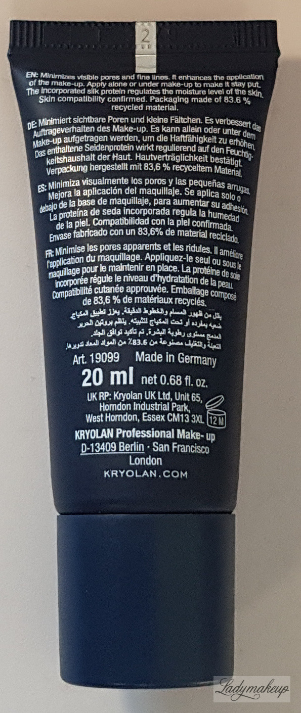 Baza pod makijaż. Posiada lekką, jedwabistą formułę, która szybko się wchłania i wygładza skórę. Ponadto minimalizuje pory oraz drobne linie i niedoskonałości. Skutecznie przedłuża trwałość makijażu i zapewnia jego nieskazitelne wykończenie - nawet pod okiem kamery HD. Zawiera w składzie proteiny jedwabiu, które nawilżają i pielęgnują skórę, przywracając jej naturalną równowagę i świeżość. Dodatkowo baza Kryolan jest wolna od parebenów, dzięki czemu może być stosowana przez osoby o wrażliwej skórze. Kosmetyk dostępny jest w tubce o pojemności 20 ml.
