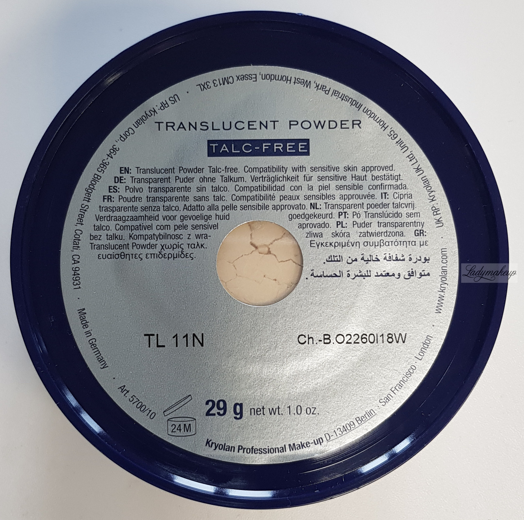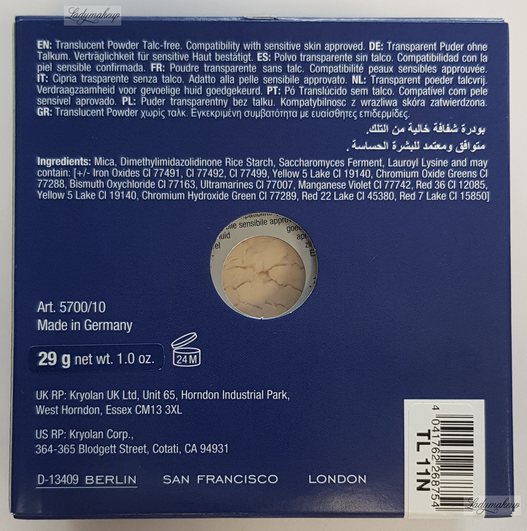 Puder transparentny bez talku. Idealny zarówno dla profesjonalistów, jak i do codziennego użytku. Doskonale sprawdzi się do wykańczania i utrwalana makijażu wykonanego produktami o konsystencji płynnej lub kremowej. Zawiera w składzie modyfikowaną skrobię ryżową, która skutecznie absorbuje sebum, zapewniając długotrwały, matowy efekt bez nieestetycznego błyszczenia. Jego lekka konsystencja sprawia, że nie obciąża skóry i nie tworzy efektu maski. Puder Kryolan dostępny jest w kilku odcieniach, dzięki czemu można dopasować go do indywidualnych potrzeb. Umieszczony został w solidnym opakowaniu o pojemności 29 g.