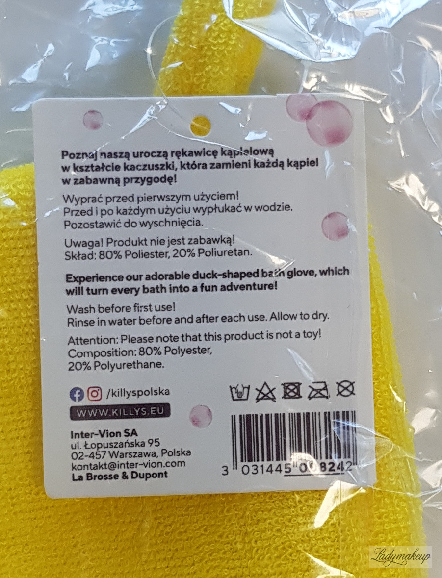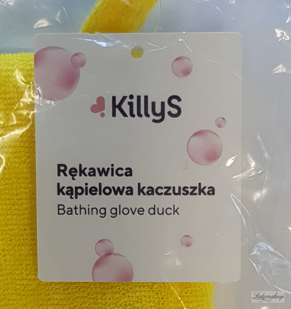 Rękawica do kąpieli. Posiada uroczy a jednocześnie zabawny kształt kaczuszki, dzięki czemu sprawi, że kąpiel każdego dziecka zmieni się z obowiązku w przednią zabawę. Rękawica KillyS wykonana została ze specjalnego chłonnego materiału, który umożliwia spienianie kosmetyków, takich jak żele pod prysznic i sprawne i bezproblemowe aplikowanie ich na powierzchnię ciała. Specjalna forma "pacynki" pozwala na nałożenie jej na dłoń oraz fajną wodną zabawę z maluszkiem. Specjalny gruby materiał z dodatkiem żelu skutecznie oczyszcza skórę ciała z wszelkich zanieczyszczeń, a także pozwala na wykonanie delikatnego masażu na jego powierzchni. W opakowaniu znajduje się jedna rękawica kąpielowa w kształcie kaczuszki.