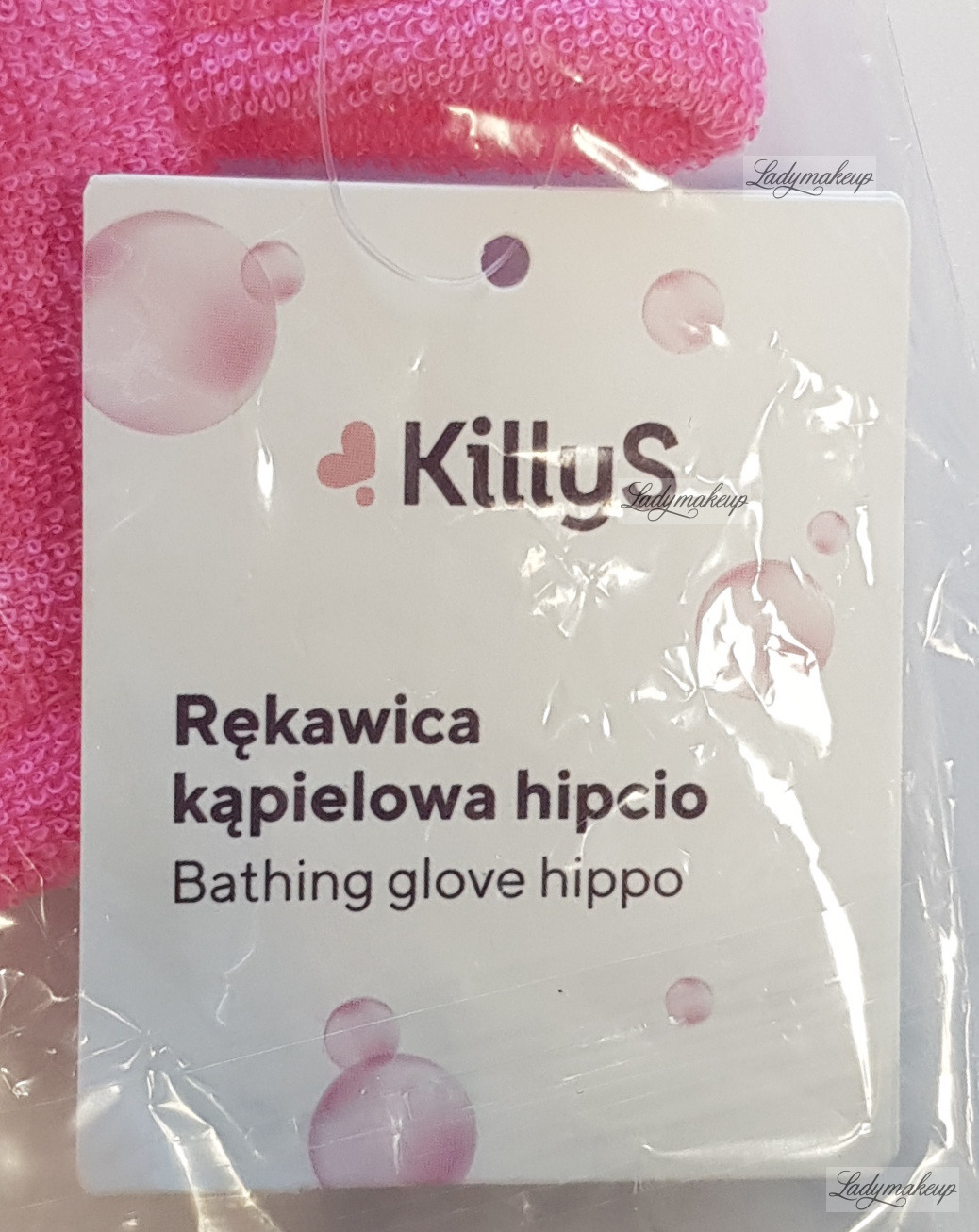 Rękawica do kąpieli. Posiada uroczy a jednocześnie zabawny kształt hipopotama, dzięki czemu sprawi, że kąpiel każdego dziecka zmieni się z obowiązku w przednią zabawę. Rękawica KillyS wykonana została ze specjalnego chłonnego materiału, który umożliwia spienianie kosmetyków, takich jak żele pod prysznic i sprawne i bezproblemowe aplikowanie ich na powierzchnię ciała. Specjalna forma "pacynki" pozwala na nałożenie jej na dłoń oraz fajną wodną zabawę z maluszkiem. Specjalny gruby materiał z dodatkiem żelu skutecznie oczyszcza skórę ciała z wszelkich zanieczyszczeń, a także pozwala na wykonanie delikatnego masażu na jego powierzchni. W opakowaniu znajduje się jedna rękawica kąpielowa w kształcie hipopotama.