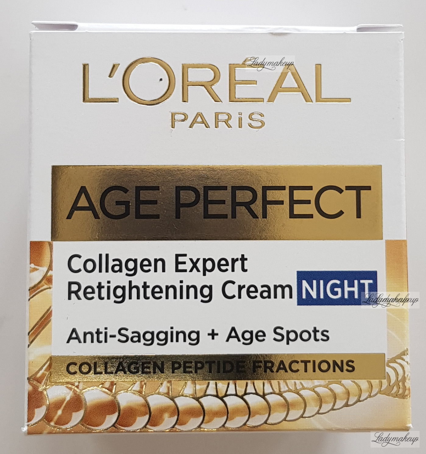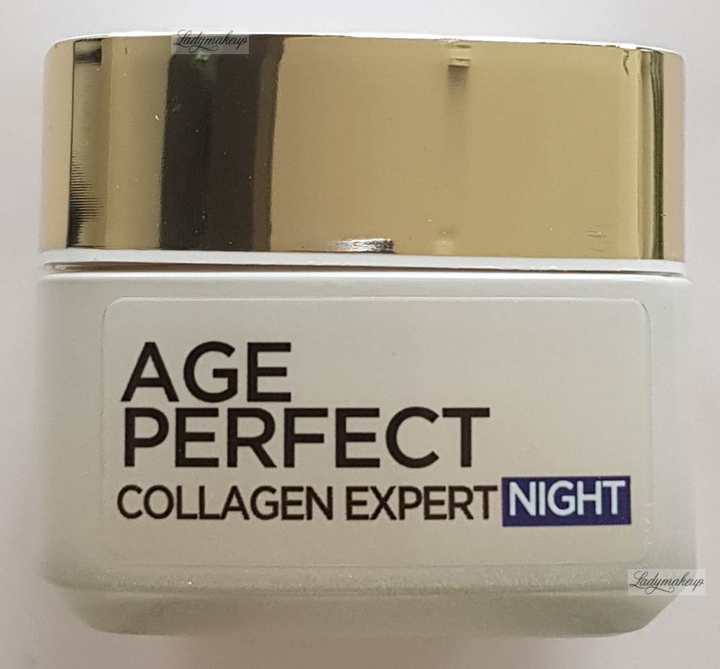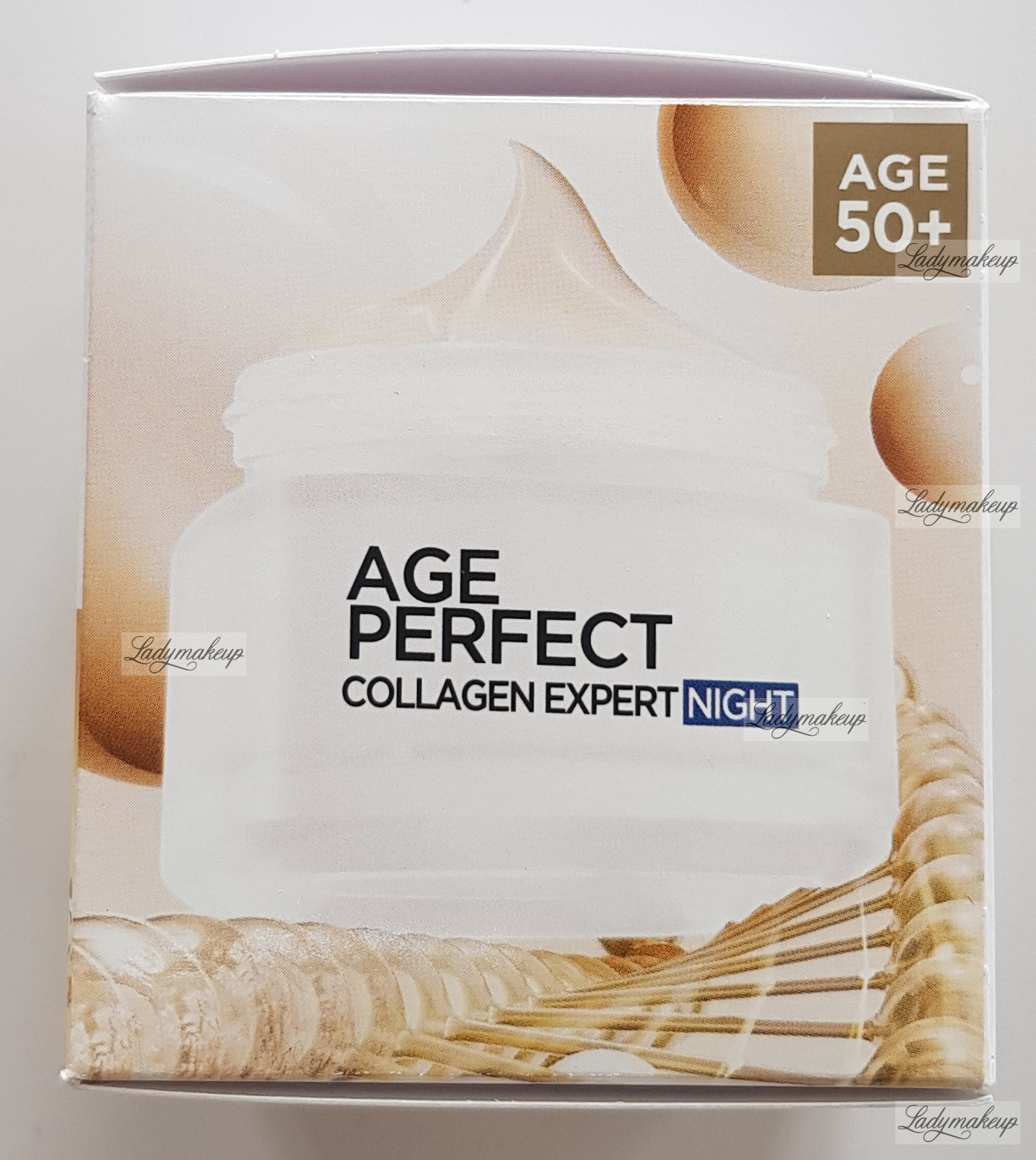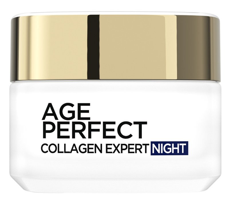 Krem do twarzy na noc. Pochodzi z linii kosmetyków Age Perfect. Został stworzony z myślą o pielęgnacji skóry dojrzałej 50+, która wymaga ujędrnienia, wyrównania kolorytu i głębokiego odżywienia. Posiada aksamitną formułę, która doskonale się wchłania w skórę i pozostawią ja wygładzoną, miękką i bardziej napiętą już po pierwszym zastosowaniu. Krem L'Oréal wzbogacony został o peptydy kolagenowe, które wspomagają odbudowę struktury skóry i poprawiają jej jędrność oraz niacynamid znany ze swoich właściwości rozjaśniających przebarwienia i wyrównujących koloryt cery. Kosmetyk umieszczono w słoiczku o pojemności 50 ml.