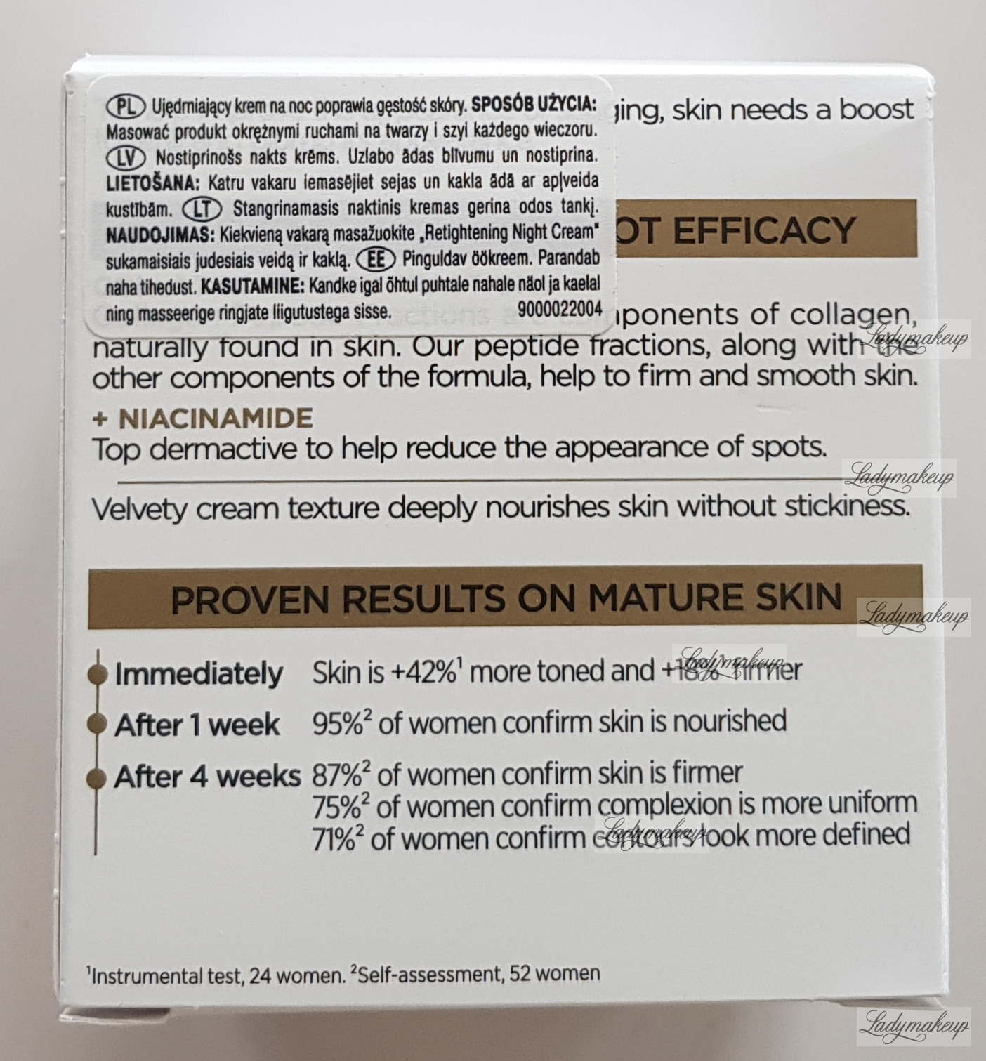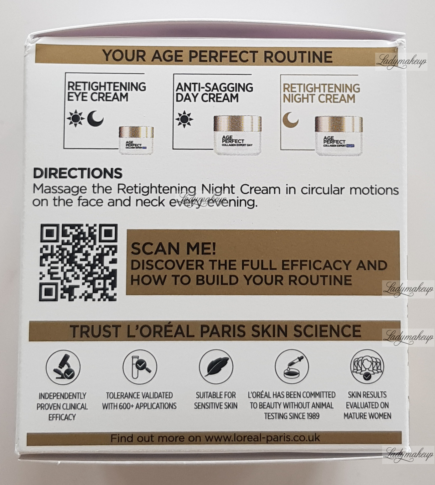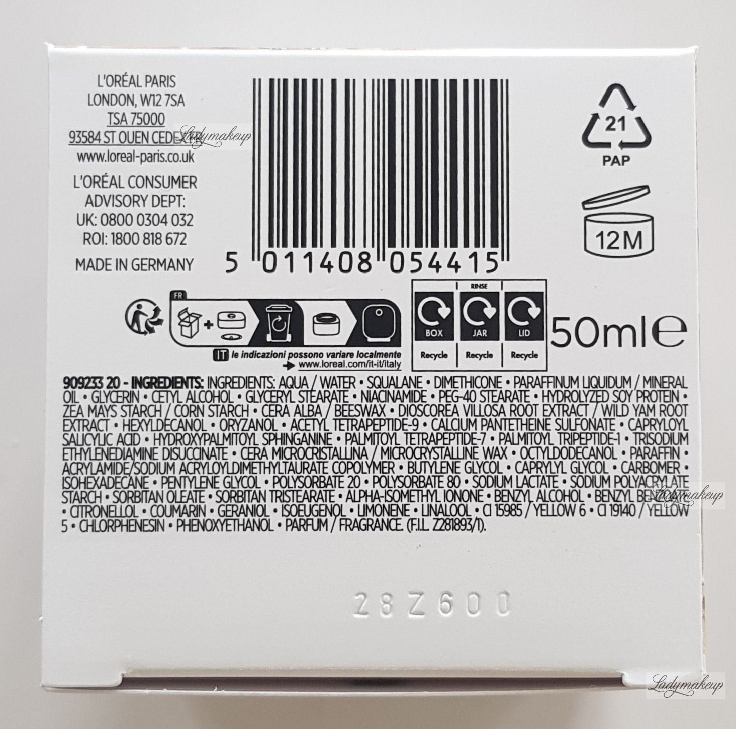 Krem do twarzy na noc. Pochodzi z linii kosmetyków Age Perfect. Został stworzony z myślą o pielęgnacji skóry dojrzałej 50+, która wymaga ujędrnienia, wyrównania kolorytu i głębokiego odżywienia. Posiada aksamitną formułę, która doskonale się wchłania w skórę i pozostawią ja wygładzoną, miękką i bardziej napiętą już po pierwszym zastosowaniu. Krem L'Oréal wzbogacony został o peptydy kolagenowe, które wspomagają odbudowę struktury skóry i poprawiają jej jędrność oraz niacynamid znany ze swoich właściwości rozjaśniających przebarwienia i wyrównujących koloryt cery. Kosmetyk umieszczono w słoiczku o pojemności 50 ml.