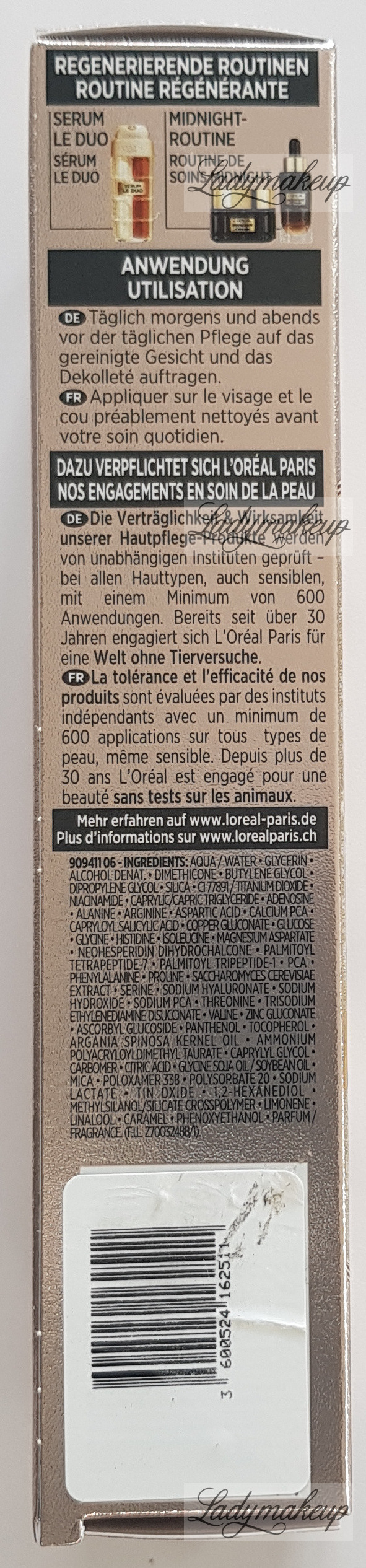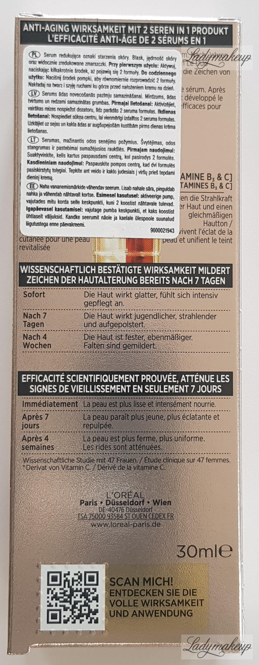 Serum do twarzy, szyi i dekoltu. Stworzone do rannej i wieczornej pielęgnacji skóry każdego rodzaju, a w szczególności skóry dojrzałej. Posiada innowacyjną formułę - dwie oddzielne fazy łączą się dopiero w momencie wyciśnięcia serum z opakowania. Aktywne składniki produktu to: peptydy kolagenowe oraz witaminy B3 i CG, które w połączeniu widocznie wygładzają zmarszczki, wyrównują koloryt naskórka, a także ujędrniają oraz napinają skórę. Dodatkowo kosmetyk dobrze nawilża i długotrwale odżywia sprawiając, że skóra jest wygładzona oraz przyjemnie zmiękczona. L’Oréal serum na zmarszczki dostępne jest w plastikowej butelce o pojemności 30 ml.