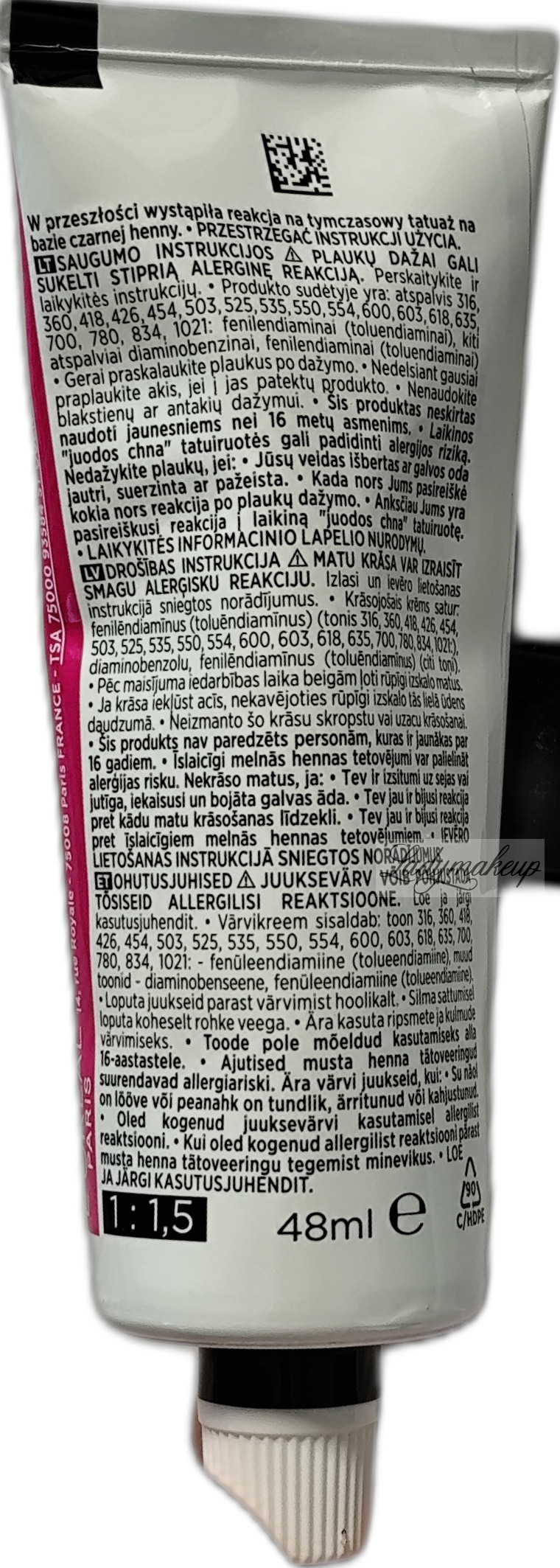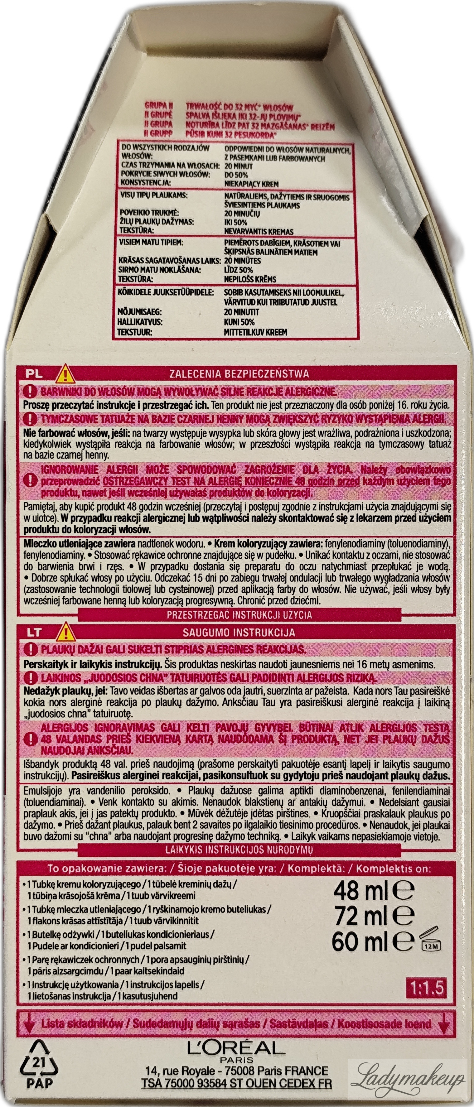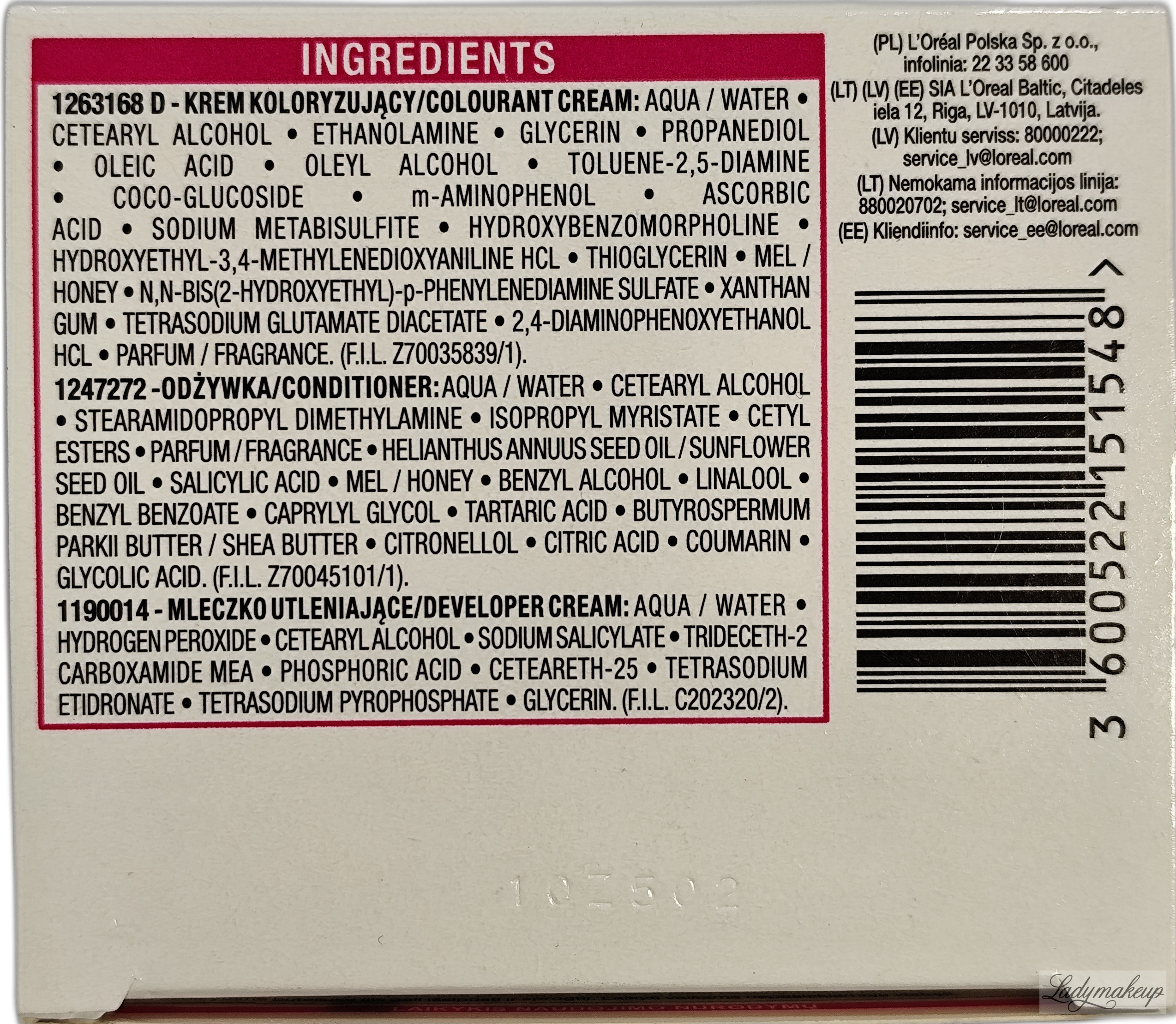 KREM KOLORYZUJĄCY/COLOURANT CREAM: AQUA/WATER (LT) (LV) (EE) SIA L'OREAL BALTIC, CETEARYL ALCOHOL, ETHANOLAMINE, GLYCERIN, PROPANEDIOL, OLEYL ALCOHOL, OLEIC ACID, COCO-GLUCOSIDE, TOLUENE-2,5-DIAMINE, M-AMINOPHENOL, ASCORBIC ACID, SODIUM METABISULFITE, HYDROXYBENZOMORPHOLINE, HYDROXYETHYL-3,4-METHYLENEDIOXYANILINE HCL, THIOGLYCERIN, MEL/HONEY, N,N-BIS(2-HYDROXYETHYL)-P-PHENYLENEDIAMINE SULFATE, XANTHAN GUM, TETRASODIUM GLUTAMATE DIACETATE, 2,4-DIAMINOPHENOXYETHANOL HCL, PARFUM/FRAGRANCE (F.I.L. Z70035839/1)