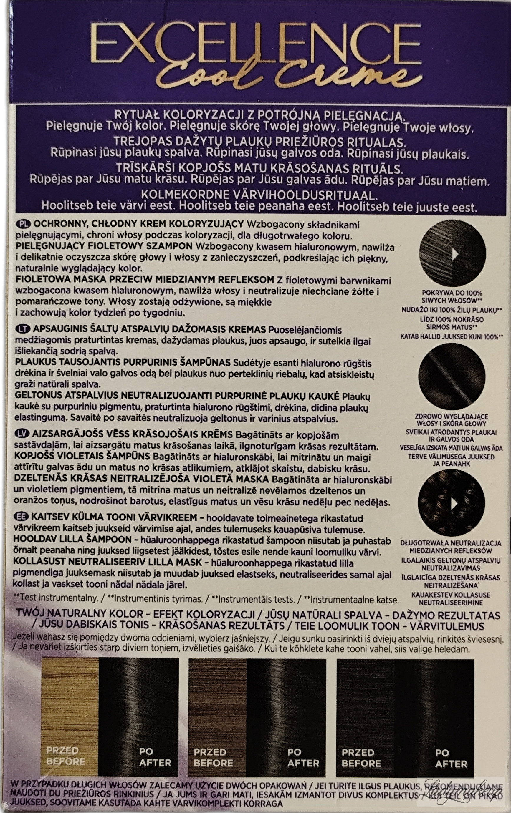 Trwała koloryzacja. Posiada unikalną formułę wzbogaconą w pro keratynę i aktywne serum, zapewniając długotrwały, chłodny kolor i pokrycie do 100% siwych włosów. Dodatkowo dba o naturalny kolor włosów oraz pielęgnuje skórę głowy. Dodatkowo do farby zostały dołączone fioletowy szampon o łagodnym pH, który delikatnie oczyszcza włosy, a także fioletową maska do włosów, zapobiegającą pojawieniu miedzianych, żółtych i pomarańczowych tonów. W skład zestawu wchodzi krem koloryzujący, mleczko utleniające, szampon, maska, para rękawiczek i instrukcja obsługi.Farba dostępna jest w odcieniu ultra popielatego ciemnego brązu.