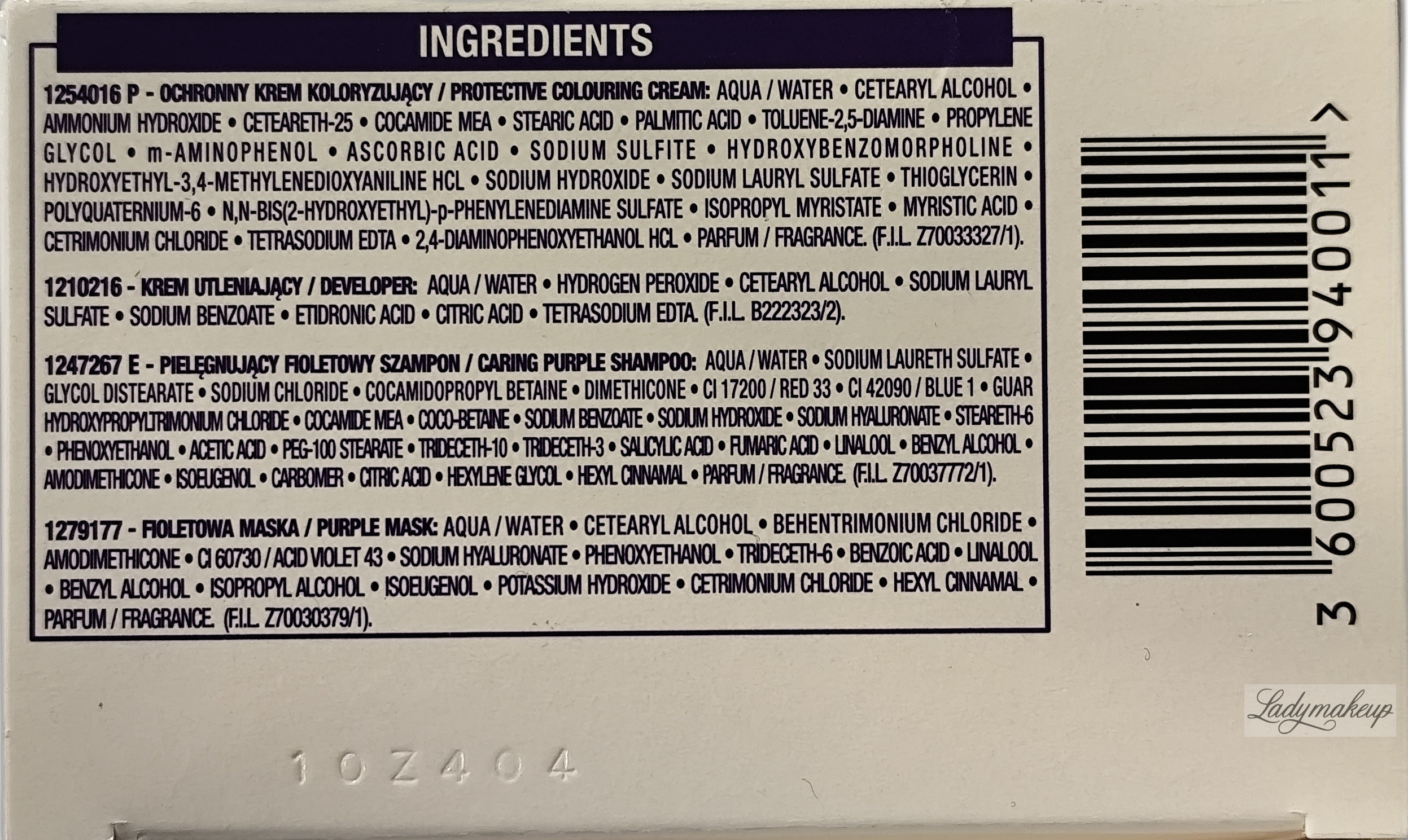 KREM UTLENIAJĄCY/DEVELOPER: AQUA/WATER, HYDROGEN PEROXIDE, CETEARYL ALCOHOL, SODIUM LAURYL SULFATE, SODIUM BENZOATE, ETIDRONIC ACID, CITRIC ACID, TETRASODIUM EDTA (F.I.L. B222323/2)