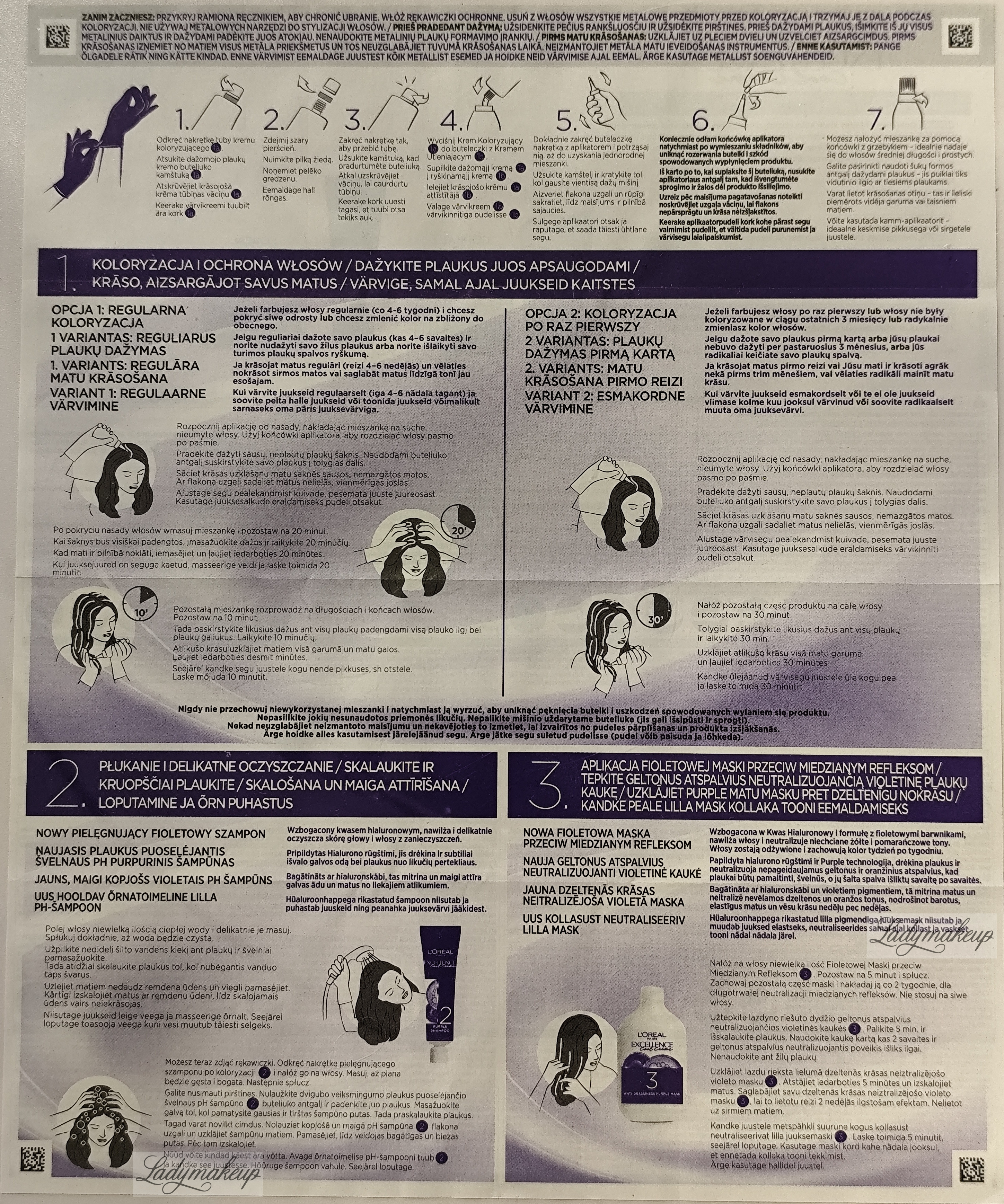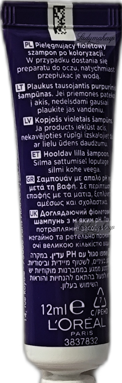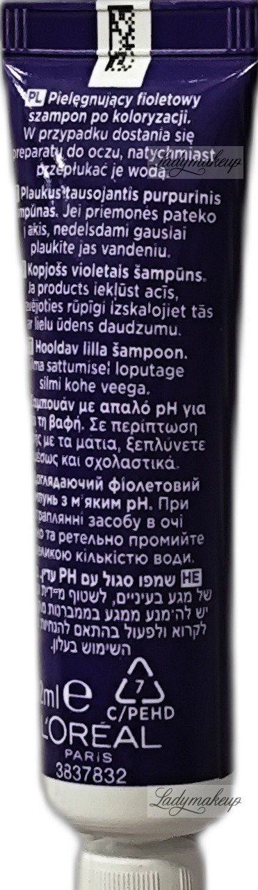PIELĘGNUJĄCY FIOLETOWY SZAMPON/CARING PURPLE SHAMPOO: AQUA/WATER, SODIUM LAURETH SULFATE, GLYCOL DISTEARATE, SODIUM CHLORIDE, COCAMIDOPROPYL BETAINE, DIMETHICONE, CI 17200/RED 33, CI 42090/BLUE 1, GUAR HYDROXYPROPYLTRIMONIUM CHLORIDE, COCAMIDE MEA, COCO-BETAINE, SODIUM BENZOATE, SODIUM HYDROXIDE, SODIUM HYALURONATE, STEARETH-6, PHENOXYETHANOL, ACETIC ACID, PEG-100 STEARATE, TRIDECETH-10, TRIDECETH-3, SALICYLIC ACID, FUMARIC ACID, LINALOOL, BENZYL ALCOHOL, AMODIMETHICONE, ISOEUGENOL, CARBOMER, CITRIC ACID, HEXYLENE GLYCOL, HEXYL CINNAMAL, PARFUM/FRAGRANCE (F.LL Z70037772/1)