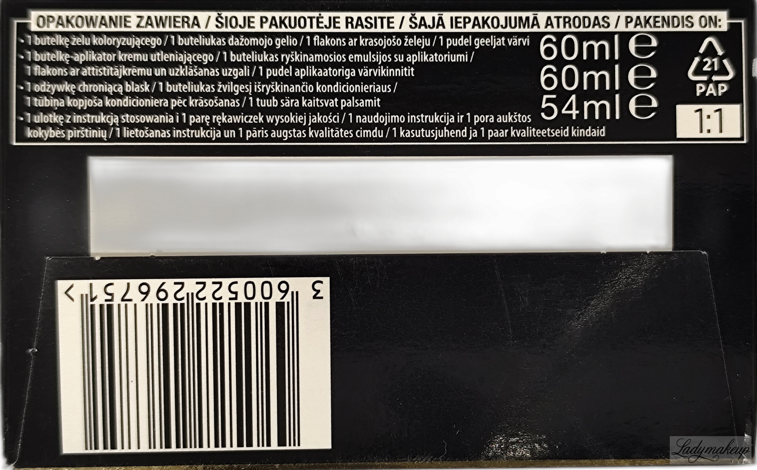 Krem (żel) koloryzujący zawiera: fenylenodiaminy, fenylenodiaminy (toluenodiaminy), rezorcynę, amoniak.