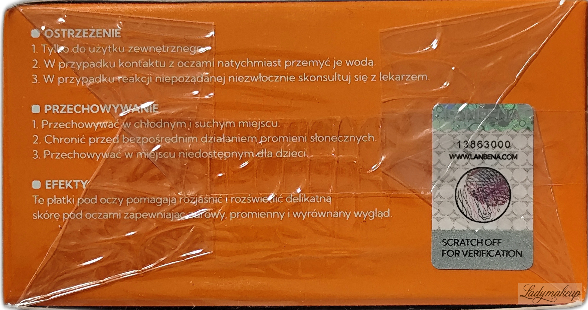 Wykonane zostały ze specjalnego hydrożelowego materiału, który dobrze trzyma się w zaaplikowanym miejscu, przez co ich noszenie jest bardzo komfortowe. Nasączone zostały silnie skoncentrowaną witaminą C, kwasem hialuronowym i niacynamidem. Płatki Lanbena maksymalnie nawilżają delikatną skórę pod oczami, zmniejszają uczucie napięcia i ściągnięcia, a także widocznie rozjaśniają ciemne cienie. Dodatkowo Lanbena płatki mają działanie antyoksydacyjne oraz wyrównują koloryt skóry. W zależności od potrzeb mogą być użyte również na szyi, czole, a nawet brodzie. Zestaw zawiera 60 sztuk płatków, czyli 30 par.