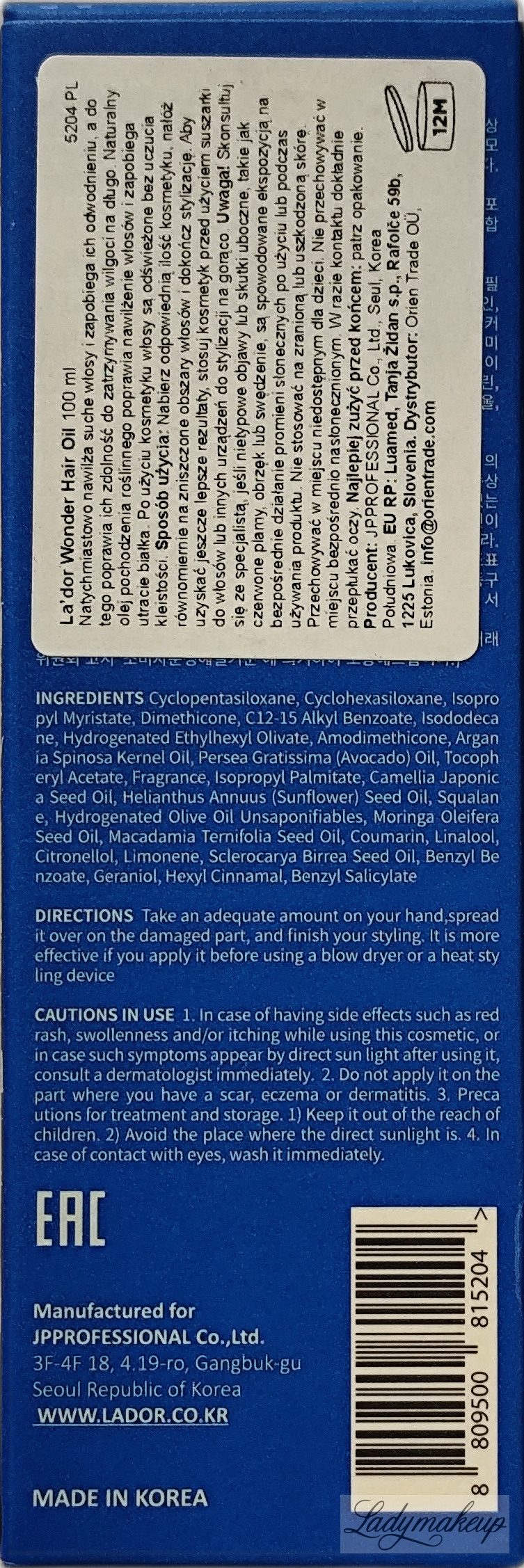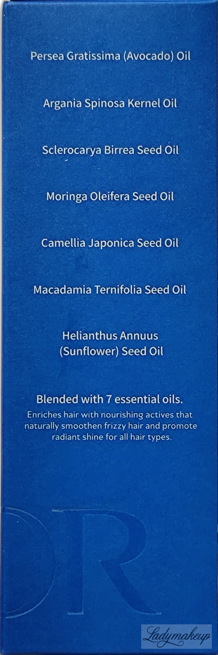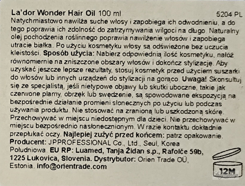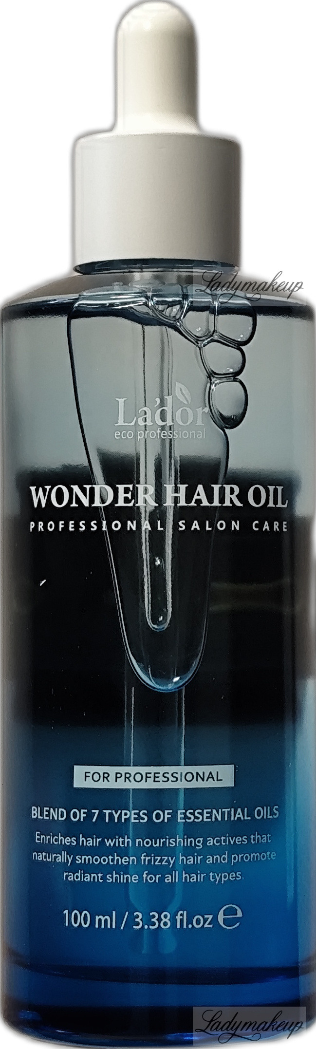Olejek do włosów. Przeznaczony do pielęgnacji pasm suchych oraz odwodnionych. Swoje działanie opiera na specjalnej mieszance 7 dobroczynnych olejków takich jak: awokado, arganowy, marula, moringa, japońska kamelia, makadamia oraz z nasion słonecznika, z dodatkiem skwalanu oraz witaminy E. Olejek La'dor intensywnie nawilża oraz spektakularnie wygładza pasma na całej długości. Dodatkowo poprawia zdolność zatrzymywania wody we włosach, tym samym przeciwdziałając ich przesuszeniu. Kosmetyk skutecznie zapobiega rozdwajaniu się końcówek, przywraca pasmom zdrowy i kuszący blask, a także zmiękcza. La'dor olejek został umieszczony w solidnej szklanej butelce.