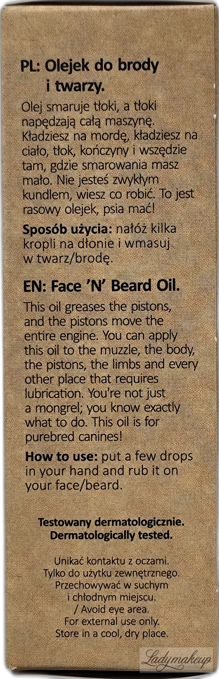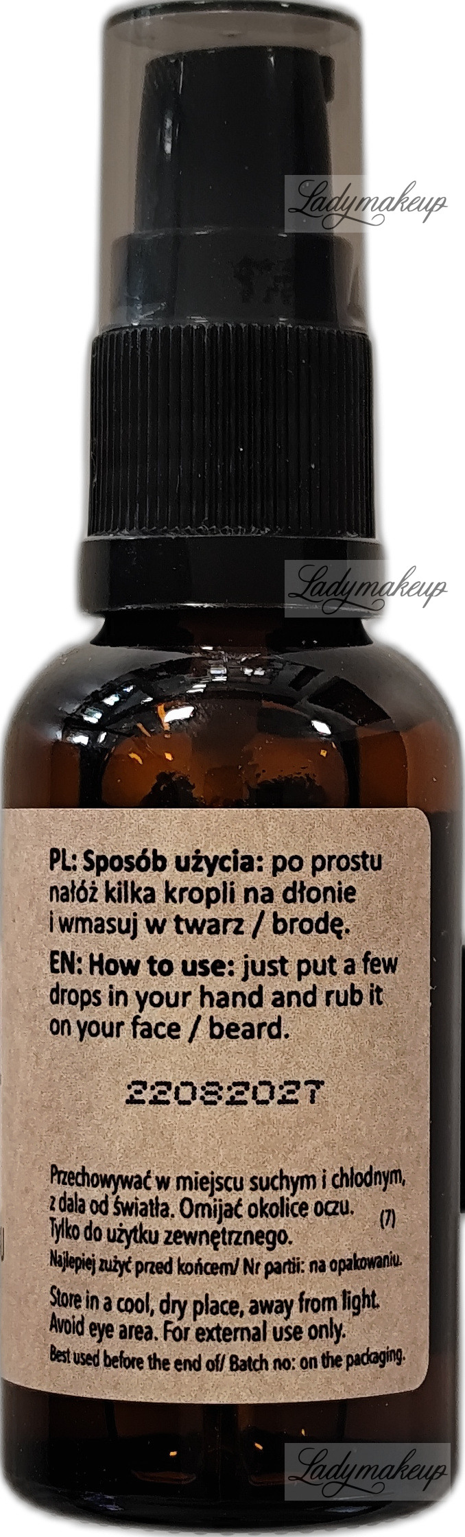 - Olejek do brody. Może być również stosowany zarówno przed, jak i po goleniu. Dobrze nawilża skórę, która często może być narażona na podrażnienia i przesuszenia pod zarostem. Dodatkowo nałożony na włoski, zmiękcza je, wzmacnia, nabłyszcza i pielęgnuje oraz umożliwia sprawne i bezproblemowe modelowanie. Formuła kosmetyku opiera się w 96% na składnikach pochodzenia naturalnego w tym na oleju z pestek arbuza, oleju ze słodkich migdałów, oleju z pestek malin, oleju z konopi siewnych, które skutecznie dbają o stan skóry i włosów. Produkt umieszczono w szklanej buteleczce o pojemności 30 ml.