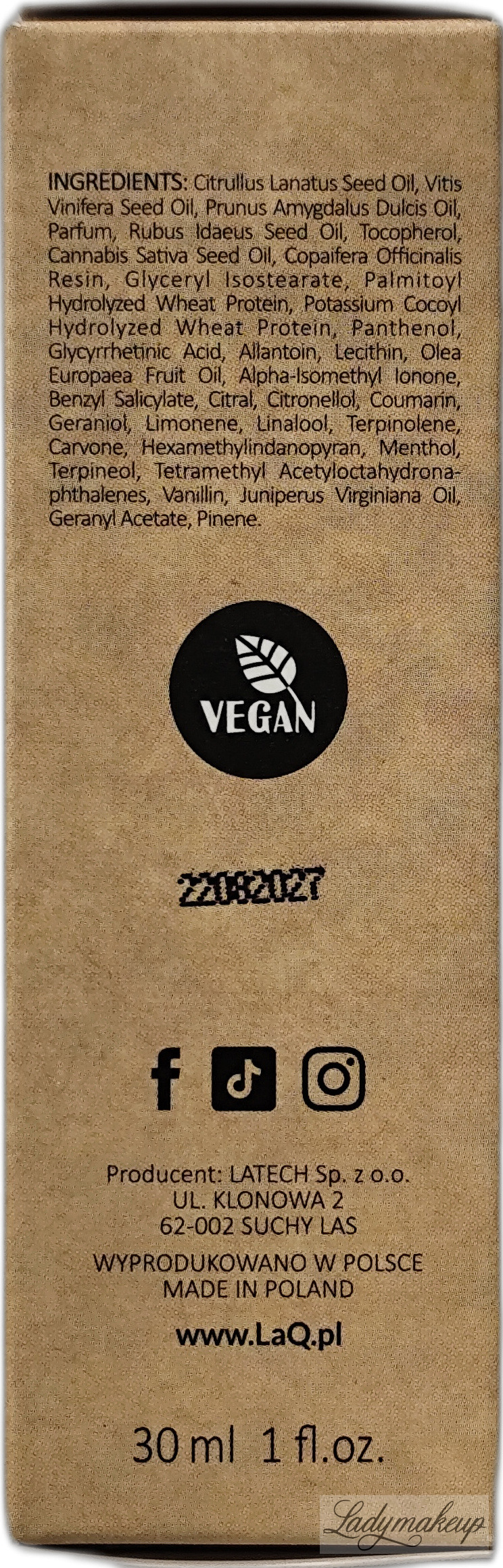 CITRULLUS LANATUS SEED OIL, VITIS VINIFERA SEED OIL, PRUNUS AMYGDALUS DULCIS OIL, PARFUM, RUBUS IDAEUS SEED OIL, TOCOPHEROL, CANNABIS SATIVA SEED OIL, COPAIFERA OFFICINALIS RESIN, GLYCERYL ISOSTEARATE, PALMITOYL HYDROLYZED WHEAT PROTEIN, POTASSIUM COCOYL HYDROLYZED WHEAT PROTEIN, PANTHENOL, GLYCYRRHETINIC ACID, ALLANTOIN, LECITHIN, OLEA EUROPAEA FRUIT OIL, ALPHA-ISOMETHYL IONONE, BENZYL SALICYLATE, CITRAL, CITRONELLOL, COUMARIN, GERANIOL, LIMONENE, LINALOOL, TERPINOLENE, CARVONE, HEXAMETHYLINDANOPYRAN, MENTHOL, TERPINEOL, TETRAMETHYL ACETYLOCTAHYDRONAPHTHALENES, VANILLIN, JUNIPERUS VIRGINIANA OIL, GERANYL ACETATE, PINENE