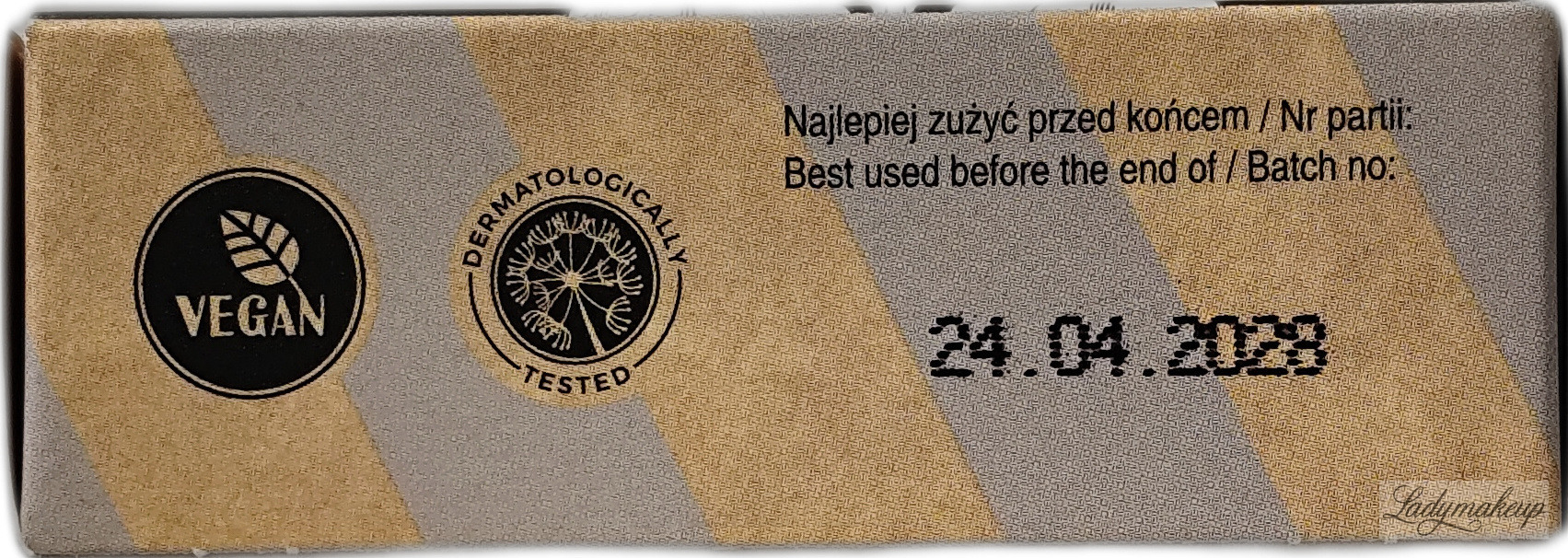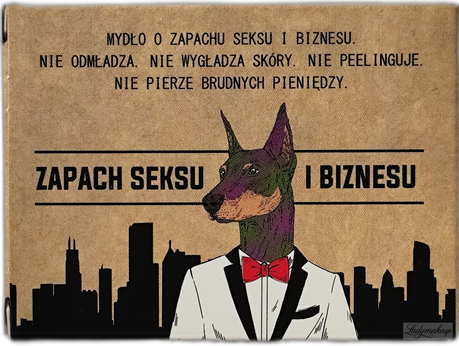 - Mydło w kostce. Skutecznie myje i oczyszcza skórę. Zawiera w składzie trzy odżywcze masła: shea, kakaowe i mango, które wykazują właściwości nawilżające, regenerujące oraz łagodzące podrażnienia. Dodatkowo wegańska formuła natłuszcza, wygładza i regeneruje naskórek. Mydło umieszczono w ekologicznym, papierowym opakowaniu z grafiką przedstawiająca Dobermana i z zabawnym tekstem opisującym kosmetyk.